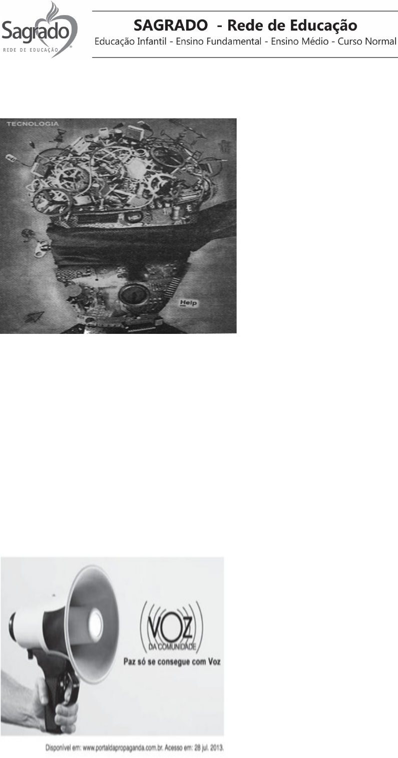 QUESTÕES - ENEM Questão 1 O que a internet esconde e você Sites de busca manipulam resultados. Redes sociais decidem quem vai ser seu amigo – e descartam as pessoas sem avisar. E, para cada site que você pode acessar, há 400 outros invisíveis, Prepare-se para conhecer o lado oculto da internet. Analisando-se as informações verbais e a imagem associada a uma cabeça humana, compreende-se que a venda A - representa a amplitude de informações que compõem a internet, às quais temos acesso em redes sociais e sites de busca. B -faz uma denúncia quanto às informações que são omitidas dos usuários da rede, sendo empregada no sentido conotativo. C- diz respeito a um buraco negro digital, onde estão escondidas as informações buscadas pelo usuário nos sites que acessa. D -está associada a um conjunto de restrições sociais presentes na vida daqueles que estão sempre conectados à internet. E- remete às bases de dados da web, protegidas por senhas ou assinaturas e às quais o navegador não tem acesso. Questão 2 Essa propaganda defende a transformação social e a diminuição da violência por meio da palavra. Isso se evidencia pela A) predominância de tons claros na composição da peça publicitária. B) associação entre uma arma de fogo e um megafone. C) grafia com inicial maiúscula da palavra “voz” no slogan. D) imagem de uma mão segurando um megafone. E) representação gráfica da propagação do som. Questão 3 Os signos visuais, como meios de comunicação, são classificados em categorias de acordo com seus significados. A categoria denominada indício corresponde aos signos visuais que têm origem em formas ou situações naturais ou casuais, as quais, devido à ocorrência em circunstâncias idênticas, muitas vezes repetidas, indicam algo e adquirem significado. Por exemplo, nuvens negras indicam tempestade. Com base nesse conceito, escolha a opção que representa um signo da categoria dos indícios Questão 4 O 3° quadrinho sugere que Garfield: a) desconhece tudo sobre arte, por isso faz a sugestão. b) que todo pintor deve fazer algo diferente. c) defende que para ser pintor a pessoa tem de sofrer. d) conhece a história de um pintor famoso e faz uso da ironia. e) acredita que seu dono tenha tendência artística e, por isso, faz a sugestão. Questão 5 O problema enfrentado pelo migrante e o sentido da expressão “sustança” expressos nos quadrinhos, podem ser, respectivamente, relacionados a (A) rejeição / alimentos básicos. (B) discriminação / força de trabalho. (C) falta de compreensão / matérias-primas. (D) preconceito / vestuário. (E) legitimidade / sobrevivência. Questão 6 “(….) Que importa que uns falem mole descansado Que os cariocas arranhem os erres na garganta Que os capixabas eparoaras escancarem as vogais? Que tem se os quinhentos réis meridional Vira cinco tostões do Rio pro Norte? Junto formamos este assombro de misérias e grandezas, Brasil, nome de vegetal! (….)” (Mário de Andrade. Poesias completas. 6. ed. São Paulo: Martins Editora, 1980.) O texto poético ora reproduzido trata das diferenças brasileiras no âmbito (A) étnico e religioso. (B) linguístico e econômico. (C) racial e folclórico. (D) histórico e geográfico. (E) literário e popular. Questão 7 Em que alternativa a sentença está de acordo com a norma culta quanto à concordância? a) Para a inscrição será solicitada duas cópias do boleto de reconhecimento da taxa. b) Como ingresso será cobrado dois quilos de alimentos não perecível. c) Existe outros motivos mais sérios para sua ausência. d) Seríamos mais felizes neste país se não houvessem tantas disparidades sociais. e) Isso cabe aos monitores. Deixe-os recolher os textos. Questão 8 Futebol: “A rebeldia é que muda o mundo” Conheça a história de Afonsinho, o primeiro jogador do futebol brasileiro a derrotar a cartolagem e a conquistar o Passe Livre, há exatos 40 anos. Pelé estava se aposentando pra valer pela primeira vez, então com a camisa do Santos (porque depois voltaria a atuar pelo New York Cosmos, dos Estados Unidos), em 1972, quando foi questionado se, finalmente, sentia-se um homem livre. O Rei respondeu sem titubear: — Homem livre no futebol só conheço um: o Afonsinho. Este sim pode dizer, usando as suas palavras, que deu o grito de independência ou morte. Ninguém mais. O resto é conversa. Apesar de suas declarações serem motivo de chacotapor parte da mídia futebolística e até dos torcedores brasileiros, o Atleta do Século acertou. E provavelmente acertaria novamente hoje. Pela admiração por um de seus colegas de clube daquele ano. Pelo reconhecimento do caráter e personalidade de um dos jogadores mais contestadores do futebol nacional. E principalmente em razão da história de luta – e vitória – de Afonsinho sobre os cartolas. ANDREUCCI, R. Disponível em: http://carosamigos.terra.com.br. Acesso em: 19 ago 2011. O autor utiliza marcas linguísticas que dão ao texto um caráter informal. Uma dessas marcas é identificada em: A) “[...] o Atleta do Século acertou.” B) “O Rei respondeu sem titubear [...]”. C) “E provavelmente acertaria novamente hoje.” D) “Pelé estava se aposentando pra valer pela primeira vez [...]”. E) “Pela admiração por um de seus colegas de clube daquele ano.” Questão 9 O humor da tira decorre da reação de uma das cobras com relação ao uso de pronome pessoal reto, em vez de pronome oblíquo. De acordo com a norma-padrão da língua, esse uso é inadequado, pois a) contraria o uso previsto para o registro oral da língua. b)contraria a marcação das funções sintáticas de sujeito e objeto. VERÍSSIMO, L. F. As cobras em: Se Deus existe que eu seja atingido por um raio. Porto Alegre: L&PM, 1997. (Foto: Reprodução/Enem c)gera inadequação na concordância com o verbo. d)gera ambiguidade na leitura do texto. e) apresenta dupla marcação de sujeito. Questão 10 Só há uma sa