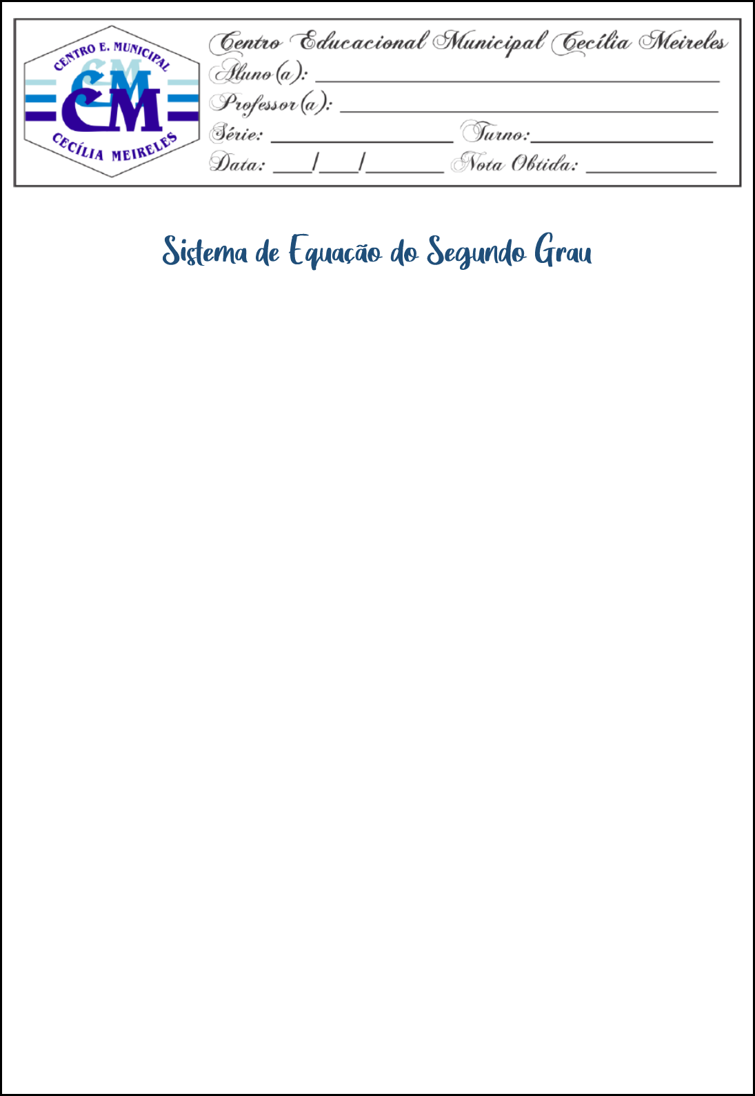 ATIVIDADE DE MATEMÁTICA PRÓ SÔNIA - 9º ano III TRIMESTRE QUESTÃO 1: Resolva os seguintes sistemas de equações do segundo grau. a) { 𝑥 + 𝑦 = 8 𝑥2 + 𝑦2 = 34 b) { 𝑥 + 𝑦 = 9 𝑥𝑦 = 14 QUESTÃO 2: Resolva os seguintes problemas: a) A soma de dois números é 15, e o produto entre eles é igual a 56. Quais são esses números? b) A soma de dois números é 9, e o produto entre eles é igual a 14. Quais são esses números? c) A diferença entre as idades de Pedro e Joana é 5 anos, e o seu produto é 84. Qual idade de cada um? ATENÇAÕ: Todos os trabalhos propostos neste trimestre serão avaliados. Fazer de forma legível os exercícios e em seguida enviar para a pró Sônia através do WhatsApp ou Google ClassRoom. BOM TRABALHO!