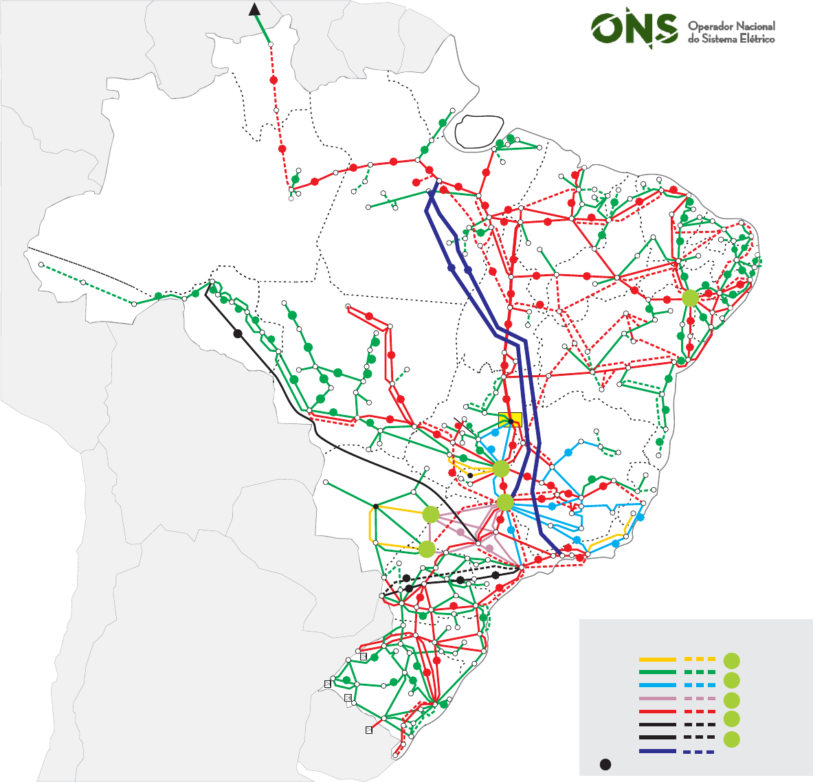Peru Argentina Bolivia Uruguai Chile Paraguai Colômbia Fortaleza Teresina S.Luís Natal João Pessoa Recife Maceió Aracaju Salvador Curitiba Florianópolis Rivera 70 MW Uruguaiana 50 MW Garabi 2000 MW Cuiabá Manaus C.Grande Itaipu Vitória R.Janeiro São Paulo P.Alegre Goiânia Guiana Francesa Venezuela Guiana Suriname B.Horizonte Rio Branco Legenda Número de circuitos existentesN A 3 3 3 4 2 5 2 2 2 4 2 8 2 2 2 2 2 2 2 2 2 2 2 26 2 3 2 2 2 2 32 22 2 2 2 2 2 2 2 3 3 2 3 2 3 2 2 2 2 2 22 2 2 2 2 2 2 2 2 2 2 2 2 2 33 3 3 3 3 3 2 4 2 2 2 2 2 2 2 4 3 3 2 4 3 2 2 2 3 3 3 2 2 2 7 D 2 32 2 2 2 2 2 2 2 2 B 4 22 2 2 2 2 2 2 2 2 2 2 2 Melo 500 MW 2 3 2 2 Brasília A B C D E Existente Futuro Complexo Paraná Paranapanema Grande Paranaíba Paulo Afonso 138 kV 230 kV 345 kV 440 kV 500 kV 750 kV 600 kV cc 800 kV cc+- +- Boa Vista Macapá Belém Porto Velho Palmas 2 2 C E 5 2 Tucuruí 2 Página 1
