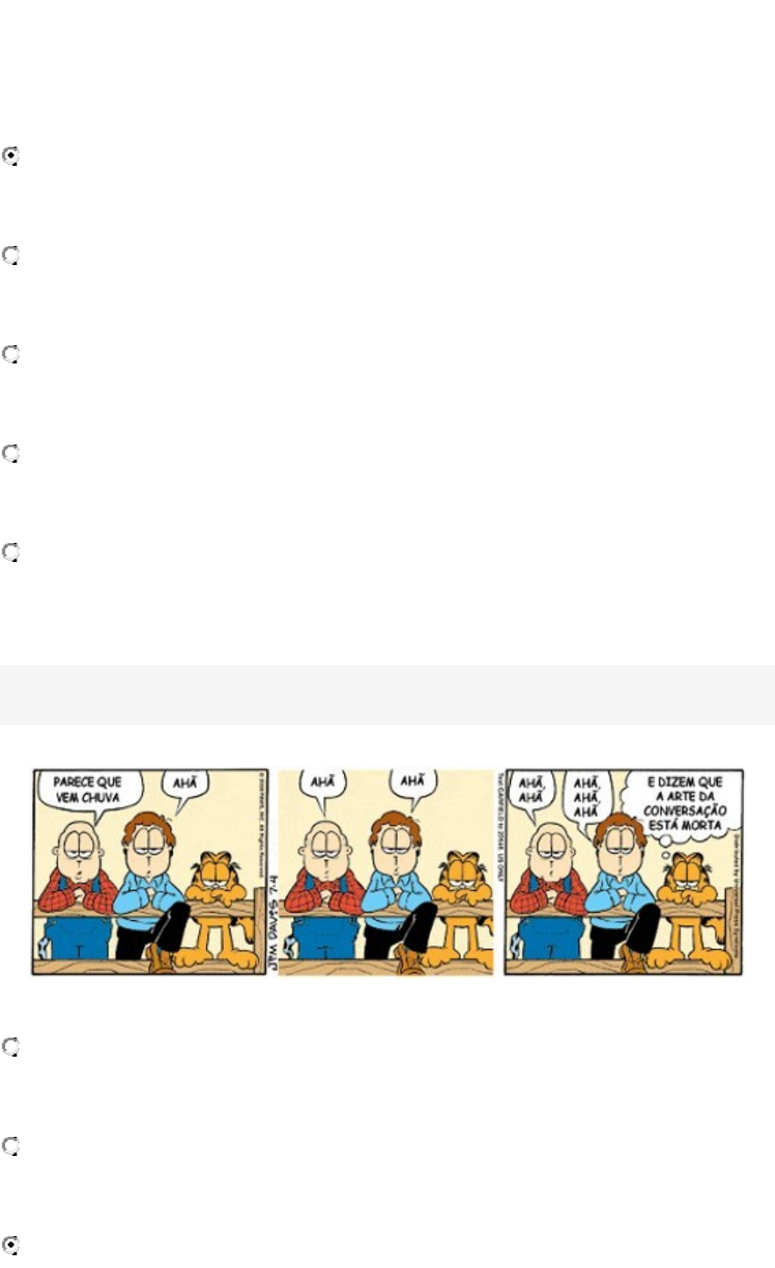 A linguagem é uma forma de expressão que empregamos para diversas finalidades. Sendo assim, existem as chamadas funções da linguagem, que são de grande importância ao alcance da finalidade comunicativa. A respeito deste assunto, assinale a afirmativa que apresenta um exemplo de função fática. “Alô! Está me ouvindo?” “Que bom que você veio!” “Hoje, choverá pela parte da tarde na região sul do Brasil.” “Não perca tempo! Compre logo um IPhone 10!” “Nossa! Como você está mais elegante!” Pergunta 2 1,5 / 1,5 pts Reconheça, no texto a seguir, a função da linguagem empregada: http://portugues.uol.com.br/upload/conteudo/images/funcao-fatica-nos-quadrinhos.jpg Função conativa. Função emotiva. Função fática. Função poética. Função referencial. Pergunta 3 1,5 / 1,5 pts UFMT 1996 - Modificada Tem dias que a gente se sente Como quem partiu ou morreu. A gente estancou de repente Ou foi o mundo, então, que cresceu. (Roda Viva - Chico Buarque) Nas orações a seguir julgue os itens e escreva nos parênteses (V) se for verdadeiro ou (F) se for falso. ( ) A modalidade oral e o registro coloquial, ao serem utilizados na letra da música, trazem desvalorização da linguagem. ( ) A expressão "a gente" é uma forma característica da linguagem coloquial para substituir o pronome "nós". ( ) O uso do verbo "ter" em lugar de "haver" e a supressão da preposição "em" junto ao relativo são marcas da oralidade no texto. ( ) A linguagem utilizada é peculiar a pessoas simples, que possivelmente não tiveram acesso a uma educação que preza a beleza da língua padrão culta. A sequência correta de suas respostas é: F- F - V - F V - F - V - F F - V - V - F F - V - F - V V - F - F - V Pergunta 4 1,5 / 1,5 pts Em todas as alternativas há marcas de oralidade, isto é, expressões típicas da linguagem falada, exceto: As variações da língua de ordem geográfica são chamadas de regionalismos. “Engraçadinho de uma figa! Como você se chama?” “Diz que um chega, logo dão terra pra ele cultivar... É lavoura de café...” Se você ficar olhando pra ela feito bobo, a manga cai em cima de sua cabeça. “Peraí, mãe. Acho que tô a ponto de desmaiar.” Pergunta 5 1,5 / 1,5 pts Para a linguista Ingedore Koch (1922) texto é: [...] uma manifestação verbal, constituída de elementos linguísticos intencionalmente selecionados e ordenados em sequência, durante a atividade verbal, de modo a permitir aos parceiros, na interação, não apenas a depressão de conteúdos semânticos, em decorrência da ativação de processos e estratégias de ordem cognitiva, como também a interação (ou atuação) de acordo com práticas socioculturais (KOCH, 1992, p.22). Se o texto produz sentido, ele promove interação e expressa a capacidade linguística do redator, sendo assim o texto compreende 5 fatores que compõem o contexto da sua elaboração, são eles: situacionalidade, intencionalidade, informatividade, aceitabilidade e intertextualidade. Além disso o texto também apresenta uma estrutura peculiar que o diferencia dos demais, um formato específico que pode ser definido em narrativo, descritivo, argumentativo, dissertativo, injuntivo ou informativo. Essas características fazem parte da microestrutura textual, elas compõem a estrutura interna do texto que é abarcada por um gênero. Com base no excerto acima, qual das alternativas melhor define o gênero textual da figura abaixo? Artigo científico. Notícia. Feedback: Notícia - como o próprio nome já indica, a notícia tem como objetivo noticiar, contar um fato novo que interessa ao público em geral. As notícias estão mais presentes em jornais televisivos e impressos, não podendo conter opiniões e avaliações de quem a comunica. Resenha. Manchete. E-mail. Pergunta 6 1,5 / 1,5 pts Ao longo da Unidade 2, estudamos as diferenças entre tipo e gênero textual. Sendo assim, vimos que existem textos como o Artigo de Opinião, bastante comum nas colunas de opinião de jornais e revistas impressas ou em formato virtual. A respeito dessa modalidade textual, assinale a afirmativa correta. O artigo de opinião é um gênero textual, uma vez que é elaborado para atender a uma finalidade comunicativa. O artigo de opinião é o mesmo que o texto descritivo, apresentando estruturas que os definem enquanto tipo textual. Assim como o texto injuntivo, o artigo de opinião é um gênero textual. Este gênero é bastante utilizado na comunicação dentro das empresas a fim de trazer mensagens informativas. Considerado um tipo textual, o artigo de opinião prescinde de argumentos. Pergunta 7 1,5 / 1,5 pts Leia o excerto a seguir: "Com o surgimento da sociedade moderna, cuja economia está vinculada à divisão do trabalho e à produção em massa, o homem se vê enfrentando uma diferenciação de classe social cada vez mais crescente e, diante de seus olhos, surgem as distinções de remuneração, de poder e de estilos de vida. Solidificam-se, então, os geradores de desigualdade social. E, em países onde a desigualdade é menor, nota-se que as chances de acesso a uma educação de qualidade também são superiores." (NONATO, Gleides) Classifique-o quanto ao tipo: Descritivo-narrativo Argumentativo-descritivo Dissertativo- argumentativo Injuntivo-narrativo Narrativo-descritivo Pergunta 8 1,5 / 1,5 pts Preste atenção ao seguinte trecho:“A maioria dos leitores tem noção do que seja um parágrafo e grande parte dos redatores percebe, ao escrever um texto, o momento exato em que deve iniciar um novo parágrafo. Mesmo assim, uma reflexão sobre a organização do parágrafo pode ser muito útil para melhorar a competência na escrita.” (GOLDSTEIN; LOUZADA; IVAMOTO, 2009, p. 31) Fonte: GOLDSTEIN, Norma; LOUZADA, Maria Silvia; IVAMOTO, Regina. O texto sem mistério: leitura e escrita na universidade. São Paulo: Ática, 2009. O fragmento apresentado explora a disposição e estrutura do parágrafo. A respeito d