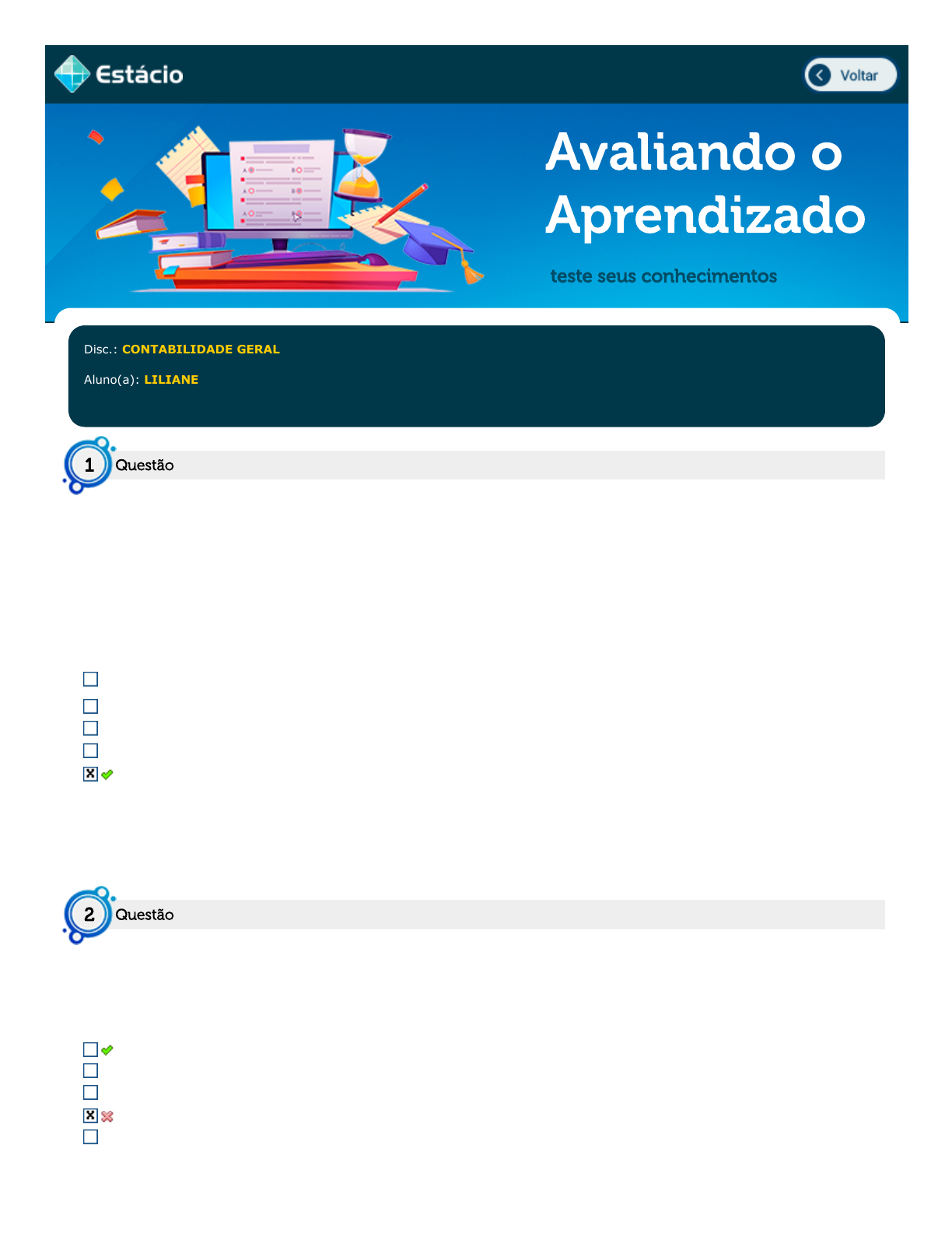 14/11/2021 14:09 Estácio: Alunos https://simulado.estacio.br/alunos/ 1/3 Avaliando o Aprendizado teste seus conhecimentos Disc.: CONTABILIDADE GERAL Aluno(a): LILIANE NUNES ESTEVES Matríc.: 202102528666 Acertos: 0,2 de 0,5 14/11/2021 (Finaliz.) Acerto: 0,1 / 0,1 A contabilidade, do ponto de vista acadêmico, pode ser considerada a ciência que estuda os eventos relacionados a uma entidade. Estes eventos, conhecidos como fatos contábeis, são decorrentes de alterações econômicas e financeira que ocorrem nos bens, nos direitos, nas obrigações e no capital investido pelos sócios de uma entidade. Com base no texto e nas normas brasileira de contabilidade é correto afirmar que o objeto de estudo da contabilidade é: são os bens das empresas onde a entidade investe. são os contratos da empresa. a riqueza dos proprietários da empresa. é o ato administrativo relacionado à entidade é o patrimônio da entidade. Respondido em 14/11/2021 12:58:40 Compare com a sua resposta: Acerto: 0,0 / 0,1 Observemos os seguinte fato contábil: pagamento, mediante a emissão de cheque, de uma duplicata antes do vencimento, obtendo-se um desconto financeiro, por essa razão. Para que o registro contábil desse fato seja feito em um único lançamento, deve-se utilizar a segunda fórmula, com 1 conta devedora e 2 contas credoras. terceira fórmula, com 3 contas devedoras e 1 conta credora. quarta fórmula, com 2 contas devedoras e 2 contas credoras. terceira fórmula, com 2 contas devedoras e 1 conta credora. primeira fórmula, com 1 conta devedora e 1 conta credora. Respondido em 14/11/2021 12:49:12 Questão1 Questão2 https://simulado.estacio.br/alunos/inicio.asp javascript:voltar(); 14/11/2021 14:09 Estácio: Alunos https://simulado.estacio.br/alunos/ 2/3 Compare com a sua resposta: Acerto: 0,0 / 0,1 No período de 2020, a empresa MBL S.A. adquiriu e colocou em uso uma máquina com vida útil prevista de 3 anos. A empresa pagou pela máquina o valor de R$ 16.000,00 onde a mesma apresenta como valor residual estimado R$ 1.000,00. Calcule o valor da depreciação anual da máquina com base no método da linha reta e assinale a opção correta. 1.000,00 5.000,00 15.000,00 5.333,33 6.000,00 Respondido em 14/11/2021 12:50:14 Compare com a sua resposta: Acerto: 0,0 / 0,1 Uma empresa de suplemento para hospitais, a Desinfetante Tudo Bom LTDA, que apresentava em seu estoque 100 caixa de álcool em gel, ao custo de R$ 500 reais cada, efetuou as seguintes operações, num determinado período: - Comprou mais 400 caixas no valor de R$ 600 reais, cada. - Vendeu 150 caixas por R$ 1.000, cada. Tendo por base os dados apresentados, analise as afirmativas abaixo. 1 - O CMV pelo método do custo médio é de R$ 80.000. 2 - O lucro bruto pelo método PEPS é de R$ 70.000. 3 - O estoque final pelo método do custo médio é de R$ 203.000. 4 - O lucro bruto pelo método do custo médio é de R$ 70.000. A respeito dessas afirmativas, assinale a resposta correta. Apenas as alternativas 2 e 4 são verdadeiras. Apenas as alternativas 3 e 4 são verdadeiras. Apenas as alternativas 1 e 2 são verdadeiras. Apenas as alternativas 1 e 4 são verdadeiras. Apenas as alternativas 2 e 3 são verdadeiras. Respondido em 14/11/2021 12:50:59 Compare com a sua resposta: Acerto: 0,1 / 0,1 Determinada empresa adquiriu em 2020, mercadorias para revenda no total de R$ 4 milhões. Durante o período, a receita de vendas alcançou R$ 7 milhões. Sabendo-se que o estoque final era de R$ 300 mil; o estoque inicial de R$ 200 mil e, no período, registraram-se devoluções de compra de R$ 100 mil e devoluções de vendas de R$ 250 mil, pode-se afirmar que o custo de mercadorias vendidas e o valor das mercadorias disponíveis para venda foram de: R$ 2.950.000 e R$ 3.250.000 Questão3 Questão4 Questão5 14/11/2021 14:09 Estácio: Alunos https://simulado.estacio.br/alunos/ 3/3 R$ 3.900.000 e R$ 4.200.000 R$ 3.800.000 e R$ 4.100.000 R$ 3.100.000 e R$ 3.400.000 R$ 3.800.000 e R$ 3.900.000 Respondido em 14/11/2021 12:55:54 Compare com a sua resposta: javascript:abre_colabore('36975','272299551','4996182506');