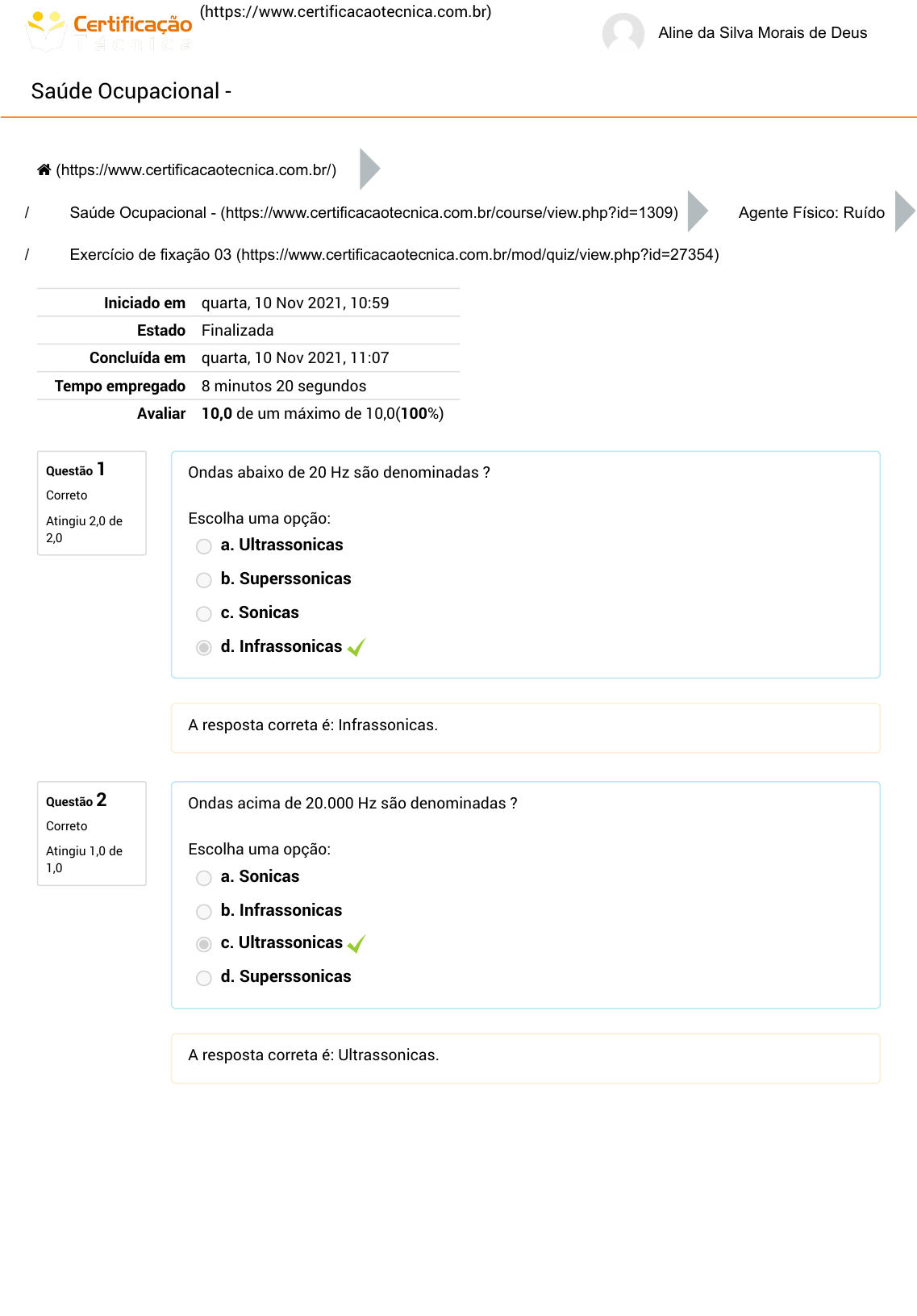 (https://www.certificacaotecnica.com.br) Aline da Silva Morais de Deus Saúde Ocupacional - Questão 1 Correto Atingiu 2,0 de 2,0 Questão 2 Correto Atingiu 1,0 de 1,0 / / / Iniciado em quarta, 10 Nov 2021, 10:59 Estado Finalizada Concluída em quarta, 10 Nov 2021, 11:07 Tempo empregado 8 minutos 20 segundos Avaliar 10,0 de um máximo de 10,0(100%) Ondas abaixo de 20 Hz são denominadas ? Escolha uma opção: a. Ultrassonicas b. Superssonicas c. Sonicas d. Infrassonicas A resposta correta é: Infrassonicas. Ondas acima de 20.000 Hz são denominadas ? Escolha uma opção: a. Sonicas b. Infrassonicas c. Ultrassonicas d. Superssonicas A resposta correta é: Ultrassonicas. (https://www.certificacaotecnica.com.br/) Saúde Ocupacional - (https://www.certificacaotecnica.com.br/course/view.php?id=1309) Agente Físico: Ruído Exercício de fixação 03 (https://www.certificacaotecnica.com.br/mod/quiz/view.php?id=27354) https://www.certificacaotecnica.com.br/ https://www.certificacaotecnica.com.br/ https://www.certificacaotecnica.com.br/course/view.php?id=1309 https://www.certificacaotecnica.com.br/mod/quiz/view.php?id=27354 Questão 3 Correto Atingiu 1,0 de 1,0 Questão 4 Correto Atingiu 1,0 de 1,0 Questão 5 Correto Atingiu 2,0 de 2,0 Para uma jornada de trabalho de 8 horas diárias, qual o maximo de ruido limite é permtido ? Escolha uma opção: a. 80dB b. 65dB c. 95dB d. 50dB A resposta correta é: 80dB. O trabalhador, estando exposto a um ruido com nivel aferido em 92 dB, podera ficar exposto ao ruido diario de forma permitida por ? Escolha uma ou mais: a. 2 horas b. 1 hora c. 4 horas d. 3 horas A resposta correta é: 3 horas. Qual complicação é decorrente da perfuração do tímpano ou da desarticulação dos ossículos do ouvido médio, em virtude de grandes pressões sonoras ? Escolha uma opção: a. Trauma Acustico b. Nenhuma das respostas anteriores c. Surdez Permanente d. Surdez Temporaria A resposta correta é: Trauma Acustico. Questão 6 Correto Atingiu 1,0 de 1,0 Questão 7 Correto Atingiu 2,0 de 2,0 As ondas sonoras estão perceptíveis pelo ouvido humano em qual faixa ? Escolha uma opção: a. de 10 Hz a 15.000 Hz b. de 25 Hz a 25.000 Hz c. de 5 Hz a 10.000 Hz d. de 20 Hz a 20.000 Hz A resposta correta é: de 20 Hz a 20.000 Hz. É a exposição excessiva e contínua a ruídos intensos. É irreversível, pois há a lesão de estruturas do ouvido interno. Escolha uma opção: a. Trauma Acustico b. Surdez Permanente c. Nenhuma das respostas anteriores d. Surdez Temporaria A resposta correta é: Surdez Permanente.