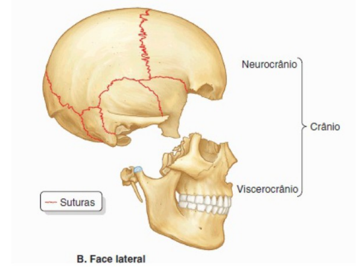 CABEÇA É divido em neurocrânio (ossos do crânio) e vsicerocrânio (ossos da face) 1. Neurocrânio Ele possui um teto chamado de calvária e uma base chamada de base do crânio. · A calvária é formada majoritariamente por ossos planos (frontal, parietal e temporal) que se unem pelas suturas. · A base do crânio é formada por maioria de ossos irregulares e com grandes ossos planos (esfenoide e occipital). O etmoide faz parte de uma pequena parte mediana do neurocrânio mas está mais presente no viscerocrânio. 1. Viscerocrânio Compreende majoritariamente ossos da face que se desenvolvem no mesenquima dos arcos faríngeos embrionários. Ele é formado por 15 ossos irregulares · 3 ossos ímpares situados centralizados ou situados na linha mediana (mandíbula, etmoide e vômer) · 6 ossos pares bilaterais (maxilas, conchas nasais inferiores, sigmoides, palatinos, ossos nasais e ossos lacrimais. As maxilas correspondem a maior parte do esqueleto facial superior, formando o esqueleto da arcada dentária superior. A mandíbula forma o osso da arcada dentária inferior. OBS: Vários ossos do crânio são pneumáticos: frontal, temporal, esfenoide e etmoide Plano orbitomeático: posição anatômica do crânio, a margem inferior da órbita e a margem superior do poro acústico externo do meato acústico externo de ambos os lado estão no mesmo plano horizontal. Vista frontal do crânio Formada pelos ossos frontal, zigomático, órbitas, região nasal, maxila e mandíbula. · O frontal, especificamente sua escama (parte plana), forma o esqueleto da fronte, articulando-se na porção inferior com o osso nasal e o zigomático. A interseção dos ossos frontal e nasal é o násio que, na maioria das pessoas, está relacionada a uma área visivelmente deprimida (ponte do nariz). O násio é um dos muitos pontos craniométricos radiológicos usados pela medicina para medir, comparar e descrever a topografia do crânio, além de documentar variações anormais. O osso frontal também se articula com o lacrimal, etmoide e esfenoide; uma parte horizontal do osso (parte orbital) forma o teto da órbita e uma porção do assoalho da parte anterior da cavidade do crânio. · Os zigomáticos (ossos da bochecha, malares), que formam as proeminências das bochechas, situam-se nas paredes inferior e lateral das órbitas, apoiados sobre as maxilas. As margens anterolaterais, as paredes, o assoalho e grande parte das margens infraorbitais das órbitas são formados por esses ossos quadriláteros. Um pequeno forame zigomaticofacial perfura a face lateral de cada osso. Os zigomáticos articulam-se com o frontal, o esfenoide, o temporal e a maxila. · Inferiormente aos ossos nasais está a abertura piriforme, a abertura nasal anterior no crânio. O septo nasal ósseo pode ser observado através dessa abertura, dividindo a cavidade nasal em partes direita e esquerda. Na parede lateral de cada cavidade nasal há lâminas ósseas curvas, as conchas nasais. · As maxilas formam o esqueleto do arco dental superior; seus processos alveolares incluem as cavidades (alvéolos) dos dentes e constituem o osso que sustenta os dentes maxilares. As duas maxilas são unidas pela sutura intermaxilar no plano mediano. As maxilas circundam a maior parte da abertura piriforme e formam as margens infraorbitais medialmente. Elas têm uma ampla conexão com os zigomáticos lateralmente e um forame infraorbital, inferior a cada órbita, que dá passagem ao nervo e aos vasos infraorbitais. · A mandíbula é um osso em formato de U que tem um processo alveolar que sustenta os dentes mandibulares. Consiste em uma parte horizontal, o corpo, e uma parte vertical, o ramo. Inferiormente aos segundos dentes pré-molares estão os forames mentuais para os nervos e vasos mentuais. A protuberância mentual, que forma a proeminência do queixo, é uma elevação óssea triangular situada em posição inferior à sínfise da mandíbula, a união óssea onde se fundem as metades da mandíbula do lactente. Vista lateral do crânio Formada pelo neurocrânio e pelo viscero-crânio. · Os principais constituintes do neurocrânio são a fossa temporal, o poro acústico externo do meato acústico externo e o processo mastoide do temporal. O poro acústico externo é a entrada do meato acústico externo, que leva à membrana timpânica (tímpano). O processo mastoide do temporal situa-se posteroinferiormente ao poro acústico externo do meato. Anteromedialmente ao processo mastoide há o processo estiloide do temporal, uma projeção fina, pontiaguda, semelhante a uma agulha. · Os principais constituintes do viscerocrânio são a fossa infratemporal, o arco zigomático e as faces laterais da maxila e mandíbula. A fossa infratemporal é um espaço irregular situado inferior e profundamente ao arco zigomático e à mandíbula e posteriormente à maxila. Na parte anterior da fossa temporal, 3 a 4 cm acima do ponto médio do arco zigomático, há uma área clinicamente importante de junções ósseas: o ptério. Em geral, ele é indicado por suturas que formam um H e unem o frontal, o parietal, o esfenoide (asa maior) e o temporal. Menos comum é a articulação de frontal e temporal; às vezes há um ponto de encontro dos quatro ossos. Vista occipital do crânio Formada pelo occipúcio, partes dos parietais e partes mastóideas dos temporais. Em geral, a protuberância occipital externa é palpada com facilidade no plano mediano mas, às vezes (sobretudo nas mulheres), é imperceptível. Um ponto craniométrico definido pela extremidade da protuberância externa é o ínio. A crista occipital externa desce da protuberância em direção ao forame magno, a grande abertura na parte basilar do occipital. A linha nucal superior, que forma o limite superior do pescoço, estende-se lateralmente a partir de cada lado da protuberância; a linha nucal inferior é menos evidente. No centro do occipúcio, o lambda indica a junção das suturas sagital e lambd