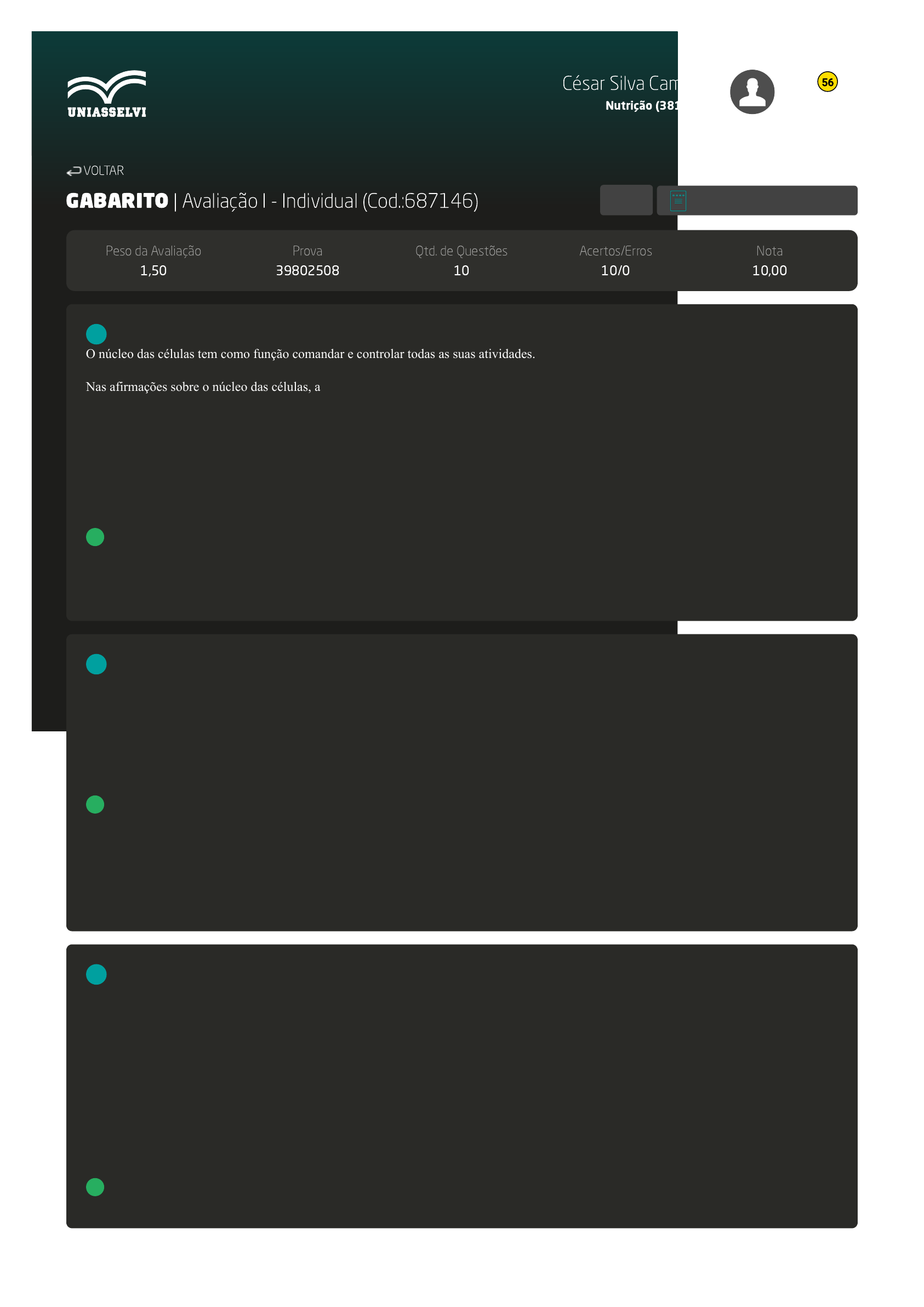 15/11/2021 13:47 AVA https://ava2.uniasselvi.com.br/subject/grades-and-tests/answer-book/eyJ0ZXN0Ijp7InRlc3RDb2RlIjoiNjg3MTQ2IiwiZGVzY3JpcHRpb24iOiJBdmFsaWHDp8OjbyBJIC0gSW5kaXZpZHVhbCIsInBhcmFtZXRlciI6NTQ1L… 1/4 GABARITO | Avaliação I - Individual (Cod.:687146) Peso da Avaliação 1,50 Prova 39802508 Qtd. de Questões 10 Acertos/Erros 10/0 Nota 10,00 O núcleo das células tem como função comandar e controlar todas as suas atividades. Nas afirmações sobre o núcleo das células, assinale a alternativa INCORRETA: A Nas células procariontes, o material genético encontra-se disperso no citoplasma. B Os microrganismos sem membrana nuclear, antes classificados como procariontes, são agora reconhecidos como pertencentes a dois grupos muito distintos: Bacteria e Archaea. C Em bactérias e em arqueas, o nucleoide é separado do citoplasma por uma membrana. D Células eucariontes possuem um núcleo delimitado por um envoltório nuclear. É a expressao utilizada para designar a energia mínima necessária ao funcionamento do nosso corpo em repouso. Do que estamos falando? A Anabolismo. B Metabolismo basal. C Metabolismo anaeróbio. D Metabolismo aeróbio. É a organela celular considerada como a usina de energia, possui material genético próprio e é autorrepliativa. Essas características são específicas de qual organela? A Lisossomas. B Carioteca. C Complexo de golgi. D Mitocôndria. VOLTAR A+ Alterar modo de visualização 1 2 3 César Silva Campelo Nutrição (3814835) 56 15/11/2021 13:47 AVA https://ava2.uniasselvi.com.br/subject/grades-and-tests/answer-book/eyJ0ZXN0Ijp7InRlc3RDb2RlIjoiNjg3MTQ2IiwiZGVzY3JpcHRpb24iOiJBdmFsaWHDp8OjbyBJIC0gSW5kaXZpZHVhbCIsInBhcmFtZXRlciI6NTQ1L… 2/4 Todos os seres vivos são constituídos de células, essas células são envoltas pela membrana plasmática. Sem essa estrutura, a célula morre. Sobre as características e funções da membrana plasmática das células vivas, assinale a alternativa INCORRETA: A A membrana plasmática das células é considerada como sendo um mosaico fluido. B A membrana plasmática protege as estruturas internas das células, define o seu contorno e ainda impede o extravasamento do citoplasma da célula. C A membrana plasmática é composta por uma dupla camada de lipídios e proteínas que formam uma barreira fina, resistente e flexível. D A membrana plasmática é considerada uma estrutura puramente hidrofílica. O corpo humano, no decorrer de nossas vidas, sofre com as mais divesificadas mudanças, sejam elas corporais, funcionais, estruturais ou patológicas. Em reposta às condições variáveis, os pontos de equilíbrio do corpo sofrem alterações dentro de faixa estreita, o que é compatível com a continuidade de vida. Como essa condição dinâmica do equilíbrio corporal é denominada? A Citologia. B Homeostasia. C Patogenia. D Entropia. Os ácidos ribonucleicos (RNA) são compostos por também quatro tipos de nucleotídeos, semelhantes aos do DNA. Qual deles é substituído pela uracila? A Guanina. B Timina. C Citosina. D Adenina. O termo 'entropia', foi usado pela primeira vez em 1851, por Rudolf Clausius, um dos formuladores da Segunda Lei da Termodinâmica. Qual é o significado de entropia? A Significa mudança em sua posição. B Significa mudança em seu destino. C Significa mudança em seu interior. 4 5 6 7 César Silva Campelo Nutrição (3814835) 56 15/11/2021 13:47 AVA https://ava2.uniasselvi.com.br/subject/grades-and-tests/answer-book/eyJ0ZXN0Ijp7InRlc3RDb2RlIjoiNjg3MTQ2IiwiZGVzY3JpcHRpb24iOiJBdmFsaWHDp8OjbyBJIC0gSW5kaXZpZHVhbCIsInBhcmFtZXRlciI6NTQ1L… 3/4 D Significa mudança em seu exterior. Desde o início da vida na Terra, até o aparecimento dos seres vivos atuais, aconteceram vários eventos. Considerando exemplos, ordene os itens a seguir: I- Aparecimento das primeiras células. II- Aparecimento de moléculas orgânicas complexas. III- Formação de organismos capazes de produzir alimentos pela fotossíntese. IV- Surgimento dos primeiros organismos aeróbicos. Assinale a alternativa que apresenta a sequência CORRETA: A I - II - IV - III. B I - IV - III - II. C II - I - III - IV. D II - III - IV - I. Muitos pesquisadores possuem hipóteses sobre o surgimento da vida na Terra. Uma das teorias acredita que a junção de elementos de carbono, hidrogênio, oxigênio, nitrogênio e enxofre, formaram compostos químicos simples. Sobre a denominação desses compostos químicos simples formados, assinale a afirmativa CORRETA: A Molécula. B Composto químico vivo. C Coacervados. D Carboidratos. Bioquímica é o ramo da biologia e da química que estuda as estruturas, a organização e as transformações moleculares que ocorrem na célula. Qual é o ramo que estuda os processos em que a energia é extraída, canalizada e consumida? A Bioenergética. B Anabolismo. C Catabolismo. D Termodinâmica. 8 9 10 César Silva Campelo Nutrição (3814835) 56 15/11/2021 13:47 AVA https://ava2.uniasselvi.com.br/subject/grades-and-tests/answer-book/eyJ0ZXN0Ijp7InRlc3RDb2RlIjoiNjg3MTQ2IiwiZGVzY3JpcHRpb24iOiJBdmFsaWHDp8OjbyBJIC0gSW5kaXZpZHVhbCIsInBhcmFtZXRlciI6NTQ1L… 4/4