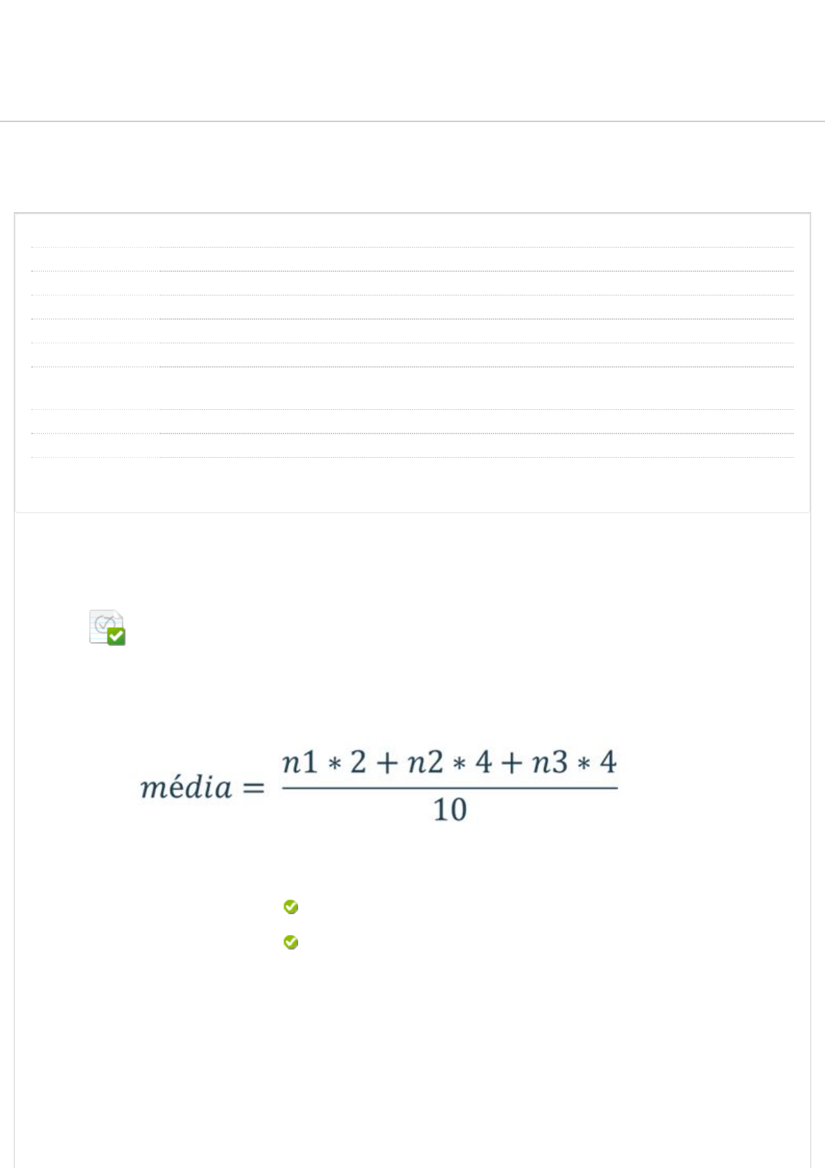Revisar envio do teste: ATIVIDADE TELEAULA I LÓGICA DE PROGRAMAÇÃO E ALGORITMOS 7777-90_43701_R_E1_20212 CONTEÚDO Usuário eduardo.fernandes14 @aluno.unip.br Curso LÓGICA DE PROGRAMAÇÃO E ALGORITMOS Teste ATIVIDADE TELEAULA I Iniciado 31/10/21 16:19 Enviado 31/10/21 16:20 Status Completada Resultado da tentativa 0 em 0 pontos Tempo decorrido 1 minuto Autoteste O aluno responde e o resultado do aluno não é visível ao professor. Resultados exibidos Todas as respostas, Respostas enviadas, Respostas corretas, Comentários, Perguntas respondidas incorretamente Pergunta 1 Resposta Selecionada: a. Respostas: a. b. c. d. e. Comentário da resposta: A média anual de uma determinada Instituição de Ensino é calculada de acordo com os fundamentos da média ponderada. Considerando que as notas são expressas em pontos de 0 a 10,0 múltiplos de 0,5 e à cada nota é atribuído pesos 2, 4, 4, a média é dada pela seguinte fórmula: Escolha qual opção apresenta as variáveis do problema e os tipos adequados. N1, N2, N3, media : real ; p1, p2, p3 : inteiro N1, N2, N3, media : real ; p1, p2, p3 : inteiro N1, N2, N3, media, p1, p2, p3 : inteiro N1, N2, N3, media : real ; p1, p2, p3 : caractere ; media : real N1, N2, N3 : real ; p1, p2, p3, media : inteiro N1, N2, N3 : caractere ; p1, p2, p3 : inteiro ; media : inteiro Resposta: a) UNIP EAD BIBLIOTECAS MURAL DO ALUNO TUTORIAISCONTEÚDOS ACADÊMICOS 0 em 0 pontos http://company.blackboard.com/ https://ava.ead.unip.br/webapps/blackboard/execute/courseMain?course_id=_193064_1 https://ava.ead.unip.br/webapps/blackboard/content/listContent.jsp?course_id=_193064_1&content_id=_2436442_1&mode=reset https://ava.ead.unip.br/webapps/portal/execute/tabs/tabAction?tab_tab_group_id=_10_1 https://ava.ead.unip.br/webapps/portal/execute/tabs/tabAction?tab_tab_group_id=_27_1 https://ava.ead.unip.br/webapps/portal/execute/tabs/tabAction?tab_tab_group_id=_47_1 https://ava.ead.unip.br/webapps/portal/execute/tabs/tabAction?tab_tab_group_id=_29_1 https://ava.ead.unip.br/webapps/portal/execute/tabs/tabAction?tab_tab_group_id=_25_1 https://ava.ead.unip.br/webapps/login/?action=logout Pergunta 2 Resposta Selecionada: c. Respostas: a. b. c. d. e. Comentário da resposta: Analise a expressão lógica e escolha a a�rmativa correta. não F e raizq(exp(7-4,2)) < exp(5,2) ou 15 mod (raizq(49)) >= 81/9 Interprete a expressão em três partes, na forma (A e B ou C), sendo A: Não F; B: (raizq(exp(7-4,2)) < exp(5,2)); e C: 15 mod (raizq(49)) >= 81/9. A expressão é VERDADEIRA porque A e B são verdadeiros e na disjunção (A e B ou C), um termo é su�ciente para satisfazer a expressão lógica. A expressão é VERDADEIRA porque A sempre será verdadeiro e o resultado da conjunção (A e B ou C) é verdadeiro sempre que um dos termos é verdadeiro. A expressão é VERDADEIRA porque C é verdadeiro e na expressão (A e B ou C), basta que C seja verdadeiro para que a expressão seja verdadeira. A expressão é VERDADEIRA porque A e B são verdadeiros e na disjunção (A e B ou C), um termo é su�ciente para satisfazer a expressão lógica. A expressão é FALSA porque a expressão C é falsa e na disjunção, todos os termos devem ser verdadeiros para que a expressão lógica seja verdadeira. A expressão é FALSA porque as expressões A, B e C são falsas. Resposta: c) Pergunta 3 Considere o algoritmo abaixo e responda qual será a saída após a execução. Assuma que as entradas para as variáveis x e y são, respectivamente, 10 e 20. 0 em 0 pontos 0 em 0 pontos Resposta Selecionada: e. Respostas: a. b. c. d. e. Comentário da resposta: x=20, y= 20, z=205. x=10, y=20, z=20. x=10, y=20, z=205. X=20, y=10, z=10. x=20, y=205, z=20. x=20, y= 20, z=205. Resposta: e) Pergunta 4 Dado o algoritmo abaixo, escolha a opção que representa a saída correta. 0 em 0 pontos Domingo, 31 de Outubro de 2021 16h21min02s BRT Resposta Selecionada: d. Respostas: a. b. c. d. e. Comentário da resposta: 10 Fulano Av. Torres de Oliveira, 330 VERDADEIRO 3.1415 10 “Fulano” “Av. Torres de Oliveira, 330” FALSO 3.1415 10 ‘Fulano’ ‘Av. Torres de Oliveira, 330’ VERDADEIRO 3 10 Fulano Av. Torres de Oliveira, 330 FALSO 3.14159265358979 10 Fulano Av. Torres de Oliveira, 330 VERDADEIRO 3.1415 10 Fulano Av. Torres de Oliveira, 330 VERDADEIRO 3 Resposta: d) ← OK