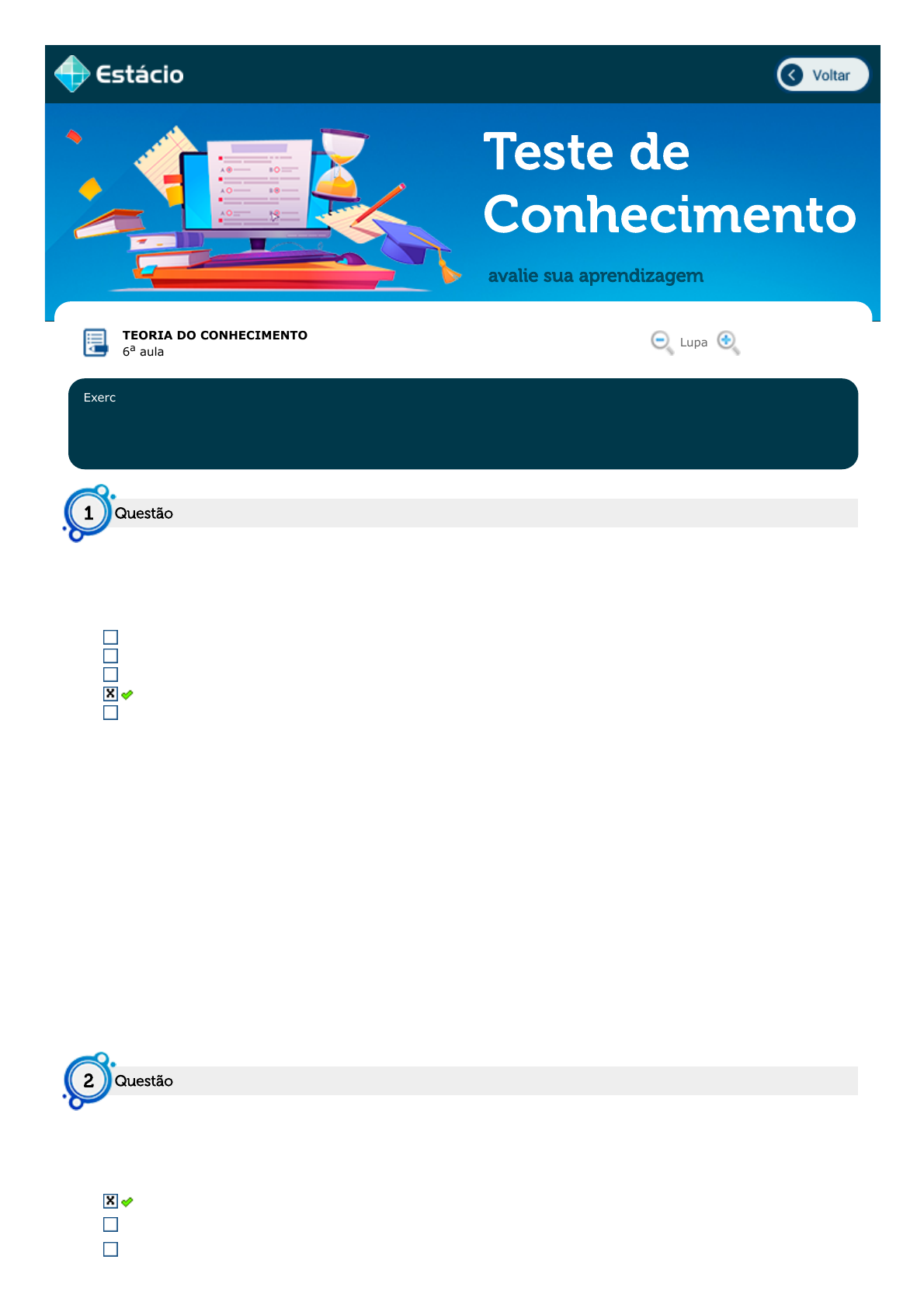 15/11/2021 13:36 EPS https://simulado.estacio.br/alunos/ 1/4 Teste de Conhecimento avalie sua aprendizagem TEORIA DO CONHECIMENTO 6a aula Lupa Exercício: CEL0986_EX_A6_201202342116_V1 15/11/2021 Aluno(a): ANDRÉA BAPTISTA DA SILVA 2021.3 EAD Disciplina: CEL0986 - TEORIA DO CONHECIMENTO 201202342116 Baruch Espinosa (1632 ─ 1677) ─ considerado o fundador do chamado CRISTICISMO BÍBLICO (defendia a Bíblia) buscou um método para chegar a uma verdade ao longo dos estudos conclui a existência de três gêneros de conhecimentos que devem ser observados. Quais seriam esses TRÊS GÊNEROS de CONHECIMENTO que Espinosa idealizou? Pesquisa e Imagem, Retenção e Instrução ou Conclusão Pessoal e Imaginário, Repentino e Introdução ou Capítulo Pergunta e Ideal, Reação e Impróprio ou Composição Percepção e Imaginação, Razão e Intuição ou Contemplação Perspectiva e Ideologia, Retroação e Indução ou Comando Respondido em 15/11/2021 13:26:38 Explicação: Percepção e Imaginação Espinosa entendia que nossa Percepção e nossos sentidos nos induzem ao erro. Não racionalizamos aquilo que recebemos, apenas o aceitamos como real, o que pode nos levar a cometer enganos. Razão Preenche as lacunas da Percepção. Quando utilizamos a Razão, entendemos um processo em sua plenitude, envolvendo causa e efeito. Intuição ou Contemplação Este gênero nos remete à questão divina, mas de forma bem diferente daquela ideia de divindade de Deus proposta por filósofos Santo Agustinho, São Tomás de Aquino. O conceito de SUJEITO FILOSÓFICO - começou a ganhar espaço no campo da Teoria do Conhecimento a partir da contribuição efetiva do Filosofo. Qual o nome do Filósofo? René Descartes Tomás de Aquino Alberto Magno Questão1 Questão2 https://simulado.estacio.br/alunos/inicio.asp javascript:voltar(); javascript:diminui(); javascript:aumenta(); 15/11/2021 13:36 EPS https://simulado.estacio.br/alunos/ 2/4 Artur Schopenhauer Teles de Mileto Respondido em 15/11/2021 13:26:45 Explicação: René Descartes - (1596 - 1650) Explicação Esse filósofo distinguiu mente de matéria, permitindo o desenvolvimento do sentido de um sujeito do conhecimento em Filosofia, que difere o significado do saber de quem o produz. De forma ampla, podemos entender esse sujeito como a própria capacidade humana de conhecer - adquirir conhecimento - e de produzir novos saberes. Ele conta com algumas categorias fundamentais para o conhecer a percepção e a memória. O Barão de Montesquieu contribuiu para o Campo da Política a partir de suas Teorias, cuja proposta consistia em separar o Pode do Estado em três instâncias distintas. Quais seriam esses Poderes do Estado? Expansionista, Léxico e Jurisdição Extraordinário, Laboro e Judicatório Expansivos, Laicos e Justicialistas Executivo, Legislativo e Judiciário Expressivo, Legítimo e Justiça Respondido em 15/11/2021 13:26:51 Explicação: Resposta Executivo, Legislativo e Judiciário Charles - Louis de Secondat - (Barão de La Brède e de Montesquieu). Francês (1689 - 1755). Essa separação permitiria a cada esfera fiscalizar e limitar uma a outra, evitando o excesso de poder, que, inevitavelmente, na visão do filósofo francês, levava à tirania e à perda da liberdade. De acordo com Montesquieu (1996, p. 168). Um dos principais objetivos do iluminismo era a separação entre igreja e Estado. Montesquieu, um importante filósofo francês entendia que era necessário combater o absolutismo estabelecendo a democracia no Estado moderno. Sua inestimável colaboração ocorreu no campo da política, sua proposta consistia em? Separação dos poderes: Legislativo, Executivo e Judiciário Separação entre Estado e Legislativo União dos poderes: Legislativo, Executivo e Judiciário Separação dos poderes: Legislativo, Executivo, Judiciário e Moderador Consolidação dos poderes: Moderador, Legislativo e Executivo Respondido em 15/11/2021 13:27:28 Explicação: Autor: Charles - Louis Secondat (Barão de La Bréde e MONTESQUIEU) - (1689 - 1755) Escritor (Francês). Explorar o tema da interação entre os poderes do Estado conforme entendido por Montesquieu Questão3 Questão4 15/11/2021 13:36 EPS https://simulado.estacio.br/alunos/ 3/4 Para os iluministas o conhecimento produzido pela razão era o conhecimento verdadeiro, um resultado da busca iluminista para afastar-se do conhecimento teológico. Para o filósofo George Berkeley o que é conhecimento? É a soma de nossas impressões que possuem uma materialidade É a soma de nossas sensações É o conjunto de nossas experiências É o conjunto de nossas impressões imateriais É o conjunto de nossas experiências e conhecimentos inatos Respondido em 15/11/2021 13:26:58 Explicação: George BERKELEY. - (1685 - 1753) Filósofo (Irlandês) É a soma de nossas impressões que possuem uma materialidade Um dos maiores projetos do iluminismo, consistia em reunir todo o conhecimento produzido em áreas diversas para que pudesse ser mais facilmente difundido e estudado. Seus executores mais importantes foram os filósofos franceses Denis Diderot e Rond d¿Allembert. Que projeto foi este? Organização do conhecimento em bibliotecas Organização do conhecimento em enciclopédias Construção dos primeiros laboratórios Construção da primeira universidade Organização do conhecimento por tema Respondido em 15/11/2021 13:27:02 Explicação: Autores: Denis DIDEROT - (1713 - 1784) Filósofo Francês. Rond d'ALEMBERT - (1717 - 1783) Escritor e Matemático Francês. Buscar informações sobre as primeiras formas de organização e disponibilização de conhecimento. Dizer que um filósofo tem influência sobre outro, não é o mesmo que dizer que ambos concordavam. Muitas vezes a influência pode ocorrer justamente quando um pensador refuta as teorias de outro. Este foi justamente o caso entre Leibniz em relação a Espinosa, o primeiro discordava tanto do segundo que bastava que uma ideia fosse baseada 