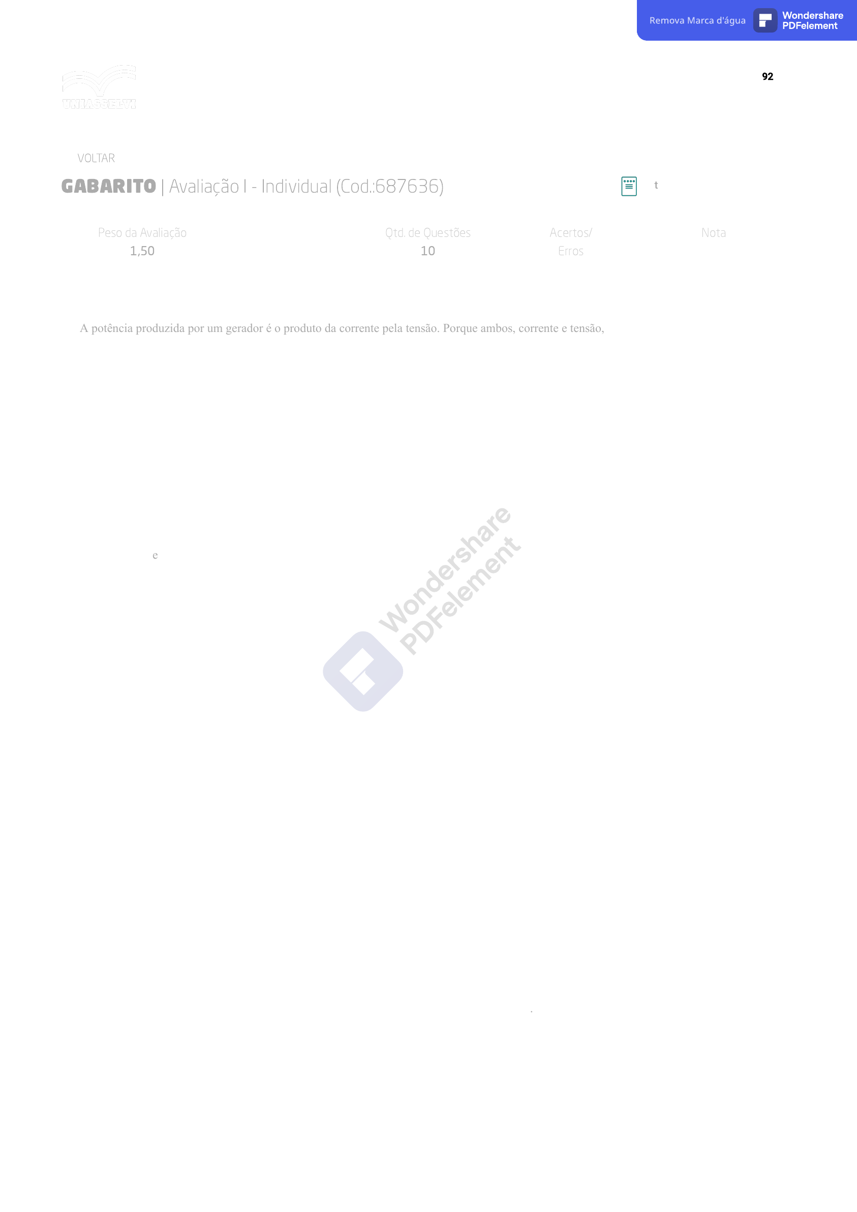 15/11/21, 16:42 AVA https://ava2.uniasselvi.com.br/subject/grades-and-tests/answer-book/eyJ0ZXN0Ijp7InRlc3RDb2RlIjoiNjg3NjM2IiwiZGVzY3JpcHRpb24iOiJBdmFsaWHDp8OjbyBJIC0gSW5kaXZpZHVhbCIsInBhcmFtZXRlciI6NTQ1LC… 1/3 GABARITO | Avaliação I - Individual (Cod.:687636) Peso da Avaliação 1,50 Qtd. de Questões 10 Acertos/ Erros Nota A potência produzida por um gerador é o produto da corrente pela tensão. Porque ambos, corrente e tensão, variam a potência associada a uma corrente alternada. Sobre a potência média, assinale a alternativa CORRETA: A A potência média é a metade da corrente efetiva. B A potência média é a metade da potência efetiva. C A potência média é a metade da potência máxima. D A potência média é a metade da potência efetiva. Determine a ddp que deve ser aplicada a um resistor de resistência 6¿Ω para ser atravessado por uma corrente elétrica de 2A. Sobre o exposto, assinale a alternativa CORRETA: A 6 V. B 8 V. C 12 V. D 10 V. Um resistor ôhmico, quando submetido a uma ddp de 20V, é percorrido por uma corrente elétrica de 4 A. Para que o resistor seja percorrido por uma corrente elétrica de 3A, ele precisa de uma ddp, que deve ser aplicada a ele. Sobre essa ddp, assinale a alternativa CORRETA: A 15 V. B 20 V. C 5 V. D 10 V. O campo magnético é produzido pela corrente que flui pela bobina de um outro campo. Sobre esse outro campo, assinale a alternativa CORRETA: A Estacionário ou estator. B Estacionário ou alternado. C Estator ou resistivo. D Estacionário ou magnético. VOLTAR A+ Alterar modo de visualização 1 2 3 4 Remova Marca d'água WondersharePDFelement SAMSUNG Oval SAMSUNG Destacar SAMSUNG Destacar SAMSUNG Destacar SAMSUNG Destacar http://cbs.wondershare.com/go.php?pid=5254&m=db 15/11/21, 16:42 AVA https://ava2.uniasselvi.com.br/subject/grades-and-tests/answer-book/eyJ0ZXN0Ijp7InRlc3RDb2RlIjoiNjg3NjM2IiwiZGVzY3JpcHRpb24iOiJBdmFsaWHDp8OjbyBJIC0gSW5kaXZpZHVhbCIsInBhcmFtZXRlciI6NTQ1LC… 2/3 As três formas mais comuns de se gerar energia elétrica são: geração hidroelétrica (queda d’água), geração termoelétrica (ex.: Sobre como os geradores de corrente alternada também são chamados, assinale a alternativa CORRETA: A Estatores. B Alternadores. C Magnéticos. D Capacitores. A carga elétrica elementar | e |=1,6×10(−19)C representa uma outra carga elétrica. Sobre essa representação, assinale a alternativa CORRETA: A Representa a carga elétrica de um próton ou de um elétron. B Representa a carga elétrica de um nêutron ou de um elétron. C Representa a carga elétrica de um próton, de um nêutron ou de um elétron. D Representa a carga elétrica de um átomo ou de um elétron. Duas lâmpadas, submetidas a uma mesma tensão, iluminam de maneira diferente. Isso se explica devido ao fato de que diferentes potências geram diferentes intensidades de correntes elétricas. Considere duas lâmpadas, uma (L1) de 100 W e uma e outra (L2) que produz corrente elétrica de 0,91 A, submetidas a uma tensão de 220 V. Sobre a intensidade de corrente elétrica da lâmpada (L1) e a potência da lâmpada (L2), assinale a alternativa CORRETA: A (L1) i = 0,45 A; (L2) P = 45 W. B (L1) i = 0,45 A; (L2) P = 25 W. C (L1) i = 0,27 A; (L2) P = 60 W. D (L1) i = 0,45 A; (L2) P = 200 W. De forma geral, corrente elétrica é o fluxo ordenado de partículas portadoras de carga elétrica ou o deslocamento de cargas dentro de um condutor. Para produzir a corrente, os elétrons devem se deslocar por meio de um efeito. Sobre esse efeito, assinale a alternativa CORRETA: A Diferença de potencial. B Diferença de sinal. C Diferença de carga. D Diferença de efeito. Resistores elétricos são os dispositivos mais usados em circuitos elétricos. Sobre um circuito contendo três resistores de resistências diferentes, associados em paralelo e submetidos a uma certa diferença de potencial, analise as sentenças a seguir: I- A resistência do resistor equivalente é menor do que a menor das resistências dos resistores do conjunto. II- A corrente elétrica é menor no resistor de maior resistência. III- A potência elétrica dissipada é maior no resistor de maior resistência.Assinale a alternativa CORRETA: A As sentenças I e II estão corretas. B Somente a sentença III está correta. 5 6 7 8 9 92 Remova Marca d'água WondersharePDFelement SAMSUNG Destacar SAMSUNG Destacar SAMSUNG Destacar SAMSUNG Destacar SAMSUNG Destacar http://cbs.wondershare.com/go.php?pid=5254&m=db 15/11/21, 16:42 AVA https://ava2.uniasselvi.com.br/subject/grades-and-tests/answer-book/eyJ0ZXN0Ijp7InRlc3RDb2RlIjoiNjg3NjM2IiwiZGVzY3JpcHRpb24iOiJBdmFsaWHDp8OjbyBJIC0gSW5kaXZpZHVhbCIsInBhcmFtZXRlciI6NTQ1LC… 3/3 A interação entre cargas elétricas gera forças de atração ou repulsão que, no Sistema Internacional de Unidades, têm uma determinada unidade. Sobre essa unidade, assinale a alternativa CORRETA: A Metro (M). B Coulomb (C). C Newton (N). D Volt (V). 10 92 Remova Marca d'água WondersharePDFelement SAMSUNG Destacar http://cbs.wondershare.com/go.php?pid=5254&m=db
