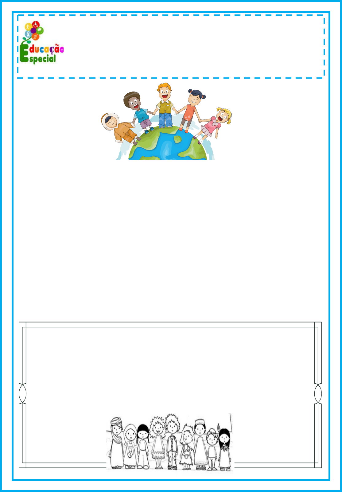 ESCOLA: ___________________________________________ ALUNO(A): __________________________________________ PROFESSOR(A): ___________________ DATA: ___/___/____ EQUIPE MULTIDISCIPLINAR 2021 BARRA DO CHOÇA-BA VOCÊ SABE O QUE É PLURALIDADE CULTURAL? O BRASIL É O PAÍS EM QUE VIVEMOS E ELE FOI FORMADO POR MUITOS GRUPOS HUMANOS, CADA UM DESSES GRUPOS POSSUI MANEIRAS DE VIVER E VALOR. VAMOS ENTENDER MELHOR AO FAZER AS ATIVIDADES, SERÁ UMA NORMALMENTE HERDAMOS ALGUMAS CARACTERÍSTICAS FÍSICAS DE NOSSOS PARENTES. ALGUNS PARECEM COM O PAI, OUTROS COM A MÃE OU COM A AVÓ, FAÇA UM DESENHO DESSA PESSOA: QUESTÃO 1 COSTUMES PRÓPRIOS QUE CHAMAMOS DE CULTURA E POSSUI BASTANTE OUTROS COM ALGUM TIO, ETC. E VOCÊ, COM QUEM SE PARECE? AVENTURA! ESCOLA: ___________________________________________ ALUNO(A): __________________________________________ PROFESSOR(A): ___________________ DATA: ___/___/____ EQUIPE MULTIDISCIPLINAR 2021 BARRA DO CHOÇA-BA QUESTÃO 2 PLURALIDADE CULTURAL COMO É O SEU CORPO? ELE É PARECIDO COM O DE SEUS COLEGAS? E DIFERENÇAS ENTRE AS PESSOAS. COM AJUDA DE UM ADULTO ESCREVA ABAIXO AS SUAS CARACTERÍSTICAS. CERTAMENTE VOCÊ DEVE TER PERCEBIDO QUE EXISTEM SEMELHANÇAS ESCOLA: ___________________________________________ ALUNO(A): __________________________________________ PROFESSOR(A): ___________________ DATA: ___/___/____ EQUIPE MULTIDISCIPLINAR 2021 BARRA DO CHOÇA-BA PLURALIDADE CULTURAL APESAR DE HERDARMOS CARACTERÍSTICAS DE NOSSOS PAIS, SOMOS LEMBRANDO QUE SOMOS DIFERENTES: CABELO, COR DE PELE, OLHOS, QUESTÃO 3 PESSOAS ÚNICAS. DESENHE O ROSTO DE CADA CRIANÇA E PINTE-AS. NARIZ E BOCA. ESCOLA: ___________________________________________ ALUNO(A): __________________________________________ PROFESSOR(A): ___________________ DATA: ___/___/____ EQUIPE MULTIDISCIPLINAR 2021 BARRA DO CHOÇA-BA PLURALIDADE CULTURAL É BOM SERMOS AMIGOS DE TODOS, NÃO IMPORTANDO A RAÇA, PROCURE NA ÁRVORE DA AMIZADE AS PALAVRAS QUE DESCREVEM QUESTÃO 4 RELIGIÃO,NACIONALIDADE ETC. UM VERDADEIRO AMIGO E ESCREVA AO LADO: INTOLERÂNCIA AMIZADE RESPEITO AMOR SOLIDARIEDADE INVEJA INIMIZADE DIÁLOGO ESCOLA: ___________________________________________ ALUNO(A): __________________________________________ PROFESSOR(A): ___________________ DATA: ___/___/____ EQUIPE MULTIDISCIPLINAR 2021 BARRA DO CHOÇA-BA PLURALIDADE CULTURAL QUESTÃO 5 FLECHA CACIQUE BOTE OCA ALDEIA TUPI PEIXE MANDIOCA OS INDÍGENAS FORAM OS PRIMEIROS HABITANTES DO BRASIL. ELES MORAM EM DORMEM EM REDES, CAÇAM E PESCAM PARA SE ALIMENTAR E VIVER EM MULHERES FAZEM ARTESANATO E CERÂMICA. ELAS PINTAM O COLARES PARA SE ENFEITAR. CADA ETNIA SE OCAS, GRUPOS. AS O CORPO E USAM PENAS E ENFEITAR. CADA ETNIA SE ENFEITA DE ACORDO COM OS CUSTUMES. 1- MORADIA ONDE OS ÍNDIOS VIVEM 2- RAIZ QUE FAZ PARTE DA ALIMENTAÇÃO 3- UMA DAS LÍNGUAS INDÍGENAS 4- TIPO DE CARNE PREFERIDA PELOS ÍNDIOS 5- MEIO DE TRANSPORTE UTILIZADO PELOS ÍNDIOS A) COMPLETE AS FRASES COM UMA DAS PALAVRAS INDÍGINAS DO QUADRO. 6- CHEFE DA TRIBO 7- CONJUNTO DE MORADIAS INDÍGENAS ONDE VIVEM 8- INSTRUMENTO UTILIZADO PARA PESCAR B) AGORA QUE VOCÊ CONHECE MELHOR OS POVOS INDÍGENAS, CIRCULE OS OBJETOS QUE FAZEM PARTE DA CULTURA INDÍGENA: ESCOLA: ___________________________________________ ALUNO(A): __________________________________________ PROFESSOR(A): ___________________ DATA: ___/___/____ EQUIPE MULTIDISCIPLINAR 2021 BARRA DO CHOÇA-BA PLURALIDADE CULTURAL QUESTÃO 6 ETNIA: É UM GRUPO DE PESSOAS QUE SE IDENTIFICAM OU SÃO IDENTIFICADAS OUTRAS COM BASE EM SEMELHANÇAS CULTURAIS E BIOLÓGICAS. ETNIAS DIFERENTES. NAS PALAVRAS ABAIXO MARQUE UM X EM TODAS AS VOGAIS E CIRCULE AS UMAS COM AS NOSSO PLANETA TEM MUITAS CONSOANTES: ESCOLA: ___________________________________________ ALUNO(A): __________________________________________ PROFESSOR(A): ___________________ DATA: ___/___/____ EQUIPE MULTIDISCIPLINAR 2021 BARRA DO CHOÇA-BA PLURALIDADE CULTURAL QUESTÃO 7 OBSERVE O QUADRO DE ROMERO BRITTO QUE MOSTRA A BELEZA DA UMA RELEITURA, USANDO TODA A SUA CRIATIVIDADE! DIVERSIDADE. EM SEGUIDA FAÇA UM QUADRO SEMELHANTE, OU SEJA, QUE CORES VOCÊ UTILIZOU PARA MOSTRAR A BELEZA QUE HÁ NA DIVERSIDADE? ESCOLA: ___________________________________________ ALUNO(A): __________________________________________ PROFESSOR(A): ___________________ DATA: ___/___/____ EQUIPE MULTIDISCIPLINAR 2021 BARRA DO CHOÇA-BA PLURALIDADE CULTURAL QUESTÃO 8 SER DIFERENTE É LEGAL, ISSO NOS FAZ ÚNICOS, CADA UM COM SUA BELEZA. ESCREVA O NOME DA ORIGEM DE CADA POVO: ESCOLA: ___________________________________________ ALUNO(A): __________________________________________ PROFESSOR(A): ___________________ DATA: ___/___/____ EQUIPE MULTIDISCIPLINAR 2021 BARRA DO CHOÇA-BA PLURALIDADE CULTURAL QUESTÃO 9 A) CIRCULE NO TEXTO AS CONTRIBUIÇÕES DA INFLUÊNCIA DA CULTURA AFRICANA EM NOSSA ALIMENTAÇÃO: B) ESCREVA UMA LISTA EM ORDEM ALFABÉTICA DOS NOMES DESSES ALIMENTOS. 1 2 3 4 5 6 7 8 9 10 11 12 ESCOLA: ___________________________________________ ALUNO(A): __________________________________________ PROFESSOR(A): ___________________ DATA: ___/___/____ EQUIPE MULTIDISCIPLINAR 2021 BARRA DO CHOÇA-BA PLURALIDADE CULTURAL QUESTÃO 10 A) QUAL É A DANÇA QUE APARECE NA IMAGEM ACIMA? C) SEPARE AS SÍLABAS DAS PALAVRAS ABAIXO: FEIJOADA: AFRICANA: BRASILEIRA: VATAPÁ: CARURU: ESCOLA: ___________________________________________ ALUNO(A): __________________________________________ PROFESSOR(A): ___________________ DATA: ___/___/____ EQUIPE MULTIDISCIPLINAR 2021 BARRA DO CHOÇA-BA PLURALIDADE CULTURAL QUESTÃO 11 A CULTURA AFRICANA TROUXE MUITAS CONTRIBUIÇÕES PARA O BRASIL, DENTRE ELAS OS INSTRUMENTOS MUSICAIS. OBSERVEM ALGUNS DESSES INSTRUMENTOS: A) ENCONTRE NO CAÇA-PALAVRAS OS NOMES DOS INSTRUMENTOS MUSICAIS DE ORIGEM AFRICANA. B) DESEMBARALHE AS LETRAS E DESCUBRA AS TRÊS PRINCIPAIS ETNIAS QUE FORMAM A POPULAÇÃO DO BRASIL: ESCOLA: ___________________________________________ ALUNO(A): ______________________________________