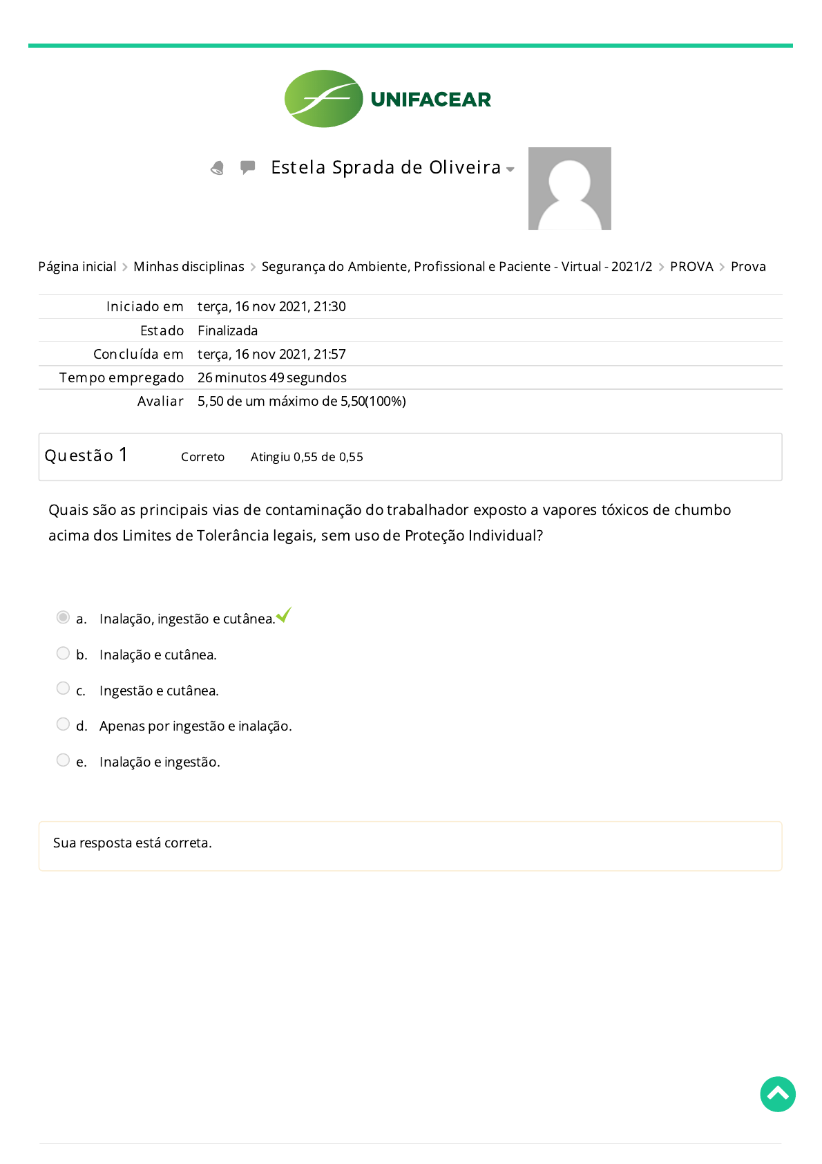Iniciado em terça, 16 nov 2021, 21:30 Estado Finalizada Concluída em terça, 16 nov 2021, 21:57 Tempo empregado 26 minutos 49 segundos Avaliar 5,50 de um máximo de 5,50(100%) Questão 1 Correto Atingiu 0,55 de 0,55 Quais são as principais vias de contaminação do trabalhador exposto a vapores tóxicos de chumbo acima dos Limites de Tolerância legais, sem uso de Proteção Individual? a. Inalação, ingestão e cutânea. b. Inalação e cutânea. c. Ingestão e cutânea. d. Apenas por ingestão e inalação. e. Inalação e ingestão. Sua resposta está correta. Estela Sprada de Oliveira Página inicial Minhas disciplinas Segurança do Ambiente, Pro�ssional e Paciente - Virtual - 2021/2 PROVA Prova http://ava.unifacear.edu.br/ http://ava.unifacear.edu.br/user/view.php?id=20712&course=75797 javascript:void(0) http://ava.unifacear.edu.br/ http://ava.unifacear.edu.br/course/view.php?id=75797 http://ava.unifacear.edu.br/course/view.php?id=75797§ion=7 http://ava.unifacear.edu.br/mod/quiz/view.php?id=607479 Questão 2 Correto Atingiu 0,55 de 0,55 De acordo com a Norma Regulamentadora 32 (NR 32), assinale a alternativa incorreta: a. Quanto aos serviços de Medicina Nuclear, nos locais onde são manipulados e armazenados materiais radioativos ou rejeitos, não é permitido guardar alimentos e bebidas. b. Toda trabalhadora com gravidez con�rmada deve ser afastada das atividades com radiações ionizantes, devendo ser remanejada para atividade compatível com seu nível de formação. c. Quanto aos serviços de Medicina Nuclear, a sala de manipulação e armazenamento de fontes radioativas em uso deve dispor de pia com cuba de, no mínimo, 40 cm de profundidade, e acionamento para abertura das torneiras sem controle manual. d. Na ocorrência ou suspeita de exposição acidental, os dosímetros devem ser encaminhados para leitura no prazo máximoNa ocorrência ou suspeita de exposição acidental, os dosímetros devem ser encaminhados para leitura no prazo máximo de 24 horas. e. Na ocorrência ou suspeita de exposição acidental, os dosímetros devem ser encaminhados para leitura no prazo máximo de 72 horas. Sua resposta está correta. Questão 3 Correto Atingiu 0,55 de 0,55 Sobre a cultura de segurança, descrita na Política Nacional de Segurança do Paciente, assinale a alternativa correta. a. Cultura que prioriza as metas �nanceiras e operacionais acima de segurança. b. Cultura na qual todos os trabalhadores, incluindo pro�ssionais envolvidos no cuidado e gestores, assumem responsabilidade pela sua própria segurança, pela segurança de seus colegas, pacientes e familiares c. Promoção de processos de capacitação de gerentes, pro�ssionais e equipes de saúde em segurança do paciente. d. Comprometimento da estrutura ou função do corpo e/ ou qualquer efeito dele oriundo, incluindose doenças, lesão, sofrimento, morte, incapacidade ou disfunção, podendo, assim, ser físico, social ou psicológico. e. Evento ou circunstância que poderia ter resultado, ou resultou, em dano desnecessário ao paciente. Sua resposta está correta. Questão 4 Correto Atingiu 0,55 de 0,55 De acordo com a Portaria n° 529/2013, que institui o Programa Nacional de Segurança do Paciente (PNSP), de�ne-se Segurança do Paciente como: a. Aplicação sistêmica e contínua de iniciativas, que afetam a segurança, a saúde humana e a imagem institucional. b. Redução, a um mínimo aceitável, do risco de dano desnecessário associado ao cuidado de saúde. c. Comprometimento da estrutura ou função do corpo e/ou qualquer efeito dele oriundo, incluindo-se doenças, lesão, sofrimento e morte. d. Evento ou circunstância que poderia ter resultado, ou resultou, em dano desnecessário ao paciente. e. Abatimento de 100% dos eventos adversos ou incidentes que resultam em dano (físico, social ou psicológico) ao paciente. Sua resposta está correta. Questão 5 Correto Atingiu 0,55 de 0,55 Assinale a alternativa que contém os principais agentes biológicos, presentes na área ocupacional e produtores de onicopatias. a. Atrito, solventes, fungos e frio. b. Umidade, álcalis, solventes e bactérias. c. Vírus, leveduras, resinas e vibrações. d. Leveduras, poeiras, frio e umidade. e. Fungos, leveduras, bactérias e vírus. Sua resposta está correta. Questão 6 Correto Atingiu 0,55 de 0,55 O lixo produzido nos ambientes de saúde apresenta riscos ao ambiente, podendo impactar o solo e a água quando não descartados corretamente. Resíduos de serviços de saúde, as agulhas e o conjunto seringa/agulhas utilizados na aplicação de vacinas, quando não desconectados, devem atender às regras de manejo dos: Fonte: https://www.jorgevianna.com.br/2020/08/25/descarte-de-materiais-perfurocortantes-em-locais-de- grande-circulacao-de-pessoas-agora-e-lei/. Acesso em 07 de outubro de 2021. a. Materiais radioativos. b. Resíduos químicos. c. Resíduos infectantes. d. Resíduos perigosos. e. Resíduos perfurocortantes. Sua resposta está correta. https://www.jorgevianna.com.br/2020/08/25/descarte-de-materiais-perfurocortantes-em-locais-de-grande-circulacao-de-pessoas-agora-e-lei/ Questão 7 Correto Atingiu 0,55 de 0,55 Para identi�car os agentes existentes, os potenciais de risco a eles associados e a prioridade de avaliação e controle para um ambiente de trabalho, é necessário o levantamento detalhado de informações e dados sobre o ambiente. A partir daí é possível classi�car os fatores de risco ou agentes. Diante da exposição prolongada ao asbesto, pode-se considerá-lo um agente ou fator de risco do tipo: a. Físico. b. Mecânico. c. Ergonômico. d. Químico e. Biológico. Sua resposta está correta. Questão 8 Correto Atingiu 0,55 de 0,55 A higiene corporal é imprescindível para a manutenção da saúde, fundamental para a prevenção de lesões na pele e para a promoção do conforto, e ainda possibilita uma melhor avaliação do estado geral do paciente. Para os pacientes totalmente depend