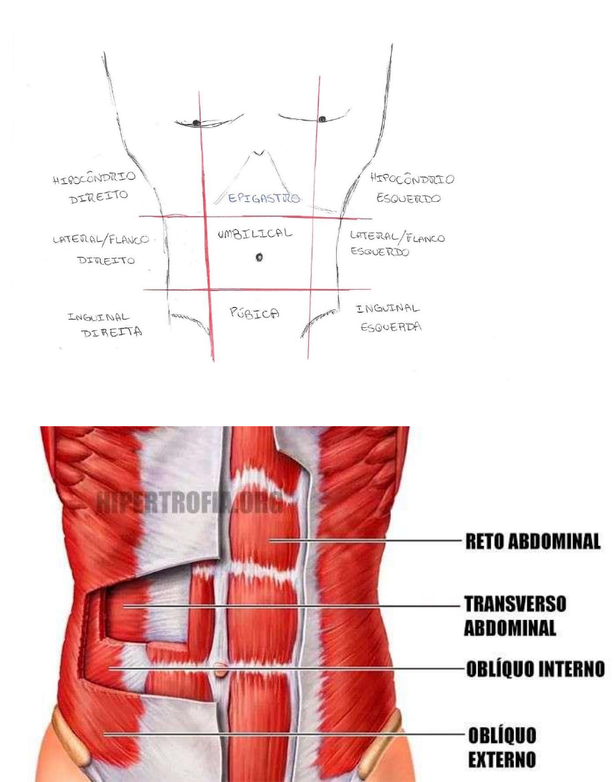 Abdome Resumo Divisão do abdome: Músculos do abdome: • Músculo Oblíquo Externo do Abdome: inervado por nervos toracoabdominais (T7 a T11) e nervo subcostal. Fibras da direção mão no bolso. • Músculo Oblíquo Interno do Abdome: inervado pelos nervos toracoabdominais, subcostal e primeiros nervos lombares. Fibras na direção mão na cabeça. • Músculo Transverso do Abdome: inervado pelos nervos toracoabdominais, subcostal e primeiros nervos lombares. Fibras na direção transversal (horizontal). • Músculo Reto do Abdome: inervado pelos nervos toracoabdomianis e subcostal. É o músculo que forma os gominhos do tanquinho. Bainha do músculo reto do abdome: é o compartimento fibroso incompleto e forte do músculo reto do abdome, ela é formada pela decussação e entrelaçamento das aponeuroses dos músculos planos do abdome. Os 2/3 superiores da aponeurose do músculo oblíquo interno do abdome se dividem em duas lâminas, sendo que uma passa anteriormente (se une à aponeurose do músculo oblíquo externo, formando a lâmina anterior da bainha do músculo reto do abdome) ao músculo reto do abdome e outra passa posterior (se une a aponeurose do músculo transverso do abdome, formando a lâmina posterior da bainha do reto do abdome) a ele. • Linha arqueada: essa divisão da bainha do músculo reto do abdome só acontece até a linha arqueada, a partir de onde a lâmina anterior da bainha do reto do abdome passa a ser formada pelas aponeuroses de todos os 3 músculos laterais do abdome, enquanto a camada posterior só é coberta pela fáscia do músculo transverso e pelo peritônio. Linha alba: é o resultado do entrelaçamento das fibras das lâminas anterior e posterior na linha mediana. Nervos: • Nervo ílio-hipogástrico: ramo terminal superior do ramo anterior do nervo espinal L1. Segue entre a segunda e a terceira camada de músculos abdominais (oblíquo interno e transverso). • Nervo ilioingunal: ramo terminal inferior do ramo anterior do nervo espinal L1. Passa entre a segunda e a terceira camada de músculos abdominais e atravessa o canal inguinal. Artérias: Prega umbilical mediana: vai do ápice da bexiga até o umbigo e cobre o ligamento umbilical mediano (estrutura do feto) 2 pregas umbilicais mediais: laterais à prega umbilical mediana, cobrem os ligamentos umbilicais mediais. 2 pregas umbilicais laterais: situadas lateralmente às pregas umbilicais mediais, cobrem os vasos epigástricos inferiores e, portanto, sangram se forem seccionadas. Fossa inguinal média = Triângulo de Hessebach: localizado entre as pregas umbilicais mediais e laterais. Nele só podem se originar hérnias inguinais diretas (), menos comuns. • Artéria musculofrênica: ramo da artéria torácica interna. Ela desce ao longo da margem costal. • Artéria epigástrica superior: ramo da artéria torácica interna. Ela desse na lâmina posterior da bainha do músculo reto do abdome. • Artéria epigástrica inferior: ramo da artéria ilíaca externa. Segue superiormente e entra na bainha do músculo reto do abdome posterior ao músculo. • Artéria circunflexa ilíaca profunda: ramo da artéria ilíaca externa. Segue na face profunda da parede anterior do abdome, paralela ao ligamento inguinal. • Artéria circunflexa ilíaca superficial: ramo da artéria femoral. Segue na tela subcutânea ao longo do ligamento inguinal. • Artéria epigástrica superficial: ramo da artéria femoral. Segue na tela subcutânea em direção ao umbigo. Fossa inguinal lateral: localizada laterais às pregas umbilicais laterais. Nele está localizado o anel inguinal profundo, e, por isso, ocorrem nesse local as hérnias inguinais indiretas (), mais comuns. Ligamento inguinal: é uma faixa densa que constitui a parte inferior extrema da aponeurose do músculo oblíquo externo do abdome. Estende-se da Espinha Ilíaca Antero Superior até o tubérculo púbico Canal inguinal: • Anel Inguinal Profundo: é a entrada do canal inguinal e está localizado de 1 a 2 cm do ponto médio do ligamento inguinal. • Anel Inguinal Superficial: é a saída do canal inguinal e está localizado 1 cm acima e 1 cm lateral ao tubérculo púbico. • Parede anterior: aponeurose do músculo oblíquo externo do abdome. • Parede posterior: fáscia transversal, reforçada pelas aponeuroses dos músculos oblíquo interno e transverso do abdome. • Teto: fáscia transversal • Assoalho: trato iliopúbico, ligamento inguinal e ligamento lacunar. • Conteúdo: ➢ Funículo espermático (no homem): contém estruturas que entram e saem do testículo e suspende-o no escroto. Ele começa no anel inguinal profundo, lateralmente aos vasos epigástricos inferiores e termina na margem posterior do testículo. ✓ Ducto deferente ✓ Artéria testicular ✓ Artéria do ducto deferente ✓ Artéria cremástica ✓ Plexo venoso pampiniforme (veias que convergem superiormente, formando as veias testiculares direita e esquerda) ✓ Ramo genital do nervo genitofemoral, que supre o músculo cremaster ✓ Vasos linfáticos ✓ Vestígio do processo vaginal: filamento fibroso na parede anterior do funículo espermático, que pode não ser detectável. ➢ Ligamento redondo do útero (nas mulheres) ➢ Vasos sanguíneos e linfáticos ➢ Nervo ilioinguinal Hérnias inguinais: • Hérnia inguinal direta: é o tipo menos frequente e é adquirida. Atravessa apenas parte do canal inguinal e sai, através do anel superficial, lateral ao funículo espermático. • Hérnia inguinal indireta: é o tipo mais comum e é congênita. Atravessa todo o canal inguinal, dentro do processo vaginal, e sai através do anel superficial, dentro do funículo espermático, comumente entrando no escroto/ lábio maior do pudendo.