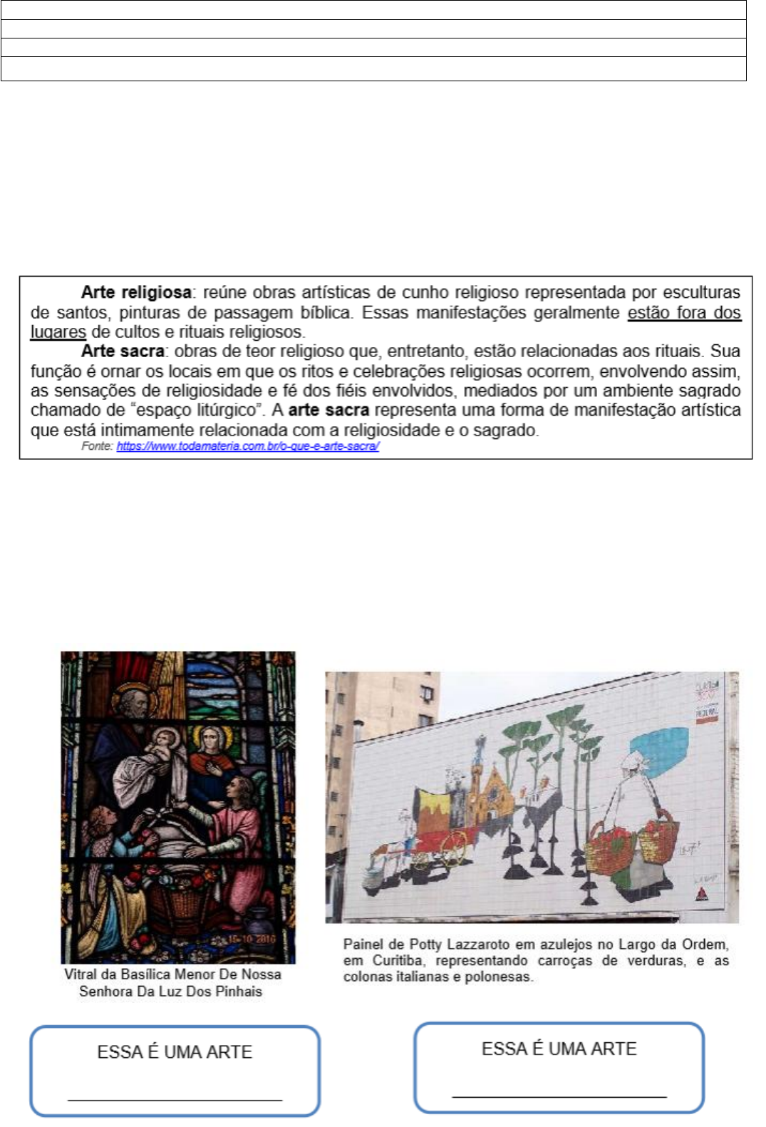 ESCOLA: NOME: PROFESSORA: NAYARA CANDIDO DE SOUZA ATIVIDADE DE ARTES 4° ANO ATIVIDADE COMPLEMENTAR Você já visitou um museu? Nele encontramos a arte expressa em diferentes formas e nos espaços religiosos é possível encontrar a arte? A resposta é sim, mas, como saber se um objeto é religioso ou é utilizado apenas como arte decorativa? Vamos conhecer e entender os dois conceitos de Arte Sacra e Arte Religiosa Após realizar a leitura do significado de Arte Religiosa e Arte Sacra, observe as duas imagens e responda: 1. Qual dessas duas imagens faz parte da Arte Religiosa e da Arte Sacra? Escreva no retângulo embaixo de cada uma delas de que arte ela faz parte: 2. Que elemento da Arte Religiosa é possível identificar nesse painel de Potty Lazzaroto? Resposta: ______________________________________________________________________