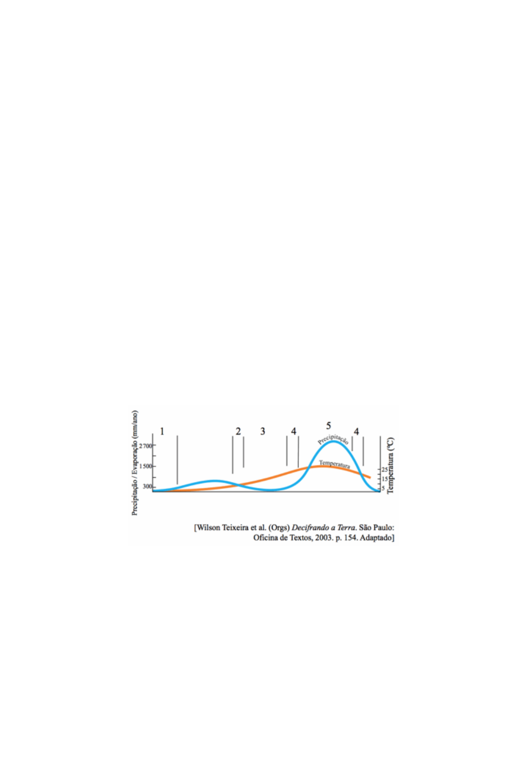 CAPÍTULO 8 – CLIMAS E FORMAÇÕES VEGETAIS NO MUNDO VESTIBULAR 2014 (UFPE) “Biodiversidade é um termo que engloba todas as coisas vivas que existem atualmente na Terra. Abrange todos os animais e plantas que os zoólogos e botânicos já descobriram e descreveram, bem como todos aqueles que ainda não foram descobertos e aguardam uma descrição cien�fica. Se desejamos conservar a biodiversidade, o que muitos ecologistas acreditam ser basicamente um obje�vo sensível, então a conservação dos ecossistemas e seus habitats são o ponto de par�da mais indicado.” (COX, C. B.; MOORE, Peter D. Biogeografia. Uma abordagem ecológica e evolucionária. Rio de Janeiro: LTC, 2009). Sobre esse tema abordado no texto, de conteúdo biogeográfico, analise as afirmações abaixo. 0-0) A proteção da biodiversidade, na atualidade, que tem sido o centro das atenções dos ambientalistas, jus�fica-se por razões: é�cas, esté�cas, ecológicas e econômicas. 1-1) A Biologia da Conservação tem como principal obje�vo estudar como as espécies vegetais e animais estão sendo ex�ntas e quais as estratégias para conservá-las. 2-2) Com relação aos biomas brasileiros, o maior número de espécies ameaçadas ocorre, atualmente, no frágil ecossistema florestal amazônico, especialmente na floresta la�foliada perenifólia. 3-3) O número de espécies ameaçadas no território brasileiro é variável nos diversos níveis taxonômicos, nos biomas e nos Estados do país. 4-4) No conceito de biodiversidade, estão incluídos a variedade de ecossistemas, as espécies, as subespécies, as populações e o DNA. Resposta: V V F V V (FGV-eco) Analise a figura que relaciona temperatura, pluviosidade e vegetação. Considerando que a vegetação está diretamente relacionada às condições climá�cas, sobretudo da temperatura e da pluviosidade, iden�fique dois �pos de vegetação na figura. a) 1 – tundra e 4 – deserto e semideserto. b) 1 – estepe e 3 – savana. c) 2 – tundra e 5 – savana. d) 3 – taiga e 4 – estepe. e) 4 – savana e 5 – floresta tropical. (PUC-RJ) Levando-se em consideração a paisagem selecionada, a única caracterís�ca climá�ca correta para a região destacada é: a) alta amplitude térmica. b) elevada evapotranspiração. c) reduzida taxa de insolação. d) inexistência de pluviosidade. e) intensa umidade rela�va do ar. (UNIMONTES) Observe a figura abaixo. U�lizando seus conhecimentos e as informações da figura, assinale a alterna�va CORRETA. a) A tundra cons�tui o bioma mais devastado do mundo, pois seu solo fér�l foi muito aproveitado para a agricultura. b) As savanas localizam-se entre o bioma da floresta tropical e a taiga, apresentando reduzida biodiversidade. c) As florestas temperadas, nas áreas próximas ao Equador, apresentam árvores de várias alturas e �pos. d) As formações vegetais estão diretamente ligadas ao clima, que varia de acordo com a al�tude e la�tude. VESTIBULAR 2013 (UDESC) Numere as colunas relacionando a vegetação à sua caracterís�ca. (1) Floresta de Coníferas (2) Vegetação Mediterrânea (3) Tundra (4) Pradaria (5) Savana (6) Estepe ( ) Vegetação rasteira de ciclo vegeta�vo curto. Exemplo: musgos e liquens. ( ) Vegetação herbácea, esparsa e ressecada. Surge em climas semiáridos, na faixa de transição de climas úmidos para desertos. ( ) Formação florestal �pica da zona temperada. É conhecida como Taiga e predominam os pinheiros. ( ) Vegetação esparsa que possui três estratos. Um arbóreo, um arbus�vo e um herbáceo. Predomina em regiões de clima mediterrâneo. ( ) Formação herbácea, composta por capim, que aparece em regiões de clima temperado con�nental. Vegetação complexa que surge por influência do clima tropical, alternadamente úmido e seco. Ocorre na África e abriga animais de grande porte como leões, elefantes e girafas. Assinale a alterna�va que contém a sequência correta, de cima para baixo. a) 2 – 1 – 6 – 4 – 5 – 3 b) 1 – 2 – 3 – 6 – 5 – 4 c) 3 – 6 – 1 – 2 – 4 – 5 d) 6 – 5 – 4 – 3 – 2 – 1 e) 4 – 3 – 2 – 5 – 1 – 6 (UPF) Estabeleça a relação entre as duas colunas, considerando as principais formações vegetais do planeta. 1) Floresta Tropical (__) Própria de verões quentes e secos e invernos amenos. No sul da Europa foi intensamente desmatada para o cul�vo de oliveiras e videiras. 2) Mediterrânea (__) Ocorre em altas la�tudes do hemisfério Norte, �pica de clima temperado. Predominam as coníferas, bastante exploradas para a u�lização de madeira e fabricação de papel. 3) Pradaria (__) Composta basicamente por gramíneas, ocorre em áreas de clima temperado e solos ricos em matéria orgânica. 4) Taiga (__) Ocorre em áreas delimitadas pelos trópicos, com temperaturas e pluviosidade elevadas. Concentra a maior biodiversidade entre os demais biomas. (__) U�lizada como pastagem, é encontrada nos Pampas argen�nos, no Uruguai e no sul do Brasil. Originalmente, ocupou pra�camente metade da área do Rio Grande do Sul. A ordem correta da relação estabelecida está na opção: a) 2, 4, 3, 1, 3. b) 1, 4, 3, 2, 3. c) 2, 1, 3, 2, 4. d) 2, 1, 4, 3, 4. e) 3, 1, 4, 1, 3. (PUCRS) Resolver a questão com base nos climogramas que tratam da situação climá�ca de três diferentes cidades. I II III a) - Mediterrâneo - Valparaíso - Temperado Con�nental - Varsóvia Subtropical - Porto Alegre b) - Temperado Oceânico - Nova Iorque - Mediterrâneo - Barcelona - Semiárido - Recife c) - Equatorial - Cingapura - Tropical Con�nental - Cuiaba - Temperado Oceânico - Londres d) - Temperado Con�nental - Berlim - Equatorial - Manaus - Semiárido - Nova Orleans e) - Equatorial - Campo Grande - Semiárido - Teresina - Desér�co - Riad (IFMG) A seguir são apresentados dois climogramas de duas cidades diferentes, Varsóvia e Brest. A la�tude de ambas é aproximadamente a mesma e, 