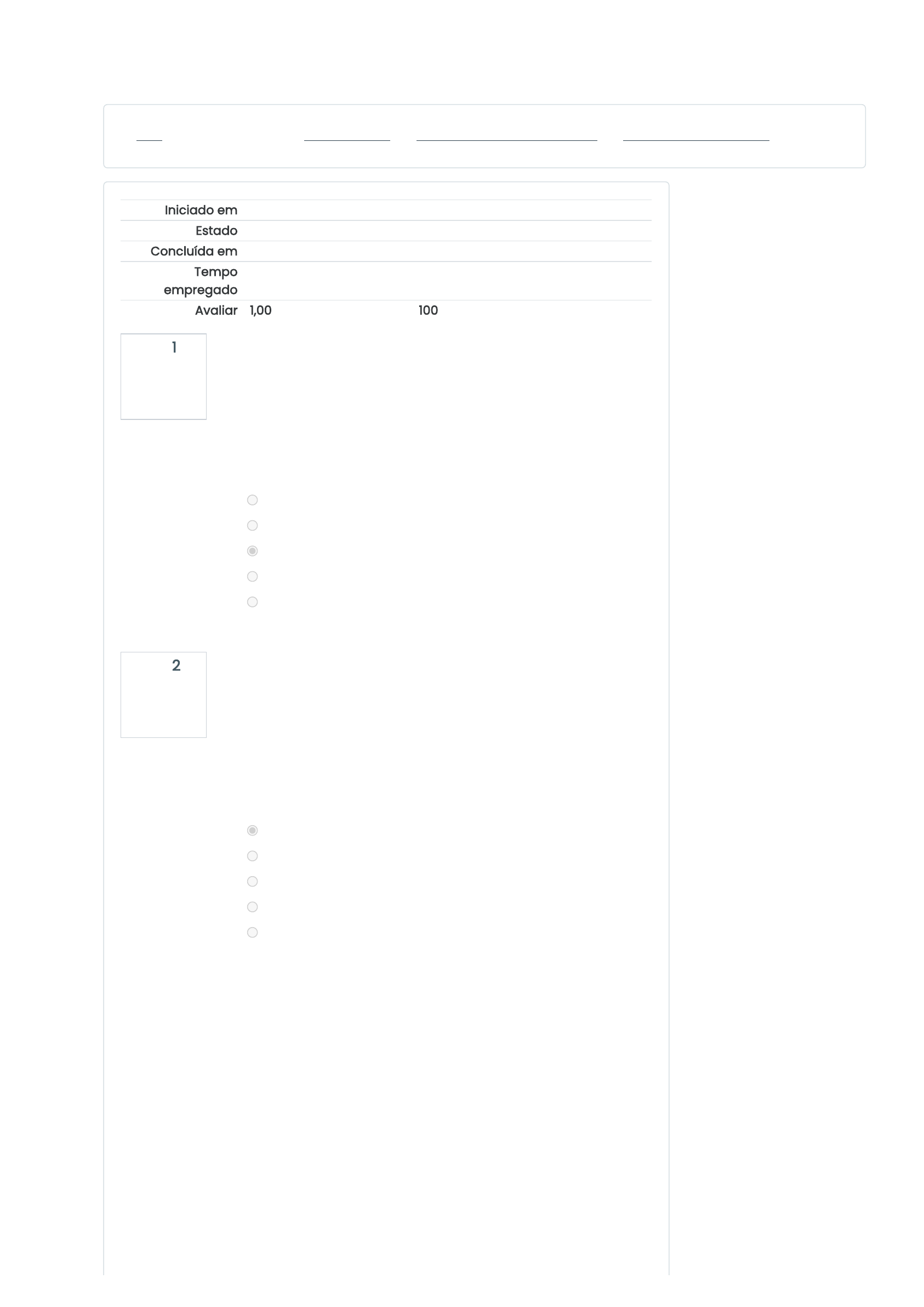20/09/2021 21:52 Atividade Online Pontuada 03 https://cead.uvv.br/graduacao/mod/quiz/review.php?attempt=387006&cmid=44585 1/3 Início Minhas disciplinas Estatística Básica Atividades Online Pontuadas e Prova Atividade Online Pontuada 03 Questão 1 Completo Atingiu 0,20 de 0,20 Questão 2 Completo Atingiu 0,20 de 0,20 Iniciado em segunda-feira, 20 set 2021, 21:21 Estado Finalizada Concluída em segunda-feira, 20 set 2021, 21:52 Tempo empregado 31 minutos Avaliar 1,00 de um máximo de 1,00(100%) Peças produzidas por uma empresa tem diâmetros normais com média de 5 cm e desvio padrão de 0,04 cm. Cada peça deve se encaixar em outra. Um encaixe é aceitável se o diâmetro da peça tiver de 4,92 cm a 5,08 cm. Suponha um lote casual de 1000 peças. Aproximadamente em quantas peças se pode esperar encaixe aceitável? Escolha uma opção: a. 20 b. 50 c. 955 d. 480 e. 977 Suponha que 5% da população portuguesa sofre de hipertensão e que de entre estes, 75% ingerem bebidas alcoólicas. De entre os que não são hipertensos 50% ingerem bebidas alcoólicas. Qual a chance de uma pessoa que não ingere álcool, não ser hipertenso? Escolha uma opção: a. 97,4% b. 47,5% c. 50,0% d. 3,75% e. 75,0% https://cead.uvv.br/graduacao/my/ https://cead.uvv.br/graduacao/course/view.php?id=262 https://cead.uvv.br/graduacao/course/view.php?id=262§ion=2 https://cead.uvv.br/graduacao/mod/quiz/view.php?id=44585 https://cead.uvv.br/graduacao/grade/report/index.php?id=262 https://cead.uvv.br/graduacao/blocks/mchat/view.php?id=262 https://cead.uvv.br/graduacao/my/ https://cead.uvv.br/graduacao/calendar/view.php?view=month&course=262 javascript:void(0); https://cead.uvv.br/graduacao//course/view.php?id=182&sesskey=IHiFpKFV2w&edit https://aluno.uvv.br/Aluno/Dashboard https://cead.uvv.br/graduacao/my 20/09/2021 21:52 Atividade Online Pontuada 03 https://cead.uvv.br/graduacao/mod/quiz/review.php?attempt=387006&cmid=44585 2/3 Questão 3 Completo Atingiu 0,20 de 0,20 Questão 4 Completo Atingiu 0,20 de 0,20 X Y 1 11 2 22 3 33 4 44 5 55 6 66 7 77 8 88 9 98 Considerando a tabela, referente aos valores das variáveis X e Y, é correto afirmar que a correlação entre as variáveis X e Y: Escolha uma opção: a. é menor que – 1. b. é zero. c. é maior do que +1. d. encontra-se entre – 0,9 e – 1. e. encontra-se entre + 0,9 e + 1. Considere os seguintes diagramas de dispersão: Escolha uma opção: a. O gráfico I e II indicam que o coeficiente de correlação de Pearson está próximo de zero. b. O gráfico I indica que existe forte correlação linear positiva entre as variáveis X e Y. c. O gráfico III indica que praticamente não há correlação entre as variáveis X e Y. d. O gráfico II indica que o coeficiente de correlação de Pearson está próximo de 1. e. O gráfico IV indica que existe forte correlação linear entre X e Y. https://cead.uvv.br/graduacao/grade/report/index.php?id=262 https://cead.uvv.br/graduacao/blocks/mchat/view.php?id=262 https://cead.uvv.br/graduacao/my/ https://cead.uvv.br/graduacao/calendar/view.php?view=month&course=262 javascript:void(0); https://cead.uvv.br/graduacao//course/view.php?id=182&sesskey=IHiFpKFV2w&edit https://aluno.uvv.br/Aluno/Dashboard https://cead.uvv.br/graduacao/my 20/09/2021 21:52 Atividade Online Pontuada 03 https://cead.uvv.br/graduacao/mod/quiz/review.php?attempt=387006&cmid=44585 3/3 Questão 5 Completo Atingiu 0,20 de 0,20 O gráfico abaixo apresenta um exemplo hipotético da relação entre a idade e o peso total, em gramas, de três espécies de peixes (A, B e C), onde foram encontradas a seguintes regressões: Analisando as três retas de regressão ajustadas, conclui-se que: Escolha uma opção: a. A reta C apresenta coeficiente angular e coeficiente de correlação intermediários. b. A reta A apresenta maior coeficiente angular e maior coeficiente de correlação. c. A reta B apresenta menor coeficiente angular e coeficiente de correlação intermediário. d. A reta C apresenta menor coeficiente angular e maior coeficiente de correlação. e. A reta B apresenta coeficiente angular intermediário e maior coeficiente de correlação. https://cead.uvv.br/graduacao/grade/report/index.php?id=262 https://cead.uvv.br/graduacao/blocks/mchat/view.php?id=262 https://cead.uvv.br/graduacao/my/ https://cead.uvv.br/graduacao/calendar/view.php?view=month&course=262 javascript:void(0); https://cead.uvv.br/graduacao//course/view.php?id=182&sesskey=IHiFpKFV2w&edit https://aluno.uvv.br/Aluno/Dashboard https://cead.uvv.br/graduacao/my