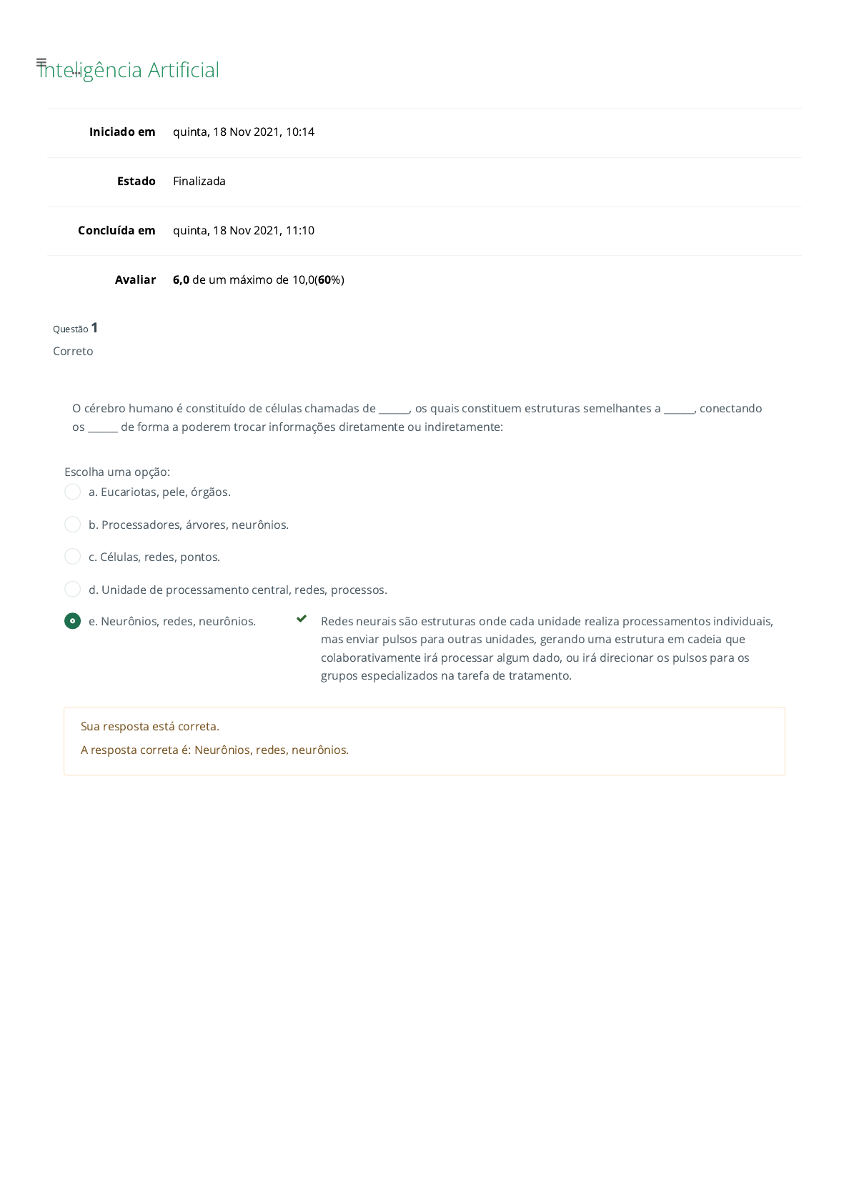 Inteligência Arti�cial Iniciado em quinta, 18 Nov 2021, 10:14 Estado Finalizada Concluída em quinta, 18 Nov 2021, 11:10 Avaliar 6,0 de um máximo de 10,0(60%) Questão 1 Correto O cérebro humano é constituído de células chamadas de ______, os quais constituem estruturas semelhantes a ______, conectando os ______ de forma a poderem trocar informações diretamente ou indiretamente: Escolha uma opção: a. Eucariotas, pele, órgãos. b. Processadores, árvores, neurônios. c. Células, redes, pontos. d. Unidade de processamento central, redes, processos. e. Neurônios, redes, neurônios. Redes neurais são estruturas onde cada unidade realiza processamentos individuais, mas enviar pulsos para outras unidades, gerando uma estrutura em cadeia que colaborativamente irá processar algum dado, ou irá direcionar os pulsos para os grupos especializados na tarefa de tratamento. Sua resposta está correta. A resposta correta é: Neurônios, redes, neurônios. https://aula.fael.edu.br/ Questão 2 Incorreto Questão 3 Incorreto A aprendizagem não supervisionada é um paradigma da aprendizagem dedutiva onde os dados de treinamento não possuem classes prede�nidas. Neste sentido, quais os componentes presentes neste tipo base da dados antes do treinamento? Escolha uma opção: a. Classe, atributo e instância. b. Instância. c. Atributo e classe. d. Atributo e instância. e. Instância e classe. Sua resposta está incorreta. A resposta correta é: Atributo e instância. A aplicação dos algoritmos de aprendizado por esforço, devem considerar ouso de ________ e _________ como parâmetros que identi�cam se a hipótese foi bem aplicada ou não para uma dada situação. Escolha uma opção: a. Dados e modelos. b. Vetores e matrizes. c. Recompensas e respostas. d. Agentes reativos e lógica propositiva. e. Recompensas e punições. Sua resposta está incorreta. A resposta correta é: Recompensas e punições. https://aula.fael.edu.br/ Questão 4 Incorreto Questão 5 Correto O tratamento dos dados é uma ação importante para a fase de processamento, uma vez que, cada tipo de algoritmo possui conjuntos próprios de entradas. Neste sentido o processo onde modi�camos os valores de entrada para variação entre 0 e 1 é chamado de: Escolha uma opção: a. Binarização. b. Ajuste. c. Discretização. d. Redução. e. Transformada. Sua resposta está incorreta. A resposta correta é: Discretização. Segundo Russell (2013), agentes capazes de _______ o ambiente através de _______, o fazem monitorando o ambiente a procura de algum aspecto que o permita utilizá-lo para �ns especí�cos. Qual alternativa completa corretamente a a�rmação? Escolha uma opção: a. Pensar, sensores. b. Perceber, algoritmos de tratamento de respostas. c. Perceber, sensores. A habilidade de percepção está diretamente ligada aos sensores aplicados no sistema, como pode ser visto na sessão 4.1. d. Atuar ligado a, Campos harmônicos. e. Notar, base de dados. Sua resposta está correta. A resposta correta é: Perceber, sensores. https://aula.fael.edu.br/ Questão 6 Correto Questão 7 Correto Um dos principais conceitos da aprendizagem dedutiva é a não presença das classes como atributo nas instâncias presentes na base. A falta das classes permite que os algoritmos as identi�quem, criando estruturas chamadas de? Escolha uma opção: a. Container bidimensional. b. Caixa de dados. c. Cluster. Os cluster são estruturas que conjugam um conjunto de dados com características especí�cas. d. Classe. e. Variável. Sua resposta está correta. A resposta correta é: Cluster. Segundo Grigoletti (2015), Uma ______ é caracterizada pelo fato de um estado no momento atual não ser dependente de qualquer estado em momentos anteriores, salvo apenas o estado anterior. O campo vazio ligado a esta a�rmação se trata da: Escolha uma opção: a. IA. b. Estrutura em grafo. c. Cadeia de Markov. Cadeia de Markov, uma vez que essa estrutura prevê a independência entre os elementos não consecutivos. d. Modelo oculto de Markov. e. Comunidade de agentes reativos. Sua resposta está correta. A resposta correta é: Cadeia de Markov. https://aula.fael.edu.br/ Questão 8 Correto Questão 9 Incorreto Os primeiros sistemas que aplicaram PLN possuíam quatro características distintas que permitiam sua identi�cação e classi�cação. Assim, assinale a alternativa que apresenta corretamente uma das quatro características desses sistemas. Escolha uma opção: a. Apesar de não serem IA, estes sistemas conseguiam simular muito bem redes neurais arti�ciais. b. Classi�cavam diferentes formas de comunicação para identi�car se estavam interagindo com um humano ou máquina. c. Bases de dados prévias que proviam a capacidade de deduzir notações formais através de entradas de texto em forma de frases. Uma das características desses sistemas é a base de dados prévias que proviam a capacidade de deduzir notações formais através de entradas de texto em forma de frases. d. Aplicavam o paradigma da comunicação maquina/homem. e. Uso de algoritmos em linguagem de alto nível. Sua resposta está correta. A resposta correta é: Bases de dados prévias que proviam a capacidade de deduzir notações formais através de entradas de texto em forma de frases. K-nn e a árvore de decisão são algoritmos supervisionados, ou seja, possuem classes de�nidas na base de treinamento. Porém, existem diferenças especí�cas na forma como a classi�cação é feita, sendo uma delas: Escolha uma opção: a. A árvore de decisão não é capaz de apresentar resultados melhores que o k-nn para um mesmo problema. b. O k-nn procura usar um grafo similar a árvore, porém, mudasse apenas as nomenclaturas usadas. c. A estrutura dos algoritmos é impossível de ser prevista, uma vez que ambas aplicam grafos construídos genericamente a cada execução, assim, a qualidade do algoritmo não pode ser prevista. d. O k-nn não é capaz de apres