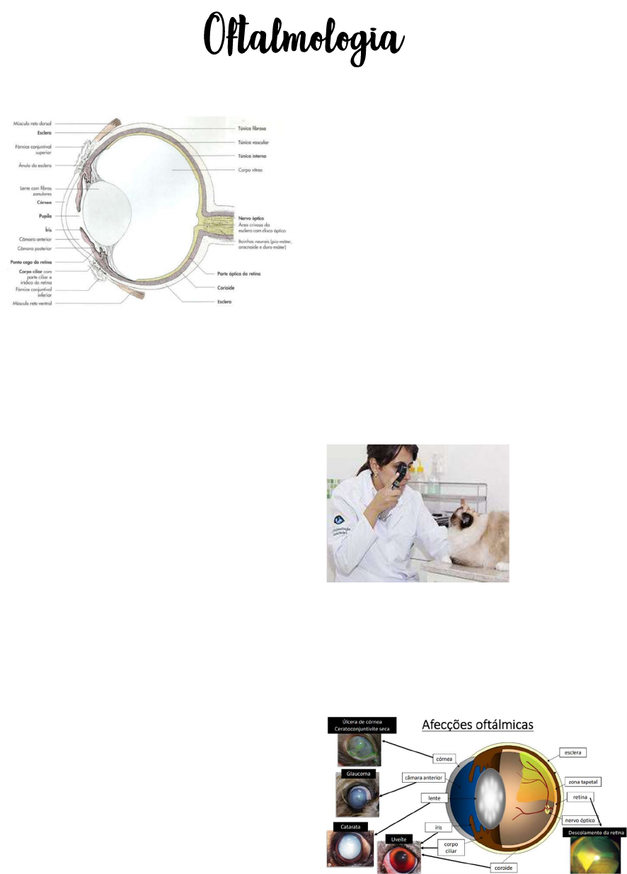 Exame oftálmico Sequência padronizada: 1) Inspeção Distância • Posição do globo, tamanho e movimento • Teste de visão/neurológico: algodão, obstáculos, reação à ameaça, reflexo pupilar fotomotor Ocular • Secreção, hiperemia conjuntival, opacidade, lesões de córnea, distúrbios ciliares, alteração da coloração da íris • Sinais de dor ocular: - Blefarospasmo - Lacrimejamento - Fotofobia - Protusão da terceira pálpebra 2) Teste da lágrima de Schirmer Valores normais: • Cães 19,8 mm/min ± 5,3 • Gatos 16,9 mm/min ± 5,7 3) Prova da Fluoresceína - Avaliação de lesões na córnea - Avaliação do ducto nasolacrimal – 5 min para o colírio sair pelo nariz ou céu da boca (Teste de Jones) • Tonometria • Biomicroscopia com lâmpada de fenda - Avalia todas as estruturas com aumento até o vítreo • Fundoscopia ou oftalmoscopia - Avaliação da retina - Para a fundoscopia precisa provocar a dilatação da pupila • Ultrassom ocular – não é rotineiro Úlcera de córnea • Quebra na continuidade do epitélio corneano com ou sem perda estromal • Melting: caracterizada pela dissolução do estroma córnea • Descemetocele: úlcera corneana profunda com exposição e possível protusão da membrana de Descemet • Perfuração ocular: quando todas as camadas da córnea são atingidas, resultantes de condições destrutivas, infecciosas ou não. Pode ocorrer ou não extravasamento de humor aquoso ou estafiloma. Classificação - A flurosceína não cora o epitélio e a membrana de Descement Fatores predisponentes: • Afecções dos cílios e pálpebras • CCS • Trauma; corpo estranho • Causas infecciosas (cinomose, herpesvírus felino – causa úlcera dendrítica) • Lagoftalmia - braquicefálicos - Estado em que o paciente não consegue abaixar a pálpebra superior quando tenta cerrar os olhos, indicativo de afecção no nervo facial Diagnóstico • Inspeção • Teste de fluoresceína • Pode ser realizado citologia + cultura e antibiograma • Diagnóstico diferencial: úlcera Indolente - Boxer, gatos com HVF-1 - Erosão corneana superficial e persistente com bordos epiteliais soltos e elevados - sem lesão traumática prévia - Tratamento cirúrgico Tratamento - Dependente da gravidade da lesão (clínico X cirúrgico) - Resolver a causa de base 1) Colírio/pomada antimicrobiana: QID (ou +) / 7 dias • Tobramicina 0,3% (Tobrex®) • Cloranfenicol 0,5% (Regencel®) • Ciprofloxacina 0,3% (Ciloxam®) • Gatifloxacina 2) Colírio anti-inflamatório (AINES): se necessário e com cautela • Diclofenaco de sódio 0,1% (Still®) – BID - Nunca usar corticoide - Sempre fazer uso de colar elisabetano 3) Colírio cicloplégico: SID ou BID, enquanto houver dor (menor tempo possível) • Atropina 1% 4) Colírios lubrificantes 5) Analgésico sistêmico: se necessário 6) Recobrimento cirúrgico • Recobrimento conjuntival • Recobrimento terceira pálpebra Sequestro de córnea - Ceratopatia predominantemente da espécie felina - Evolução crônica associada a fatores que causam lesão à córnea: entrópio, traumas, triquíase, condições neuroparalíticas, CCS, HVF-1 Diagnóstico - Inspeção Tratamento • Ceratectomia lamelar: É a retirada de uma lamela da córnea • Técnicas de suporte e nutrição – Recobrimento com a terceira pálpebra – Lentes de contato terapêuticas – Recobrimento conjuntival Ceratoconjuntivite seca (CCS) • Doença multifatorial do filme lacrimal que cursa com alterações qualitativas e/ou quantitativas, resultando em sinais de desconforto ocular, distúrbios da visão e potencial dano da superfície ocular Etiologia • Congênita • Induzida por fármacos: ex. sulfa • Imunomediada (mais comum) • Prolapso/remoção da glândula da 3ª pálpebra • Infecciosa (Cinomose, Herpesvírus) • Senilidade Sinais clínicos • Desconforto ocular, hiperemia conjuntival, secreção ocular e filamentos de muco, focinho e córnea ressecados, úlcera de córnea, neovascularização da córnea • Infecciosa (Cinomose, Herpesvírus) • Senilidade Diagnóstico • Teste de schirmer • 15 a 25 mm/min = produção normal • 11 a 14 mm/min = subclínica • 6 a 10 mm/min = moderada • 0 a 5 mm/min = grave Tratamento 1) Corrigir a causa primária 2) Repor a lágrima • Substitutos da lágrima (lacrimomiméticos): quantas vezes for necessário • Lacrimoestimulante: SID, BID, ad eternum - Tacrolimus 0,02% a 0,03% - mais comum - Ciclosporina A 0,2% 3) Tratar a úlcera de córnea: colírio antibiótico 4) Mucolítico: Reduz viscosidade do muco • Acetilcisteína colírio a 5% - 1 gota, QID, durante 30 dias 5) Cirúrgico: Transposição do ducto parotídeo Catarata • Grupo de desordens oculares manifestadas por opacidade do cristalino que pode ter várias formas, tamanhos, etiologias e estágios de progressão • Principal causa de cegueira tratável em cães Etiologia • Hereditária: Raças predispostas (Poodle, Schnauzer, Cocker, Golden, Boston Terrier) • Metabólica: Diabetes mellitus, hipocalcemia • Trauma, secundária à uveíte, secundária a glaucoma, toxinas Classificação - Estágio de desenvolvimento - Tempo de evolução - Congênita X Adquirida Diagnóstico • Diferenciar de esclerose nuclear Tratamento: cirúrgico Glaucoma • É o aumento da pressão intra-ocular Etiologia • Congênita • Primária: obstrução da drenagem do humor aquoso pelo ângulo irido-corneal • Secundária: traumas, luxação de cristalino, uveíte, hifema, neoplasias Sinais clínicos • Cegueira aguda, dor ocular, hiperemia conjuntival e episcleral, midríase, edema de córnea, buftalmia (aumento do tamanho do bulbo ocular). Diagnóstico • Inspeção • Tonometria Tratamento • Colírios antiglaucomatosos que podem ser associados mais de um agente (ex.: dorzolamida + timolol) • Analgesia sistêmica • Casos que não respondem ao tratamento é recomendada enucleação