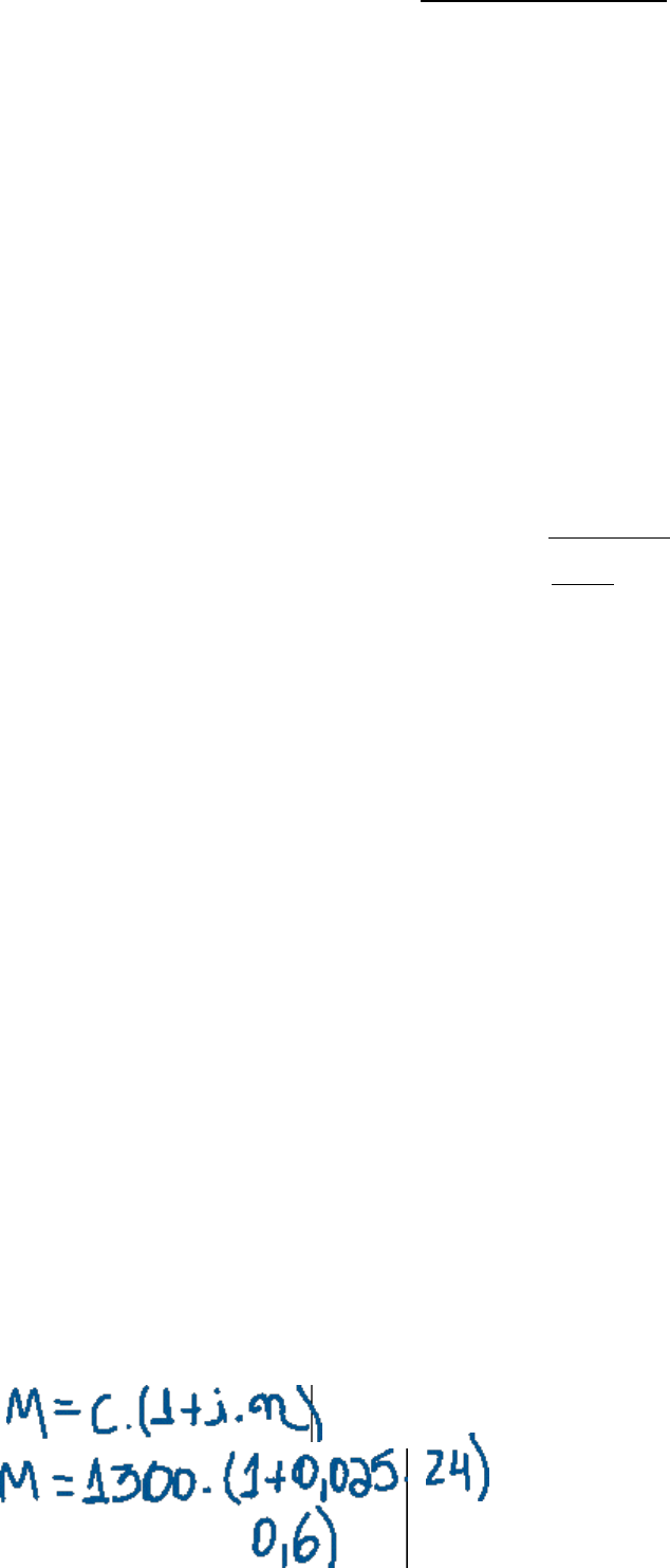 JUROS SIMPLES Um comerciante contraiu de um amigo um empréstimo de R$ 7000,00 comprometendo-se a pagar a divida em 3 meses, à taxa de juros simples de 2,5% a.m (ao mês). Quanto este comerciante pagar de juros? Qual o montante a ser pago ao final dos 3 meses? Ao final de 3 meses o comerciante vai pagar um montante de R$ 7525,00 Aofinal de 3 meses o comerciante vai um total de juros de R$ 525,00 Um comerciante fez uma aplicação de R$ 1300,00 à taxa de juros simples de 2,5% a.m, durante dois anos. Ao final desse prazo qual o montante resgatado pelo comerciante? Qual a taxa de juros empregada ?