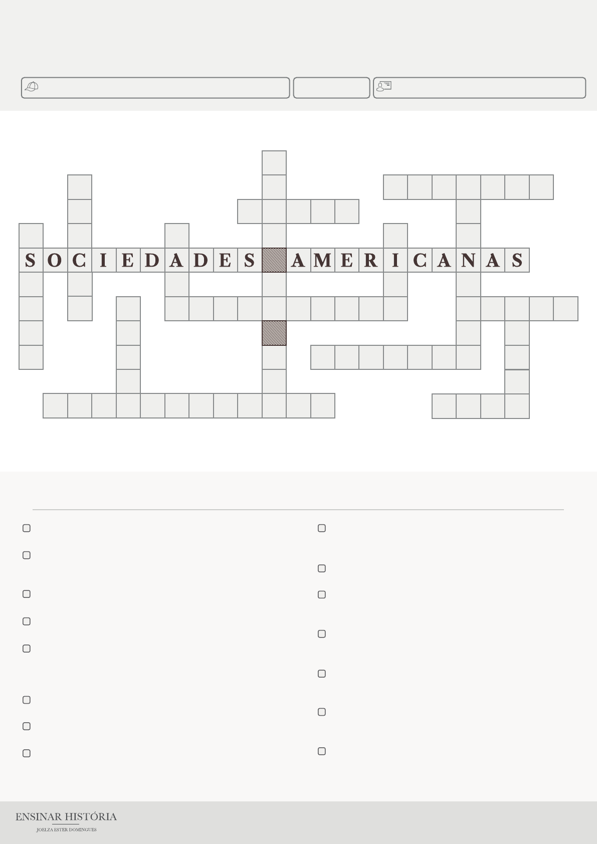 www.ensinarhistoriajoelza.com.br SOCIEDADES AMERICANAS PRÉ-COLONIAIS Resolva a cruzadinha Professor (a)AnoAluno (a) 1. Civilização americana de língua nahuatl que se desenvolveu no território do atual México. 2. A mais duradoura civilização americana, ocupou os territórios hoje pertencentes a Guatemala, Honduras, Belize e sul do México. 3. Civilização americana que formou um poderoso império na região andina da América do Sul. 4. Capital asteca sobre cujas ruínas foi construída a atual Cidade do México. 5. Tecnologia agrícola asteca que consistia em um canteiro �utuante ou pequena ilha arti�cial, de grande fertilidade e cujo cultivo atendia as necessidades alimentares da população. 6. Língua de origem maia, utilizada até hoje por seus descendentes. 7. Língua dos antigos incas e hoje uma das línguas o�ciais da Bolívia, Peru e Equador. 8. Capital de Tahuantinsuyu, o império inca, situada nos Andes e a 3400 metros de altitude. 9. Tecnologia inca para registros contábeis por meio de cordões coloridos onde se davam nós que eram decifrados conforme a cor, a posição e o tipo de nó. 10. Animal domesticado na região dos Andes do qual se extrai a lã e leite. 11. A divindade mais importante dos astecas com o nome Huitzilooichtli, e também dos incas que o chamavam de Inti. 12. Sistema inventado pelos maias que continuou a existir no início do período colonial e depois abandonado com a destruição de numerosos códices. 13. Cereal nativo da América, cultivado a partir de 2500 a.C., e base da alimentação dos maias, astecas, incas e outras sociedades americanas. 14. Trabalho gratuito prestado pelos homens e mulheres do Império Inca para o imperador e os deuses, e depois explorado pelos espanhóis. 15. Conhecimento em que os maias foram exímios chegando a cálculos precisos que surpreendem os cientistas de hoje. 1 2 34 56 7 8 9 10 11 12 13 14 15 www.ensinarhistoriajoelza.com.br SOCIEDADES AMERICANAS PRÉ-COLONIAIS Resolva a cruzadinha Professor (a)AnoAluno (a) 1. Civilização americana de língua nahuatl que se desenvolveu no território do atual México. 2. A mais duradoura civilização americana, ocupou os territórios hoje pertencentes a Guatemala, Honduras, Belize e sul do México. 3. Civilização americana que formou um poderoso império na região andina da América do Sul. 4. Capital asteca sobre cujas ruínas foi construída a atual Cidade do México. 5. Tecnologia agrícola asteca que consistia em canteiro �utuante ou pequena ilha arti�cial, de grande fertilidade e cujo cultivo atendia as necessidades alimentares da população. 6. Língua de origem maia, utilizada até hoje por seus descendentes. 7. Língua dos antigos incas e hoje uma das línguas o�ciais da Bolívia, Peru e Equador. 8. Capital de Tahuantinsuyu, o império inca, situada nos Andes e a 3400 metros de altitude. 9. Tecnologia inca para registros contábeis por meio de cordões coloridos onde se davam nós que eram decifrados conforme a cor, a posição e o tipo de nó. 10. Animal domesticado na região dos Andes do qual se extrai a lã e leite. 11. A divindade mais importante dos astecas com o nome Huitzilooichtli, e também dos incas que o chamavam de Inti. 12. Sistema inventado pelos maias que continuou a existir no início do período colonial e depois abandonado com a destruição de numerosos códices. 13. Cereal nativo da América, cultivado a partir de 2500 a.C., e base da alimentação dos maias, astecas, incas e outras sociedades americanas. 14. Trabalho gratuito prestado pelos homens e mulheres do Império Inca para o imperador e os deuses, e depois explorado pelos espanhóis. 15. Conhecimento em que os maias foram exímios chegando a cálculos precisos que surpreendem os cientistas de hoje. 1 2 34 56 7 8 9 10 11 12 13 14 15