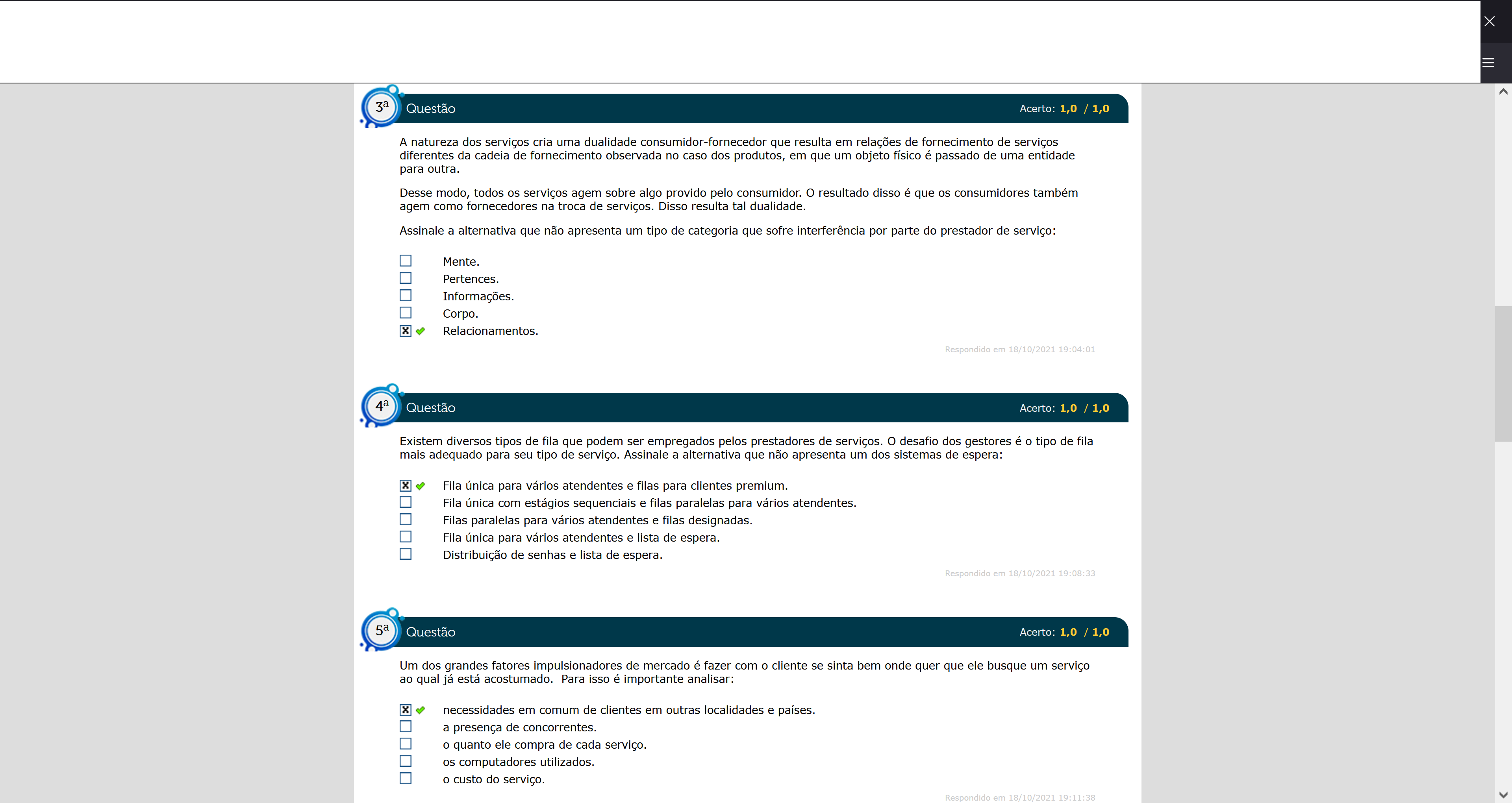 A natureza dos serviços cria uma dualidade consumidor-fornecedor que resulta em relações de fornecimento de serviços diferentes da cadeia de fornecimento observada no caso dos produtos, em que um objeto físico é passado de uma entidade para outra. Desse modo, todos os serviços agem sobre algo provido pelo consumidor. resultado disso é que os consumidores também agem como fornecedores na troca de serviços. Disso resulta tal dualidade. Assinale a alternativa que não apresenta um tipo de categoria que sofre interferência por parte do prestador de serviço: Mente. Pertences. Informações. Corpo. Relacionamentos.