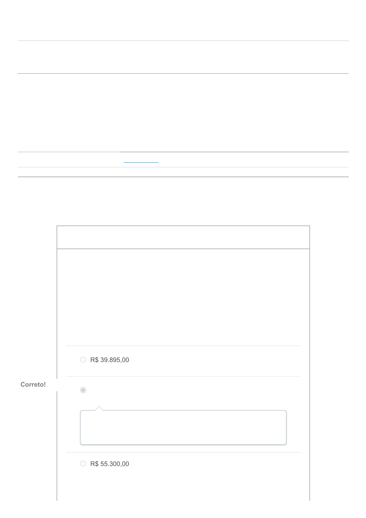 18/11/21, 17:52 Atividade Objetiva 05: Contabilidade de Instituições Financeiras e Mercados de Capitais - 2021/2 https://pucminas.instructure.com/courses/83102/quizzes/223037 1/4 Atividade Objetiva 05 Entrega 13 out em 23:59 Pontos 4 Perguntas 5 Disponível 27 set em 0:00 - 13 out em 23:59 17 dias Limite de tempo Nenhum Este teste foi travado 13 out em 23:59. Histórico de tentativas Tentativa Tempo Pontuação MAIS RECENTE Tentativa 1 61 minutos 4 de 4 Pontuação deste teste: 4 de 4 Enviado 13 out em 15:12 Esta tentativa levou 61 minutos. 0,8 / 0,8 ptsPergunta 1 Um investidor realiza uma compra a termo no dia 01/05/2017 de 10.000 ações do Usiminas ON (USIM3), com prazo de 2 meses e taxa de 1,10% a.m. Sendo a ação cotada a R$ 3,95 no momento da operação e a margem de 40%. Qual o valor do contrato a termo? R$ 39.895,00 R$ 40.373,78 Correto!Correto! O valor da operação no mercado a vista é de 3,95 * 10.000,00 = 39.500,00 acrescidos dos juros de 1,10 % a.m. no período de 2 meses = 40.373,7795 (VALOR A TERMO). R$ 55.300,00 https://pucminas.instructure.com/courses/83102/quizzes/223037/history?version=1 18/11/21, 17:52 Atividade Objetiva 05: Contabilidade de Instituições Financeiras e Mercados de Capitais - 2021/2 https://pucminas.instructure.com/courses/83102/quizzes/223037 2/4 R$ 39.500,00 0,8 / 0,8 ptsPergunta 2 A opção de compra dá direito ao titular de comprar o ativo objeto e obrigação, ao lançador, de vendê-lo. Qual o resultado do titular e do lançador, respectivamente, da opção PETRC20– R$ 2,00. Com a PETR4 sendo cotada a R$ 26,00? R$ 6,00 e – R$ 6,00 R$ 2,00 e – R$ 2,00 R$ 4,00 e – R$ 4,00 Correto!Correto! Caso a ação seja cotada a R$ 26,00, o titular, caso exerça seu direito, terá um resultado positivo de R$ 6,00 no exercício. Como teve um custo de R$ 2,00 pelo pagamento do prêmio, terá um resultado positivo líquido de R$ 4,00 e o lançador um resultado negativo de R$ 4,00. Infinito para ambos. 0,8 / 0,8 ptsPergunta 3 Um investidor realiza uma compra a termo no dia 01/05/2017 de 10.000 ações do Usiminas ON (USIM3), com prazo de 2 meses e taxa 18/11/21, 17:52 Atividade Objetiva 05: Contabilidade de Instituições Financeiras e Mercados de Capitais - 2021/2 https://pucminas.instructure.com/courses/83102/quizzes/223037 3/4 de 1,10% a.m. Sendo a ação cotada a R$ 3,95 no momento da operação e a margem de 40%. Caso o valor de mercado da USIM3 seja de R$ 4,50. Qual o resultado da operação? Positivo de R$ 5.500,00. Positivo de R$ 4.626,22. Correto!Correto! O valor da operação no mercado a vista é de 4,50 * 10.000,00 = 45.000,00 e do termo é de 40.373,7795. Assim, a operação terá um resultado positivo de 4.626,2205. Positivo de R$ 45.000,00. Negativo de R$ 11.173,78. 0,8 / 0,8 ptsPergunta 4 Um investidor realiza uma compra a termo no dia 01/05/2017 de 10.000 ações do Usiminas ON (USIM3), com prazo de 2 meses e taxa de 1,10% a.m. Sendo a ação cotada a R$ 3,95 no momento da operação e a margem de 40%. Qual a margem necessária, do comprador a termo, para montar a operação? R$ 15.800,00 R$ 16.149,51 R$ 14.926,22 18/11/21, 17:52 Atividade Objetiva 05: Contabilidade de Instituições Financeiras e Mercados de Capitais - 2021/2 https://pucminas.instructure.com/courses/83102/quizzes/223037 4/4 R$ 16.673,78 Correto!Correto! O valor da operação no mercado a vista é de 3,95 * 10.000,00 = 39.500,00 e do termo é de 40.373,7795. O cálculo da margem é 40% de 39.500 + (40.373,7795 – 39.500,00) = 16.673,7795 0,8 / 0,8 ptsPergunta 5 Leia o texto a seguir no qual foram retirados determinados elementos: O comprador de uma opção de compra (call option) tem ...................... de ...................... o ativo objeto pelo preço de ...................... . É denominado ...................... . Marque a alternativa que apresenta a sequência correta dos elementos retirados do texto: obrigação, vender, mercado, lançador obrigação, comprar, exercício, lançador direito, comprar, exercício, titular Correto!Correto! direito, comprar, mercado, titular O comprador de uma opção de compra é denominado titular, ele possui o direito de comprar o ativo objeto pelo preço de exercício. Pontuação do teste: 4 de 4