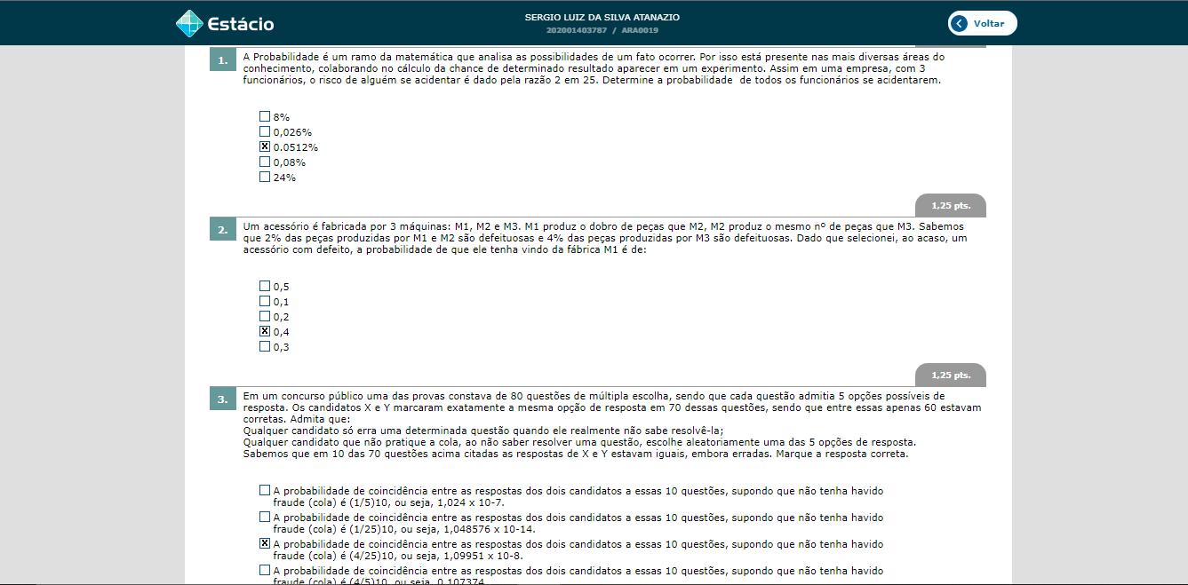 Em um concurso público uma das provas constava de 80 questões de múltipla escolha, sendo que cada questão admitia 5 opções possíveis de resposta. Os candidatos e Y marcaram exatamente a mesma opção de resposta em 70 dessas questões, sendo que entre essas apenas 60 estavam corretas. Admita que: Qualquer candidato só erra uma determinada questão quando ele realmente não sabe resolvê-la; Qualquer candidato que não pratique a cola, ao não saber resolver uma questão, escolhe aleatoriamente uma das 5 opções de resposta. Sabemos que em 10 das 70 questões acima citadas as respostas de e Y estavam iguais, embora erradas. Marque a resposta correta. A probabilidade de coincidência entre as respostas dos dois candidatos a essas 10 questões, supondo que não tenha havido fraude (cola) (1/5)10, ou seja, 1,024 x 10-7. A probabilidade de coincidência entre as respostas dos dois candidatos a essas 10 questões, supondo que não tenha havido fraude (cola) (1/25)10, ou seja, 1,048576 x 10-14. A probabilidade de coincidência entre as respostas dos dois candidatos a essas 10 questões, supondo que não tenha havido fraude (cola) é (4/25)10, ou seja, 1,09951 x 10-8.