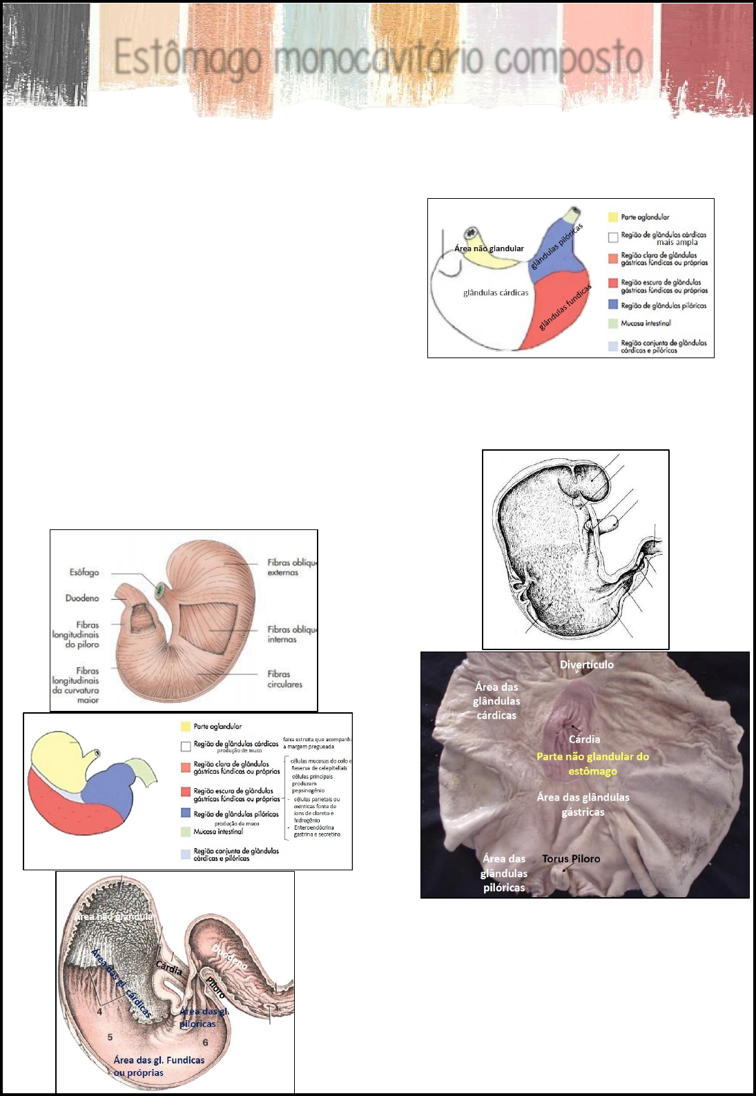 O estômago unicavitário composto possui uma parte glandular e outra aglandular. Esta presente no equino e no suíno. É um estômago relativamente pequeno, onde o cárdia se encontra relativamente fixo entre a 11ª costela. Possui um formato de “J” fortemente encurvado. O lado direito é mais curto do que o esquerdo. Está situado na parte dorsal da cavidade abdominal, sua face parietal e a caudal ao diafragma e ao fígado e a face visceral relaciona-se com a parte terminal do cólon maior, do cólon menor e do pâncreas. Unicavitário composto - Equinos O músculo do esfíncter que circundam a cárdia é bem desenvolvido (m. circular interno). A entrada do esôfago no estômago é oblíqua. Tem a capacidade de 5 a 15 litros. A camada de músculos do estômago possui uma diferença, na região da cárdia, a camada circular interna se espessa e vai formar o músculo esfincteriano. Envolvendo todas as camadas está a camada de fibras longitudinais. Entre a camada longitudinal externa e a camada obliqua interna, vai aparecer mais uma camada que é a camada circular média. Sendo então: longitudinal externa – circular média – obliqua interna. Outra diferença nos equinos é a chegada do esôfago no estômago, chegando em uma angulação oblíqua, se tornando outro fator que impede a regurgitação fácil nessa espécie. Unicavitário composto - Suínos No estômago dos suínos, na região próxima da área não glandular, possui um divertículo gástrico, mas não se sabe o motivo da presença dessa estrutura. A área aglandular do estômago envolve a abertura cárdica e se prolonga até o divertículo, que possui uma parte glandular e outra aglandular. Outra diferença no estômago dos suínos é a presença do toro pilórico, uma protuberância carnosa na saída do estômago para o intestino. Estômago monocavitário composto