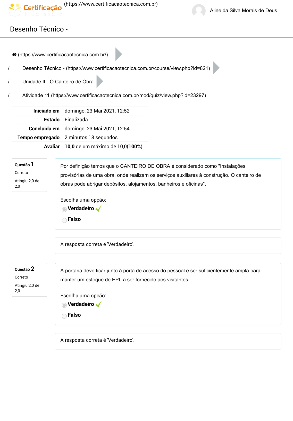 (https://www.certificacaotecnica.com.br) Aline da Silva Morais de Deus Desenho Técnico - Questão 1 Correto Atingiu 2,0 de 2,0 Questão 2 Correto Atingiu 2,0 de 2,0 / / / Iniciado em domingo, 23 Mai 2021, 12:52 Estado Finalizada Concluída em domingo, 23 Mai 2021, 12:54 Tempo empregado 2 minutos 18 segundos Avaliar 10,0 de um máximo de 10,0(100%) Por definição temos que o CANTEIRO DE OBRA é considerado como "Instalações provisórias de uma obra, onde realizam os serviços auxiliares à construção. O canteiro de obras pode abrigar depósitos, alojamentos, banheiros e oficinas". Escolha uma opção: Verdadeiro Falso A resposta correta é 'Verdadeiro'. A portaria deve ficar junto à porta de acesso do pessoal e ser suficientemente ampla para manter um estoque de EPI, a ser fornecido aos visitantes. Escolha uma opção: Verdadeiro Falso A resposta correta é 'Verdadeiro'. (https://www.certificacaotecnica.com.br/) Desenho Técnico - (https://www.certificacaotecnica.com.br/course/view.php?id=821) Unidade II - O Canteiro de Obra Atividade 11 (https://www.certificacaotecnica.com.br/mod/quiz/view.php?id=23297) https://www.certificacaotecnica.com.br/ https://www.certificacaotecnica.com.br/ https://www.certificacaotecnica.com.br/course/view.php?id=821 https://www.certificacaotecnica.com.br/mod/quiz/view.php?id=23297 Questão 3 Correto Atingiu 2,0 de 2,0 Questão 4 Correto Atingiu 2,0 de 2,0 Questão 5 Correto Atingiu 2,0 de 2,0 Capacidade para garantir o atendimento de todos os trabalhadores assentados no horário das refeições, Ter lavatório instalado em suas proximidades e Local para o aquecimento das refeições.Está se falando da(o): Escolha uma opção: a. Cozinha b. Área de lazer c. Local para as refeições d. Alojamento Sua resposta está correta. A resposta correta é: Local para as refeições. A guarita não deve controlar os acessos da Obra, apenas deve permitir a sua entrada na Obra, e pedir para colocar os Equipamentos de Proteção Individuais (EPIs). Escolha uma opção: Verdadeiro Falso A guarita deve poder controlar os acessos da Obra, anotando os acessos com nome e a identidade dos visitantes, não deve permitir a sua entrada na Obra, sem os Equipamentos de Proteção Individuais (EPIs). A resposta correta é 'Falso'. Esta Norma determina que seja elaborado o Programa de Condições e Meio Ambiente de Trabalho na Indústria da Construção - PCMAT, que é aplicado para canteiros de obras; áreas de vivência; demolições; escavações, fundações e desmonte de rochas; atividades envolvendo a carpintaria, armações de aço, estruturas de concreto, estruturas metálicas, operações de soldagem e de corte a quente; estruturas de proteção contra quedas (construção de andaimes, bandejas de proteção, guarda-corpos, rodapés, etc.); serviços de construção e manutenção de telhados; trabalhos em locais confinados; instalação e manutenção de sinalização de segurança e atividades relacionadas com o estabelecimento da ordem e limpeza nos locais de trabalho; e atividades de treinamento, dentre outras. Escolha uma opção: a. NR05 b. NR10 c. NR23 d. NR18 Sua resposta está correta. A resposta correta é: NR18.