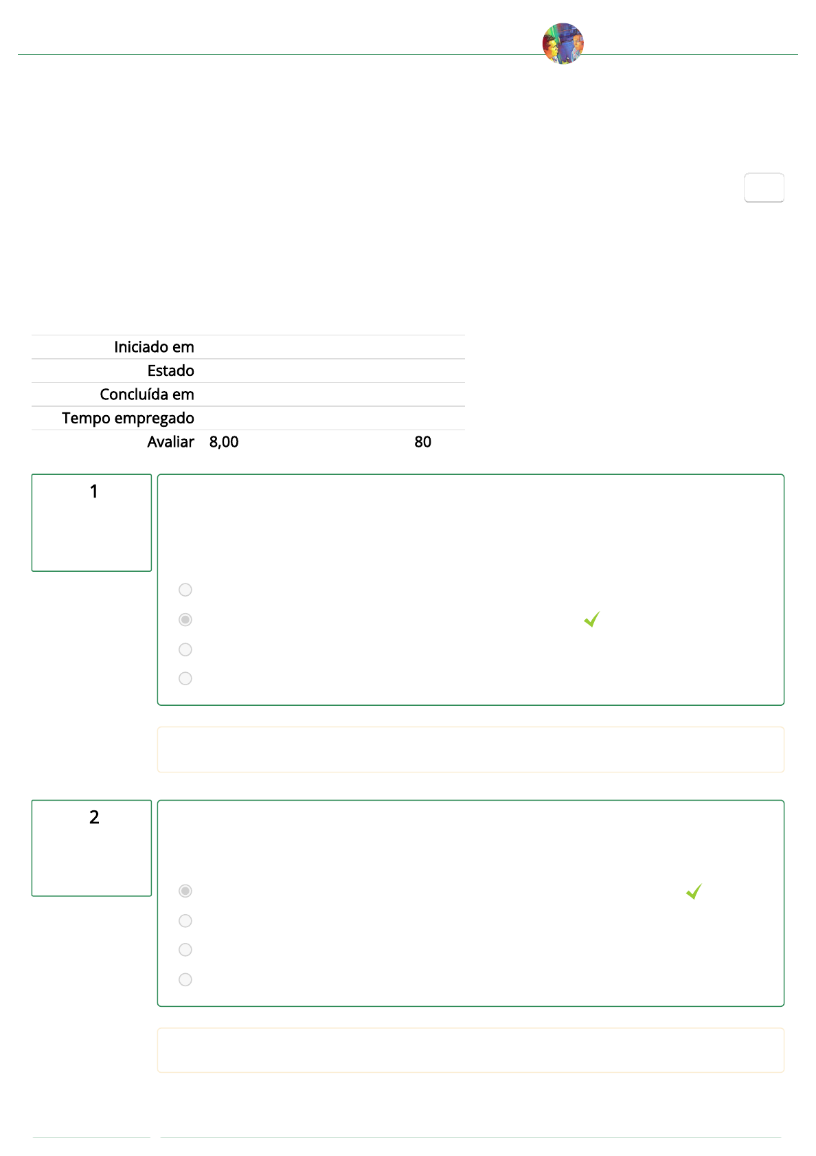 Questão 1 Correto Atingiu 1,00 de 1,00 Questão 2 Correto Atingiu 1,00 de 1,00 Meus cursos EAD Técnico em Administração Técnico em Administração 2021 Módulo 02 ADM M02-2021 Contabilidade Geral Semana 2 Questionário - Semana 2 Iniciado em sábado, 20 nov 2021, 14:04 Estado Finalizada Concluída em sábado, 20 nov 2021, 14:37 Tempo empregado 33 minutos 7 segundos Avaliar 8,00 de um máximo de 10,00(80%) Marque a alternativa que corresponde a contas que pertence ao bens da empresa. Escolha uma opção: a. boletos a pagar, �nanciamentos a pagar, duplicatas a receber b. caixa, estoque, máquinas e equipamentos, veículos. c. Veículos, boletos a pagar, caixa, patrimônio líquido. d. cheques a receber, boletos a receber, duplicatas a receber, estoque. Sua resposta está correta. Marque a alternativa que corresponde ao objetivo/finalidade da contabilidade Escolha uma opção: a. Registrar, controlar e publicar os fatos administrativos da empresa. b. Calcular e registrar os valores de impostos a serem pagos pela empresa. c. Pagar impostos. d. Analisar as dívidas da empresa. Sua resposta está correta. Elisson Márcio Moura Silva 2 https://ifs.ava.ifsuldeminas.edu.br/ https://ifs.ava.ifsuldeminas.edu.br/course/index.php?categoryid=4 https://ifs.ava.ifsuldeminas.edu.br/course/index.php?categoryid=6 https://ifs.ava.ifsuldeminas.edu.br/course/index.php?categoryid=26 https://ifs.ava.ifsuldeminas.edu.br/course/view.php?id=115 https://ifs.ava.ifsuldeminas.edu.br/course/view.php?id=115§ion=2 https://ifs.ava.ifsuldeminas.edu.br/mod/quiz/view.php?id=11369 Questão 3 Correto Atingiu 1,00 de 1,00 Faça o registro dos fatos abaixo no Balanço Patrimonial da Empresa Heróis da Marvel S/A de acordo com o método das partidas dobradas. a. Constituição da empresa, pelos sócios, no valor de R$ 150.000,00 em dinheiro. b. Aquisição de uma máquina para produção no valor de R$ 40.000,00. Aquisição a prazo em forma de boletos. c. Compra de matéria-prima para produção no valor de R$ 4.500,00. Compra a vista. d. Aquisição, a prazo, em forma de boletos de um veículo no valor de R$ 45.000,00. e. Transferência de R$ 3.000,00 da conta caixa para a conta da empresa no Banco do Brasil. f. Compra de um balcão, a vista, no valor de R$ 800,00. Marque a alternativa que corresponde ao valor total do Passivo da empresa Heróis da Marvel S/A. Escolha uma opção: a. R$ 235.000,00 b. R$ 14.500,00 c. R$ 125.000,00 d. R$ 85.000,00 Sua resposta está correta. Questão 4 Incorreto Atingiu 0,00 de 1,00 Faça o registro dos fatos abaixo no Balanço Patrimonial da Empresa Heróis da Marvel S/A de acordo com o método das partidas dobradas. a. Constituição da empresa, pelos sócios, no valor de R$ 150.000,00 em dinheiro. b. Aquisição de uma máquina para produção no valor de R$ 40.000,00. Aquisição a prazo em forma de boletos. c. Compra de matéria-prima para produção no valor de R$ 4.500,00. Compra a vista. d. Aquisição, a prazo, em forma de boletos de um veículo no valor de R$ 45.000,00. e. Transferência de R$ 3.000,00 da conta caixa para a conta da empresa no Banco do Brasil. f. Compra de um balcão, a vista, no valor de R$ 800,00. Marque a alternativa que corresponde ao valor total dos bens que a empresa Heróis da Marvel S/A possui após os registros contábeis. Escolha uma opção: a. 150.000,00 b. R$ 134.000,00 c. R$ 232.000,00 d. 235.000,00 Sua resposta está incorreta. Questão 5 Correto Atingiu 1,00 de 1,00 a. Faça o registro dos fatos listados abaixo no Balanço Patrimonial da empresa Maria Empreendimentos LTDA. Veículos no valor de R$ 15.500,00 Boletos a pagar no valor de R$ 23.450,00 Fornecedores a pagar no valor de R$ 2.300,00 Máquinas e Equipamentos no valor de R$ 45.500,00 Salários a pagar no valor de R$ 34.500,00 Financiamentos a pagar no valor de R$ 50.000,00 Caixa no valor de R$ 22.500,00 Boletos a receber no valor de R$ 22.300,00 Cheques a pagar no valor de R$ 5.000,00 Cheques a receber no valor de R$ 13.800,00 Estoque no valor de R$ 16.000,00 Some o total dos Bens. Some o total dos Direitos. Some o total das Obrigações e calcule a real liquidez da empresa Maria Empreendimentos Ltda. Equação da Real Liquidez: PL = (bens + direitos) – obrigações PL = PL = Marque a alternativa que corresponde ao valor da Real Liquidez da empresa Maria Empreendimentos Ltda. Escolha uma opção: a. R$ 24.550,00 b. R$ 11.000,00 c. R$ 20.350,00 d. R$ 13.400,00 Sua resposta está correta. Questão 6 Correto Atingiu 1,00 de 1,00 Questão 7 Correto Atingiu 1,00 de 1,00 Qual o objeto de estudo da contabilidade? Escolha uma opção: a. O patrimônio das empresas b. O Balanço Patrimonial da empresa c. O patrimônio líquido. d. Estudar e controlar o patrimônio das empresas. Sua resposta está correta. Marque a alternativa que corresponde corretamente a definição de patrimônio Escolha uma opção: a. Conjunto de bens, direitos, boletos a receber e patrimônio líquido. b. Conjunto de bens, direitos, obrigação e patrimônio líquido de uma empresa ou pessoa. c. Conjunto de bens, direitos e obrigações. d. Conjunto de dívidas que a pessoa contraiu ao longo do período em que administrou a empresa. Sua resposta está correta. Questão 8 Correto Atingiu 1,00 de 1,00 a. Faça o registro dos fatos listados abaixo no Balanço Patrimonial da empresa Maria Empreendimentos LTDA. Veículos no valor de R$ 15.500,00 Boletos a pagar no valor de R$ 23.450,00 Fornecedores a pagar no valor de R$ 2.300,00 Máquinas e Equipamentos no valor de R$ 45.500,00 Salários a pagar no valor de R$ 34.500,00 Financiamentos a pagar no valor de R$ 50.000,00 Caixa no valor de R$ 22.500,00 Boletos a receber no valor de R$ 22.300,00 Cheques a pagar no valor de R$ 5.000,00 Cheques a receber no valor de R$ 13.800,00 Estoque no valor de R$ 16.000,00 Some o total dos Bens. Some o total dos Direitos. Some o total das Obrigações e calcule a real liquidez da empresa Maria Empreendimentos Ltda. Equação da Real Liquidez: PL 