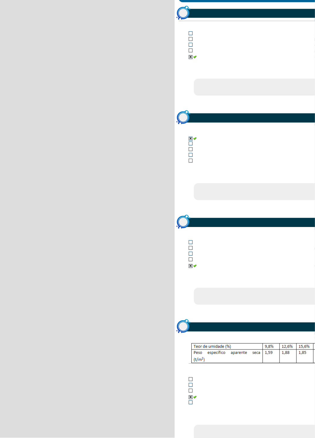 Um saprólito é: Um solo que é formado da ação do vento sobre solos sedimentares. Um solo que não mantém a estrutura original da rocha-matriz, perdendo totalmente sua consistência. Um maciço de rocha que sofre decomposição em três eixos diferentes. Um solo que perdeu toda a estrutura original da rocha-matriz. É relativamente homogêneo. Um solo que mantém a estrutura original da rocha-matriz, mas perdeu totalmente sua consistência. Explicação: Resposta correta: Um solo que mantém a estrutura original da rocha-matriz, mas perdeu totalmente sua consistência. Não é um agente que provoca metamorfismo em rochas: Alta incidência do vento Ação de pressões tectônicas Aumento de pressão Ação da água Aumento de temperatura Explicação: Resposta correta: Alta incidência do vento Assinale o que se pode dizer sobre linhas de fluxo e linhas equipotenciais. Linhas equipotenciais determinam o caminho percorrido pela água. Linhas de fluxo determinam a mesma carga hidráulica em toda a sua extensão. Linhas de fluxo e equipotenciais nunca são perpendiculares. Linhas equipotenciais e de fluxo são importantes na permeabilidade monodirecional. Linhas de fluxo e linhas equipotenciais determinam a rede de fluxo de percolação. Explicação: A resposta certa é: Linhas de fluxo e linhas equipotenciais determinam a rede de fluxo de percolação. Numa série de cinco ensaios de compactação foram obtidos os seguintes resultados: Dentre as opções abaixo, assinale a umidade ótima. 10% de umidade 17% de umidade 20% de umidade 14% de umidade 12% de umidade Explicação: A resposta certa é: 14% de umidade Questão11a Questão22a Questão33a Questão44a Um saprólito é: Um solo que é formado da ação do vento sobre solos sedimentares. Um solo que não mantém a estrutura original da rocha-matriz, perdendo totalmente sua consistência. Um maciço de rocha que sofre decomposição em três eixos diferentes. Um solo que perdeu toda a estrutura original da rocha-matriz. É relativamente homogêneo. Um solo que mantém a estrutura original da rocha-matriz, mas perdeu totalmente sua consistência. Explicação: Resposta correta: Um solo que mantém a estrutura original da rocha-matriz, mas perdeu totalmente sua consistência. Não é um agente que provoca metamorfismo em rochas: Alta incidência do vento Ação de pressões tectônicas Aumento de pressão Ação da água Aumento de temperatura Explicação: Resposta correta: Alta incidência do vento Assinale o que se pode dizer sobre linhas de fluxo e linhas equipotenciais. Linhas equipotenciais determinam o caminho percorrido pela água. Linhas de fluxo determinam a mesma carga hidráulica em toda a sua extensão. Linhas de fluxo e equipotenciais nunca são perpendiculares. Linhas equipotenciais e de fluxo são importantes na permeabilidade monodirecional. Linhas de fluxo e linhas equipotenciais determinam a rede de fluxo de percolação. Explicação: A resposta certa é: Linhas de fluxo e linhas equipotenciais determinam a rede de fluxo de percolação. Numa série de cinco ensaios de compactação foram obtidos os seguintes resultados: Dentre as opções abaixo, assinale a umidade ótima. 10% de umidade 17% de umidade 20% de umidade 14% de umidade 12% de umidade Explicação: A resposta certa é: 14% de umidade Questão11a Questão22a Questão33a Questão44a 20/11/2021 17:44 Página 1 de 2 A resposta certa é: 14% de umidade O diagrama de Newmark apresentado a seguir foi criado para um solo: Sobre esse diagrama, assinale a alternativa correta: Todos as seções dentro da região r = 0,27z representam cargas induzidas diferentes. Quanto menor o raio do círculo, menor a carga induzida que ele representa. Quanto maior o raio do círculo, menor a carga induzida que ele representa. Áreas iguais do círculo representam cargas induzidas iguais. Círculos com raio r = 0,40z representam uma carga menor que aqueles com raio r = 0,27z. Explicação: A resposta certa é: Quanto menor o raio do círculo, menor a carga induzida que ele representa. Observe, a seguir, uma curva de ensaio de adensamento: Imagem: Adaptado de Lima (1998b, p. 9). O objetivo dessa curva é: Relacionar a deformação da amostra com o índice de vazios. Relacionar o índice de vazios com o peso específico da amostra. Relacionar o tempo de ensaio com o índice de vazios. Relacionar o tempo de ensaio com a deformação da amostra. Relacionar o peso específico com o tempo de ensaio. Explicação: A resposta certa é:Relacionar o tempo de ensaio com a deformação da amostra. Questão55a Questão66a A resposta certa é: 14% de umidade O diagrama de Newmark apresentado a seguir foi criado para um solo: Sobre esse diagrama, assinale a alternativa correta: Todos as seções dentro da região r = 0,27z representam cargas induzidas diferentes. Quanto menor o raio do círculo, menor a carga induzida que ele representa. Quanto maior o raio do círculo, menor a carga induzida que ele representa. Áreas iguais do círculo representam cargas induzidas iguais. Círculos com raio r = 0,40z representam uma carga menor que aqueles com raio r = 0,27z. Explicação: A resposta certa é: Quanto menor o raio do círculo, menor a carga induzida que ele representa. Observe, a seguir, uma curva de ensaio de adensamento: Imagem: Adaptado de Lima (1998b, p. 9). O objetivo dessa curva é: Relacionar a deformação da amostra com o índice de vazios. Relacionar o índice de vazios com o peso específico da amostra. Relacionar o tempo de ensaio com o índice de vazios. Relacionar o tempo de ensaio com a deformação da amostra. Relacionar o peso específico com o tempo de ensaio. Explicação: A resposta certa é:Relacionar o tempo de ensaio com a deformação da amostra. Questão55a Questão66a 20/11/2021 17:44 Página 2 de 2