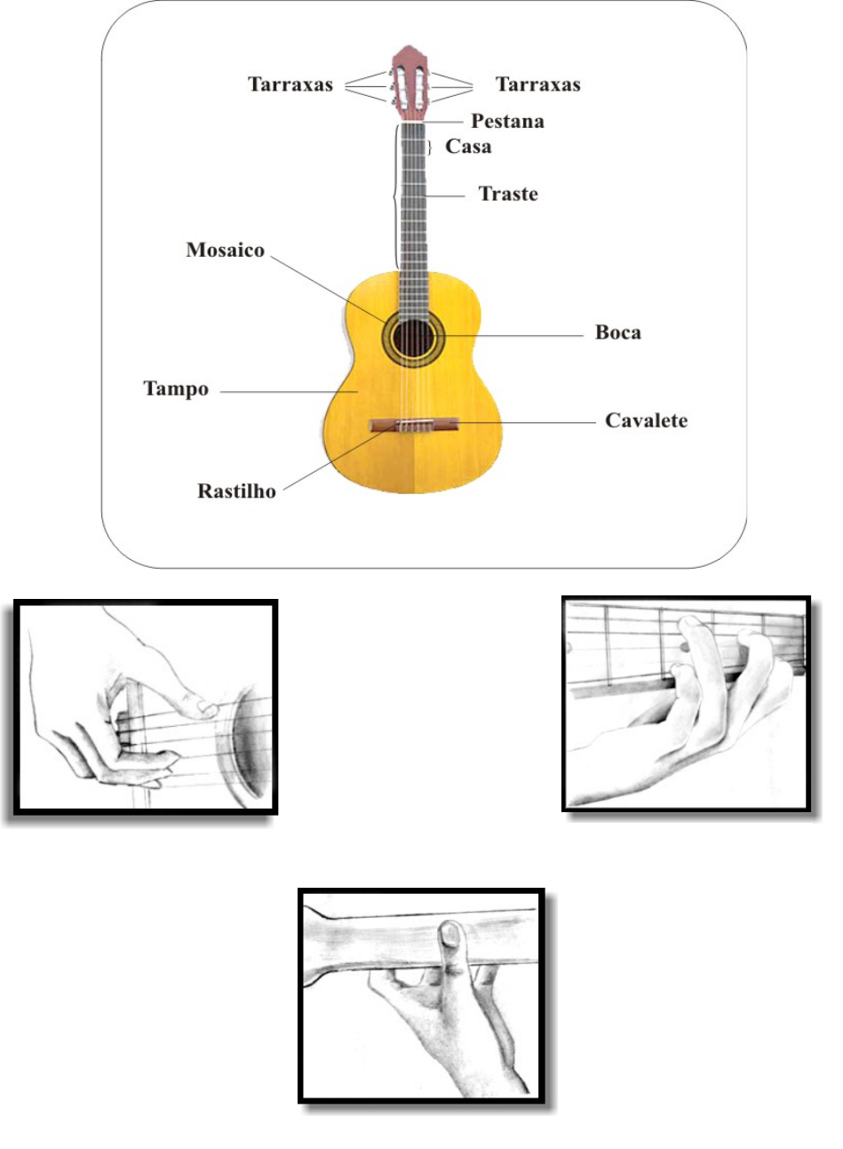 APOSTILA DE VIOLÃO 1 “Louvem a Deus com trombetas. Louvem com harpas e liras. Louvem o Senhor com pandeiros e danças. Louvem com instrumentos de cordas e flautas. Louvem a Deus com pratos sonoros Louvem bem alto com pratos ressonantes. Todos seres vivos, louvem o Senhor! Aleluia!” Salmo 150: 4-6 “Bom é render graças ao SENHOR e cantar louvores ao teu nome, ó Altíssimo (…). Com instrumentos de dez cordas, com saltério e com a solenidade da harpa.” Salmo 92: 1, 3 “[Jesus disse:] Deus é espírito; e importa que os seus adoradores o adorem em espírito e em verdade.” João 4:24 Edição de 2017 Contatos: marciokobax@gmail.com mailto:marciokobax@yahoo.com.br Sumário Introdução 2 1) Nota Musical, Acorde e Compasso 3 2) Escala Cromática 5 3) Escala Diatônica 7 4) Afinação do Violão 9 5) Dedilhado 11 6) Acordes Maiores e Menores 12 7) Acordes com 7M, 7, 9, 4 e Ritmos 13 8) Escala Pentatônica e Compassos de Três Tempos 15 9) Acordes com Baixos e Diminutos 16 10) Campo Harmônico 17 11) Dicionário de Acordes 18 12) Vamos Praticar? 20 Introdução Essa Apostila de Violão apresenta o conteúdo de dez aulas para o ensino de violão e mais dois anexos: um dicionário de acordes e hinos bíblicos para musicalizar. Estas dez aulas podem caminhar paralelamente com a apostila Adoração e Louvor, que contém dez estudos para o discipulado de ministros de louvor (http://igrejanascasas.com/index.php/violao/). A proposta é que, em cada aula, o estudante tenha oportunidade de ser ministrado em uma dessas palavras e que também possa aprender um louvor por aula. Para isso, o estudante deve também obter a Apostila de Cifras, contendo as dez músicas cifradas correspondentes às dez aulas (http://igrejanascasas.com/index.php/violao/). Isso significa que ao todo temos três apostilas complementares para o aprendizado de violão. A finalidade principal desse material é preparar jovens para ministrar louvores a Deus fazendo uso do violão. Objetiva-se que ao final do curso eles tenham percepção musical suficiente para fazer a leitura de cifras e que consigam ministrar canções em conjunto com outros instrumentos e vozes. Por isso é que dispensou-se o ensino de partituras, tablaturas e modos gregos, uma vez que entende-se que estes assuntos dificultariam a rapidez com que os objetivos principais seriam atingidos. Que sejam abençoados, pelo nome de Jesus Cristo, cada um dos estudantes e professores de violão! 2 1) NOTA MUSICAL, ACORDE E COMPASSO Nota musical é um sinal sonoro, que pode ser representado assim: Abaixo temos o exemplo de oito notas musicais: Cada uma das seis cordas do violão soltas possuem as seguintes notas musicais, da corda mais grossa para a mais fina: Mi, Lá , Ré, Sol, Si, Mi. Acorde é um conjunto de duas ou mais notas musicais. Os acordes mais básicos podem ser maiores ou menores, e são representados por letras simbólicas, chamadas cifras: A B C D E F G Lá maior Si maior Dó maior Ré maior Mi maior Fá maior Sol maior Am Bm Cm Dm Em Fm Gm Lá menor Si menor Dó menor Ré menor Mi menor Fá menor Sol menor É assim que podemos formar os acordes mais básicos: 3 Dedos da mão esquerda: 1 - Indicador 2 - Médio 3 - Anular 4 – Mínimo Dedos da mão direita: P - Polegar I - Indicador M - Médio A – Anular Compasso é um intervalo de tempo que reúne um grupo de notas musicais e define qual é o ritmo da música. Cada compasso normalmente tem dois, três ou quatro tempos. Podemos entender os tempos como se fossem pulsações rítmicas. O compasso binário é constituído de dois tempos, o compasso ternário é constituído de três tempos e o compasso quaternário é constituído de quatro tempos, e este é o mais comum. Também é possível criar compassos com mais tempos. A barra do compasso é a linha vertical usada para fazer a separação entre os compassos. Por isso, podemos dizer que um compasso é o intervalo de tempo que está delimitado por duas barras: │ │ Os compassos da música Teu Amor me Libertou são quaternários, ou seja, possuem quatro tempos em cada um: │ 1 2 3 4 │ Antes de começar a tentar tocar essa música, é necessário primeiro conseguir fazer esses três acordes: Mi menor (Em), Dó maior (C) e Ré maior (D). Para tocar essa música, vamos bater nas cordas do violão para baixo uma vez em cada tempo, repetindo em voz alta a contagem de 1, 2, 3, 4 de cada compasso. Experimente tocar essa música usando essa sequência de cifras: │ Em │ C │ D │ Em │ Em │ C │ D │ Em │ Em │ C │ D │ Em │ Quando queremos mostrar que um trecho da música deve ser repetido podemos desenhar duas barras com dois pontos (▐│:) para indicar o início do trecho que vai ser repetido, e dois pontos com duas barras (:│▌) para indicar qual é o final do trecho que vai ser repetido. Por isso também podemos simplificar a linha com as cifras descritas acima dessa maneira: ▐│: Em │ C │ D │ Em :│▌ 4 2) ESCALA CROMÁTICA Antes de começar a tentar tocar a música Sua Presença é Real, precisamos aprender a fazer o acorde de Sol maior (G). Essa música também é quaternária e por isso vamos manter a contagem de 1, 2, 3, 4 em cada compasso. Mas dessa vez, iremos aumentar a dificuldade batendo nas cordas do violão duas vezes em cada tempo, uma vez para baixo e outra para cima. Então, ao invés de quatro batidas, vamos passar a ter oito batidas em cada compasso. As cifras dessa canção também se repetem e você pode experimentar tocá-las assim: ▐│: G │ C │ D │ G :│▌ A partir daqui passaremos a estudar as notas musicais com mais detalhes. A escala cromática é o nome dado ao conjunto destas doze notas musicais: Dó – Dó# – Ré – Ré# – Mi – Fá – Fá# – Sol – Sol# – Lá – Lá# – Si Onde está escrito #, devemos ler sustenido. Essas notas correspondem as teclas brancas e pretas do piano e se encontram nestas posições no braço do violão: Agora vamos a um exercí