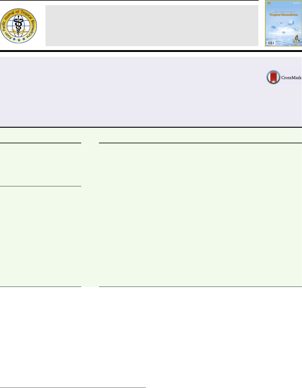 Contents lists available at ScienceDirect Asian Pac J Trop Biomed 2017; 7(8): 712–718712 Asian Pacific Journal of Tropical Biomedicine journal homepage: www.elsevier.com/locate/apjtb Original article http://dx.doi.org/10.1016/j.apjtb.2017.07.015 *Corresponding author: Sidnei Moura, Technology Department, Biotechnology Institute, University of Caxias do Sul, 1130 Francisco Getúlio Vargas St., CEP 95070- 560, Caxias do Sul, Brazil. Tel: +55 54 3218 2100 E-mail: sidnei.moura@ucs.br (S. Moura). Peer review under responsibility of Hainan Medical University. The journal implements double-blind peer review practiced by specially invited international editorial board members. 2221-1691/Copyright © 2017 Hainan Medical University. Production and hosting by Elsevier B.V. This is an open access artic creativecommons.org/licenses/by-nc-nd/4.0/). Rourea cuspidata: Chemical composition and hypoglycemic activity Manuela M. Laikowski1, Paulo R. dos Santos1, Debora M. Souza1, Luciane Minetto1, Natalia Girondi2, 2 2 3 1,2 1* Camila Pires , Gisiele Alano , Mariana Roesch-Ely , Leandro Tasso , Sidnei Moura 1Laboratory of Natural and Synthetics Products, University of Caxias do Sul, Caxias do Sul, Brazil 2Laboratory of Pharmacology, University of Caxias do Sul, Caxias do Sul, Brazil 3Laboratory of Genomics, Proteomics and DNA Repair, University of Caxias do Sul, Caxias do Sul, Brazil ARTICLE INFO Article history: Received 23 Jun 2017 Received in revised form 13 Jul 2017 Accepted 26 Jul 2017 Available online 4 Aug 2017 Keywords: Rourea cuspidata Diabetes Phytochemical characterization HRMS ABSTRACT Objective: To investigate the antidiabetic effect of Rourea cuspidata hydroalcoholic stem extract in normal and streptozotocin-induced diabetic rats. Methods: In order to evaluate the chemical composition, different extracts from stem in ascending solvent order of polarity were prepared. The extracts were analyzed by high resolution mass spectrometry and 7 compounds were identified, including hyperin, an important and already reported active compound in the literature. Hyperin was also quantified by HPLC-UV in all the extracts. The hydroalcoholic stem extract (Ss5), which showed the highest concentration of hyperin, was administered to STZ-induced diabetes rats to evaluate the potential hypoglycemic activity. Total cholesterol, HDL, triglycerides, ALT and AST were also evaluated. In the present study, the effects of oral administration of hydroalcoholic stem extract (200 mg/kg b. wt.) for 28 days on the level of serum glucose, total cholesterol, HDL, triglycerides, aspartate amino transferase (AST) and alanine amino transferase (ALT) in normal and streptozotocin-induced diabetic rats were evaluated. Histopathological changes in diabetic rats' pancreas were also studied. Results: The extract exposition demonstrated hypoglycemic effect like the drug control glibenclamide. The extract was able to increase the HDL levels. Histopathological study on diabetic rats' pancreas after extract treatment showed morphological alterations in STZ-induced diabetes rats, which were apparently restored after extract treatment. Conclusions: This work demonstrates the potential use of R. cuspidata as hypoglycemic agent in the treatment of diabetes. 1. Introduction Brazil is known for its biodiversity with 40–55 thousand plant species distributed across several biomes with a large number of plants used by the population in folk medicine [1]. The Connaraceae family comprises twenty genera and about 350 species distributed in Africa, Southeast Asia and tropical America [2]. In tropical America, this family is formed by five genera and among them Connarus and Rourea are the most representative ones. Rourea is a pantropical genus with about 100 species, 48 of them are in the Neotropics [3,4]. In Brazil, Connaraceae family native species are found mainly in the Amazonic region [5]. Few species of Rourea genus have been screened so far for their biological activities. Among them, the antidiabetic and antimalarial potential of Rourea minor (R. minor), antioxidant and hepatoprotective activities of Rourea induta and anti- inflammatory and hepatoprotective activities of Rourea cocci- nea can be noticed [6–8]. According to phytochemical investigations on Rourea spe- cies, it was described that two glycoside derivatives (rourinoside and rouremin) and derivative [1-(26-hydroxyhexacosanoyl)- glycerol], actives as antimalarial, as well as nor-sesquiterpene (dihydrovomifoliol-9-b-D glucopyranoside) were present in R. minor [8]. It was also described that the compounds quinone (rapanone) and cianidine (leucopelargonidine) were from le under the CC BY-NC-ND license (http:// http://dx.doi.org/10.1016/j.apjtb.2017.07.015 mailto:sidnei.moura@ucs.br http://crossmark.crossref.org/dialog/?doi=10.1016/j.apjtb.2017.07.015&domain=pdf www.sciencedirect.com/science/journal/22211691 http://www.elsevier.com/locate/apjtb http://dx.doi.org/10.1016/j.apjtb.2017.07.015 http://creativecommons.org/licenses/by-nc-nd/4.0/ http://creativecommons.org/licenses/by-nc-nd/4.0/ Manuela M. Laikowski et al./Asian Pac J Trop Biomed 2017; 7(8): 712–718 713 Rourea santaloides [9]. From Rourea microphylla, flavonoids (quercetin, quercetin 3-O-b-L rhamnopyranoside, astilbin, hyperin, rutin, and kaempferol), anthraquinones (physcion and erythroglaucin), triterpenes (23-hydroxybetulinic acid, ursolic acid and hederagenin), coumarin (daphnetin), phytosteroids (b- sitosterol, b-sitosteryl-b-D-glucopyranoside), besides fatty acids, alkane, alcohol, and glycery derivative were found [10,11]. From the leaves of Rourea induta, flavonoids were found (such as quercetin, hyperin, quercetin 3-O-a-L-arabinofuranoside, and quercetin 3-O-b-D-xylopyranoside) [3]. Rourea cuspidata (R. cuspidate) Benth ex. Baker popularly known in Brazil as ‘miraruíra’, ‘cipó miraruíra’, and ‘muirar- uíra’, is a shrub of the Connaraceae family, common in Ama- zonic region [12], which is used for d