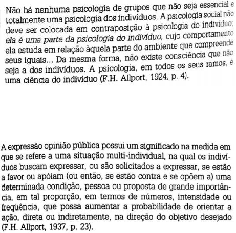 Cap. 6 _ As Raízes da psicologia social moderna_ domingo, 6 de setembro de 2020 16:12 Leitura: As Raízes da psicologia social moderna_ Cap. 6 A individualização da psicologia social na américa do Norte_ Roberto M. Farr · Pelo menos desde a época do Renascimento, o individualismo tem sido um componente essencial da tradição intelectual do ocidente; · No ramo ocidental da cristandade, a Reforma reforçou a causa da individualidade. (...) A perseguição no Velho Mundo levou a uma migração seletiva para o Novo Mundo. Isto por sua vez, levou o individualismo a tornar-se um valor mais central na América do Norte, do que na Europa Central; · Ideologia fica igualada às crenças coletivas, quando o objeto destas crenças é o indivíduo, isto não é entendido como ideologia - ao contrário é visto como uma antítese da ideologia; · As raízes do individualismo estão enterradas no solo de toda a tradição intelectual do ocidente, mas seu florescimento é um fenômeno caracteristicamente americano; · Se o individualismo é um valor central dentro de uma cultura particular, então deveria ser possível detectar seus efeitos na história da ciência social; · No período que seguiu à segunda guerra mundial, as ciências sociais do comportamento, passaram a ser chamadas de ciências do comportamento; · Na época a psicologia social não tinha tanto investimento porque os políticos não distinguiam ciências sociais e socialismo; · F. H. Allport em 1924 escreve o livro ‘Psicologia social’, ele propõe construir a psicologia social como uma ciência comportamental e experimental. As relações entre seu behaviorismo e seu individualismo ficam bastante explicitas na forma como ele delimita o campo da psicologia social; · F. H. Allport foi um crítico severo de todas as pessoas que parecessem estar atribuindo capacidade de ação a qualquer outra entidade que não o indivíduo; · G.W Allport “Com poucas exceções, os psicólogos sociais veem sua disciplina como uma tentativa de entender e explicar como o pensamento, o afeto e o comportamento dos indivíduos são influenciados pela presença real, imaginada ou implícita de outros.”; · Para F. H. Allport a realidade ultima é o comportamento, só os indivíduos se comportam; · Ele não se recusa a falar sobre termos como consciência ou mente. A consciência, entretanto, é a consciência dos indivíduos. É ocioso falar de consciência de multidão, uma multidão não possui sistema nervoso; · “Quando os indivíduos se tornam agentes da instituição, deixam de ser agentes moralmente autônomos”; · Os estados unidos receberam muitos estudiosos no período do Nazismos, principalmente alemães, o que influenciou a psicologia ali; · E foi quando os psicólogos da Gestalt migraram para os estados unidos que se depararam com o behaviorismo e quando isso ocorreu se opuseram a ele; · Gestalt tb teve influencia no individualismo da psicologia social criada nos estados unidos; · Heider afirmou que era difícil representar o espeço vital de um individuo dentro do espeço vital e outro indivíduo, quando tratamos de relações sociais; · As formulações de Lewin sobre o espaço vital psicológico do individuo são muito mais individualizantes do que a concepção da psicologia das relações interpessoais de Heider; · Heider foi mais decisivo no desenvolvimento da psico social nos estados unidos e quem instituiu a psico social experimental lá na era moderna, da mesma forma que F. H. Allport duas décadas antes a institui como uma ciência comportamental e experimental; · Ambos individualizaram a psicologia social, tanto em termos de teoria, behaviorismo e Gestalt, como em metodologia, experimental; · O individualismo com um valor cultural central também se evidencia na história da psicologia no geral, não apenas da social;