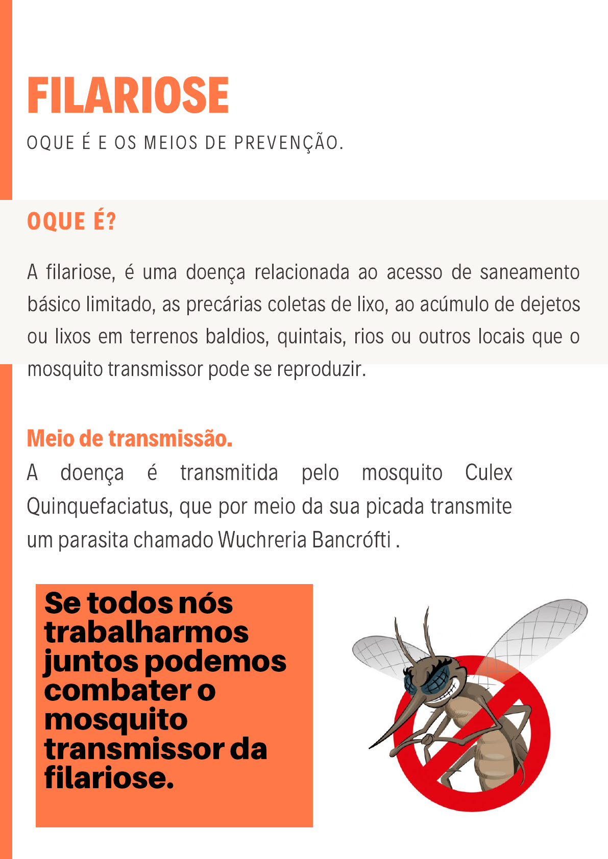 FILARIOSE OQUE É E OS MEIOS DE PREVENÇÃO . A filariose, é uma doença relacionada ao acesso de saneamento básico limitado, as precárias coletas de lixo, ao acúmulo de dejetos ou lixos em terrenos baldios, quintais, rios ou outros locais que o mosquito transmissor pode se reproduzir. OQUE É? Meio de transmissão. A doença é transmitida pelo mosquito Culex Quinquefaciatus, que por meio da sua picada transmite um parasita chamado Wuchreria Bancrófti . Se todos nós trabalharmos juntos podemos combater o mosquito transmissor da filariose.