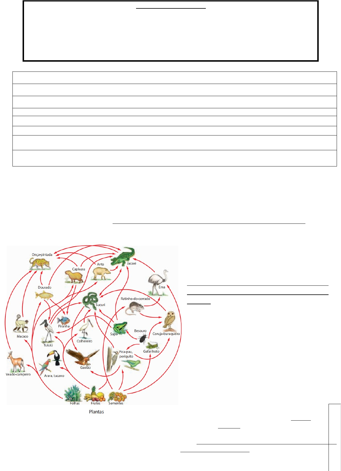 LOGO E NOME DA ESCOLA NOME DO ALUNO: Disciplina: Biologia Professor(a): Série: 1ª EM Período de realização: Objetivo: Conhecer os conceitos de Ecologia e relações alimentares Habilidades: Descrever as relações alimentares que se estabelecem entre os seres vivos que participam de cadeias e teias alimentares. Orientações: Leia com atenção e preste atenção à imagem. Toda resposta ou anotação feitas nas atividades serão levadas em consideração para tentar te beneficiar. Então não deixe nada em branco. Teias alimentares Anteriormente, você estudou como é possível compor uma cadeia alimentar em um ambiente com capim e animais, como gafanhotos, pássaros, serpentes etc. Mas as relações tróficas não são tão simples como uma linha com setas em uma só direção para o próximo ser vivo. Um mesmo animal pode servir de alimento a vários outros animais, ao mesmo tempo, ou ao longo de dias, ou então que esse animal pode se alimentar de vários seres vivos diferentes. Isso significa que diversas cadeias alimentares podem se interligar, formando uma teia. Assim, chama-se teia alimentar a representação gráfica das relações tróficas (alimentares) entre os seres vivos que habitam um determinado ambiente. Veja na imagem um exemplo de teia alimentar que ocorre na região do Pantanal: Níveis tróficos e os decompositores Toda cadeia alimentar tem início em um ser vivo autotrófico: uma planta, uma alga ou mesmo uma bactéria. Esse ser vivo é responsável pela fabricação do alimento que flui por toda a cadeia alimentar, razão pela qual ele é chamado de produtor, e os outros seres vivos da cadeia, de consumidores. Observe mais uma vez a cadeia alimentar que vimos no texto anterior: Capim gafanhoto roedor serpente gavião Nessa cadeia, o capim é o produtor e os animais (gafanhoto, roedor, serpente e gavião) são os consumidores. Cada ser vivo da cadeia alimentar pertence a um nível trófico diferente. O produtor (autotrófico), que sempre inicia a cadeia, pertence ao primeiro nível trófico. No segundo nível trófico está o ser vivo que se alimenta diretamente do produtor e por isso é chamado de consumidor primário; no terceiro nível trófico, o ser vivo que se alimenta do consumidor primário, ou seja, o consumidor secundário; e assim por diante.Os decompositores - Quando os produtores e os consumidores dos vários níveis tróficos morrem, o corpo deles serve de alimento a certos fungos e bactérias e também a alguns insetos e vermes. Ao se alimentarem, esses seres vivos decompõem a matéria orgânica dos restos mortos de plantas e animais, fezes etc. Por essa razão, são denominados decompositores. O processo de decomposição garante a reciclagem dos elementos químicos que formavam os corpos que foram decompostos. Os decompositores vivem em todos os lugares na superfície do planeta: no solo, no ar e mesmo nos ambientes aquáticos. Portanto, no exemplo de cadeia alimentar apresentado, os níveis tróficos são: • capim: primeiro nível trófico – produtor; • gafanhoto: segundo nível trófico – consumidor primário; • roedor: terceiro nível trófico – consumidor secundário; • serpente: quarto nível trófico – consumidor terciário; • gavião: quinto nível trófico – consumidor quaternário. ---------------------------------------------------------------- Atividades 1- Marque a alternativa CORRETA - Existe uma expressão popular que afirma: “Este corpo, que um dia a terra há de comer”. Nela, o termo terra está substituindo um grupo de seres vivos que vivem no solo e em outros ambientes e são classificados como: a) consumidores primários. b) decompositores. c) produtores. d) consumidores secundários. 2- A teia alimentar da região do Pantanal que você acabou de conhecer no texto contém várias cadeias alimentares interligadas, por exemplo: Plantas (sementes) ratinho-do-cerrado ema jacaré onça-pintada Observe a figura da teia novamente e, tomando como base o exemplo, represente UMA OUTRA cadeia alimentar, do Pantanal (da imagem) com composições diferentes de seres vivos. 3- Marque a alternativa CORRETA - As teias alimentares, diferentemente das cadeias tróficas, representam todas as relações alimentares existentes em um ecossistema. Diante disso, os organismos em uma teia podem assumir diferentes níveis tróficos. Entretanto, os organismos autotróficos sempre ocupam o nível de: a) decompositores. b) produtores. c) consumidores primários. d) consumidores secundários. e) consumidores terciários. 4- Marque a alternativa CORRETA - As cadeias alimentares não são exclusivas de determinadas relações tróficas, elas podem se cruzar e, com isso, criar conjuntos mais complexos chamados de: a) Biosfera b) Ecossistemas c) Teias alimentares d) Pirâmides ecológicas e) Produtores 5- Complete: a) O processo de ______________________ garante a reciclagem dos ________________________________ que formavam os corpos que foram decompostos. b) Chama-se _____________________________ a representação gráfica das relações _____________________ (alimentares) entre os seres vivos que habitam um determinado ambiente.