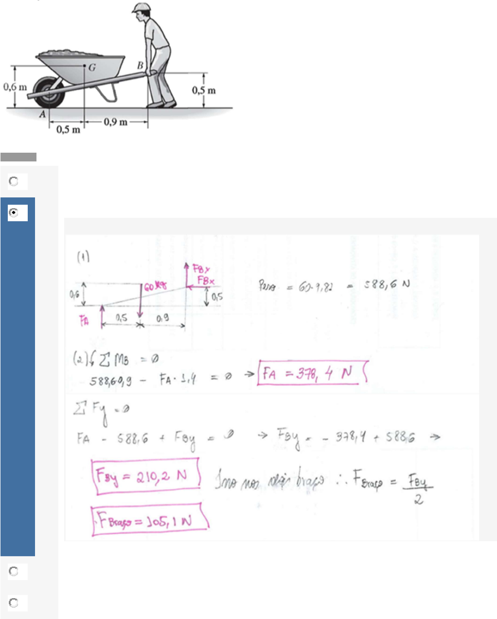 Questão 1/10 - Princípios de Mecânica e Resistência dos Materiais Se o carrinho de pedreiro e seu conteúdo têm massa de 60 kg e centro de massa G, determine a intensidade da força resultante que o homem deve exercer em cada um dos braços do carrinho para mantê-lo em equilíbrio. (conteúdo da Aula 3 tema 2) Nota: 10.0 A F = 100 N B F = 105 N Você acertou! C F = 115 N D F = 120 N E F = 150 N Questão 2/10 - Princípios de Mecânica e Resistência dos Materiais Diagramas de corpo livre são utilizados para modelar e resolver problemas de mecânica. Para a construção correta de um diagrama de corpo livre, o que é necessário incluir no mesmo? (conteúdo da Aula 3 tema 1) Nota: 10.0 A apenas as dimensões do corpo, forças externas e momentos de binário desconhecidos que atuam sobre o corpo. B apenas a forma e dimensões do corpo, forças externas, forças internas, momentos de binário conhecidos e desconhecidos que atu o corpo. C apenas a forma e dimensões do corpo, forças externas, forças internas e momentos de binário conhecidos que atuam sobre o corp D apenas a forma e dimensões do corpo, forças externas e momentos de binário conhecidos e desconhecidos que atuam sobre o corpo. Você acertou! Veja slide 12 da Aula 3 Tema 1. E apenas as forças externas e momentos de binário desconhecidos que atuam sobre o corpo. Questão 3/10 - Princípios de Mecânica e Resistência dos Materiais Um sistema composto por viga, polia e cabo é utilizado para sustentar uma carga de 80 kg, conforme a figura abaixo. Determine a tração na corda. (conteúdo da Aula 3 tema 2) Nota: 10.0 A T = 651,2 N B T = 728,4 N C T = 830,1 N Você acertou! D T = 929,6 N E T = 975,2 N Questão 4/10 - Princípios de Mecânica e Resistência dos Materiais Para retirar pregos cravados na madeira, é comum que se utilize um martelo como uma alavanca que provoca momento, conforme a figura a seguir: Sabendo que F = 1000 N , determine o momento dessa força em relação ao ponto A. (conteúdo Aula 2 tema 3 - aplique o princípio dos momentos) Nota: 10.0 A Ma = - 450 Nm B Ma = 495 Nm C Ma = - 452,2 Nm Você acertou! D Ma = 480,5 Nm E Ma = - 480,5 Nm Questão 5/10 - Princípios de Mecânica e Resistência dos Materiais O relé é um interruptor eletromecânico, com inúmeras aplicações possíveis em comutação de contatos elétricos, servindo para ligar ou desligar dispositivos. A movimentação física deste interruptor ocorre quando a corrente elétrica percorre as espiras da bobina do relé, criando assim um campo magnético que por sua vez atrai a alavanca responsável pela mudança do estado dos contatos. Considerando o sistema de relé apresentado na Figura 1(a) mostra o sistema em contato, ou seja, a armadura ABC em contato contato em A. Para isto, projetou-se este dispositivo com uma mola CD de e uma força vertical de 0,6 N em A (como mostra a figura). Assinale a alternativa que corresponde à força na mola quando a bobina for energizada e atrair a armadura para E, na figura (b), interrompendo assim o contato em A. Figura 1 - (a) Interruptor com o sistema em contato e (b) com o contato interrompido. (conteúdo da Aula 3 tema 2) Nota: 10.0 A F = 2,8 NF = 2,8 N Você acertou! B F = 3,2 NF = 3,2 N C F = 4,6 NF = 4,6 N D F = 5,5 NF = 5,5 N E F = 5,9 NF = 5,9 N Questão 6/10 - Princípios de Mecânica e Resistência dos Materiais Treliças são comumente utilizadas na construção civil e em estruturas. Seus membros são conectados a placas de ligação, como a da figura a seguir: (conteúdo Aula 2 tema 1) Nota: 10.0 A B C D Você acertou! E Questão 7/10 - Princípios de Mecânica e Resistência dos Materiais Se a válvula puder ser aberta com um momento de binário de 25 N.m, determine a intensidade exigida de cada força de binário que deve ser aplicada ao volante. (conteúdo da Aula 2 - Tema 5) Nota: 10.0 A F = 24,8 N B F = 58,4 N C F = 83,3 N Você acertou! D F = 95,7 N E F = 108,5 N Questão 8/10 - Princípios de Mecânica e Resistência dos Materiais Na mecânica estática, corpos rígidos recebem um tratamento diferente de partículas, já que suas dimensões e geometrias são incluídas nos problemas. Para garantir o equilíbrio de um corpo rígido, quais são as condições necessárias e suficientes? (conteúdo Aula 3 tema 1 e 2) Nota: 10.0 A A soma das forças que agem sobre o corpo deve ser zero. A soma dos momentos de todas as forças no sistema em relação a um pon somada a todos os momentos de binário deve ser zero; Você acertou! SOLUÇÃO A resposta desta questão é dada por definição, vide (aula 3, temas 1 e 2) B A soma dos momentos de todas as forças no sistema em relação a um ponto deve ser zero; C A soma dos momentos de todas as forças no sistema em relação a um ponto, somada a todos os momentos de binário deve ser zero; D A soma dos momentos de todas as forças no sistema em relação a um ponto, somada a todos os momentos de binário deve ser zero. necessário que a soma de forças seja zero, desde que as forças não gerem momento; E A soma de todas as forças deve ser zero, porém a soma de todos os momentos pode ser diferente de zero. Questão 9/10 - Princípios de Mecânica e Resistência dos Materiais Determine a tração desenvolvida nos três cabos necessária para suportar o semáforo, que tem uma massa de 15 kg. Considere O semáforo está centralizado no eixo z, ou seja, suas componentes x e y são zero. (conteúdo da Aula 2 - Tema 2) Você pode utilizar o google colab para montar o sistema linear de equações e extrair os valores para as forças Nota: 10.0 A FAB = 441,14 NFAB = 441,14 N Você acertou! B FCB = 541,28 NFCB = 541,28 N C FAD = 240,88 NFAD = 240,88 N D FAB = 329,56 NFAB = 329,56 N E FCB = 484,12 NFCB = 484,12 N Questão 10/10 - Princípios de Mecânica e Resistência dos Materiais A força do tendão de Aquiles Ft = 650 NFt = 650 N é mobilizada quando o homem tenta ficar na ponta dos pés. Quando isso é feito, cada um de seus pés fica sujei
