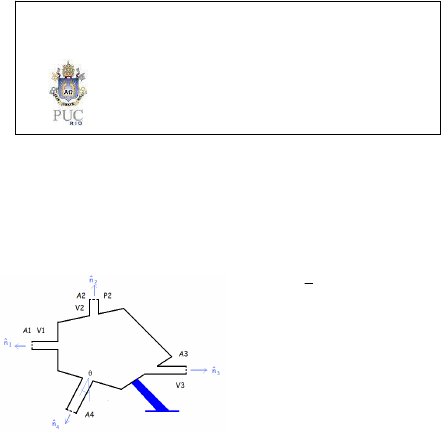 NOME: No. Matrícula: CONSULTA LIVRE A LIVROS E CADERNOS PRÓPRIOS 1ª. Questão (5,0 pontos). Considere o distribuidor mostrado na figura abaixo. Há 4 portas pelas quais há troca de massa e de quantidade de movimento. Na porta 1, a velocidade de entrada é dada pela expressão: 11 max yV V 1 h ⎡ ⎤= −⎢ ⎥⎣ ⎦ , onde y é contado a partir da linha de centro e h = 1,5 m é a meia altura do canal retangular, de área 2h x w ( = 1m). A massa específica ali vale 1100,3 3kg/m e Vmax1 = 4 m⁄s. Na seção 2, o escoam é uniforme, de entrada, com V2 = 6 m⁄s. A área da seção vale 4 m2 e a massa específica vale 1000 3kg/m . Na seção 3, o escoamento, de saída, pode ser considerado como uniforme, V3 = 4 m⁄s, a área vale 2 m2 e a massa específica vale 700 3kg/m . Da seção 4, sabe-se apenas que o escoamento é uniforme, a área vale 2 m2 e o ângulo que a normal faz com a vertical é de 30º. As pressões nas áreas 2 e 4 são atmosféricas. Pede-se: (a) determinar a massa específica e a velocidade da seção 4, considerando o regime permanente e o escoamento uniforme. Considere que a vazão é conservada, bem como a massa. O escoamento é de entrada ou saída? (b) O fluxo de massa em cada seção (indicando com sinal negativo, se for referente à entrada) (c) A reação externa na direção vertical, devido ao fluxo líquido de quantidade de movimento Departamento de Engenharia Mecânica - PUC–Rio ENG 1010 - Fenômenos de Transporte Primeira Prova - 2009.2 Turma 3SB Resp. V4 = 11 m/s; ; S,mec,yF 0N (zero).≈ 2ª. Questão (2,0 pontos): Considere o sistema da figura abaixo. (a) Determine a pressão no ponto B. Considere que h1 = 5,0 m; h2 = 2 m, h3 = 1 m e h4 = 0,2 m. A pressão (absoluta) no ponto A é de 120 kPa. Três fluidos, de densidades d1 = 1,0; d2 = 2,0 e d3 = 1,0 são utilizados, por questões de segurança. (b) Qual é a pressão manométrica no ponto B? Resp. 32 kPa. 3ª. Questão (3,0 pontos). Considere a figura abaixo. Sabe-se que d1 = 0,85, h1 = 2,0 m, d2 = 1,1 e h2 = 1,2 m. O comprimento da comporta é L = 2 m e sua largura (comporta retangular) é w = 5 m. A pressão manométrica em A vale 113,25 kPa e a pressão manométrica em B vale 126 kPa. Pede-se: (a) calcular a força que a coluna de fluido do lado esquerdo exerce sobre a comporta; (b) O ponto de aplicação desta força e (c) para qual lado a comporta indicada como OO´irá girar. Sabe-se que a força da água no lado direito vale 363,4 kN e seu ponto de aplicação dista 2,35 do nível B. Resp. FE = 363,4 kN e FD = 363,4 kN. No lado esquerdo: ycp = 1,111 m e no lado direito: ycp = 1,151 m.