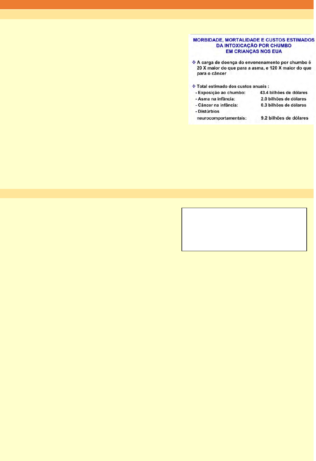 INTOXICAÇÃO POR CHUMBO (Pb) EPIDEMIOLOGIA No nosso meio, os homens constituem a maior parte dos atingidos pela intoxicação pelo chumbo dada a natureza das atividades que utilizam o metal (empregam predominantemente o sexo masculino). No Brasil, além dos casos relacionados à produção e reforma de baterias automotivas tem sido relatados casos entre trabalhadores da indústria de plástico (PVC), entre trabalhadores que usam rebolos contendo chumbo para lapidação de pedras preciosas, instrução e aprendizado de tiro, reparação de radiadores de carro, reciclagem de baterias automotivas, redução de minérios ricos em ouro para obtenção deste, entre outros. As pessoas podem se contaminar ao disparar uma arma de fogo, resquícios em forma gasosa ou aerossol não só de Pb, mas de bário e antimônio, além de pólvora fundida (resíduo de tiro), são expelidos da espoleta e do seu contato com o projétil, solidificando e contaminando a mão do atirador, além de carnes de caça, pois muitas conservam fragmentos de Pb e tintas com pigmentos à base de Pb. FISIOPATOLOGIA 1. EXPOSIÇÃO A concentração máxima permitida de Pb no ar em uma jornada de 48 horas semanais é de 100 μg m-3. O Pb é um elemento químico amplamente distribuído no ambiente (encontrado nas armas, baterias, borrachas e tintas), não essencial para nossa vida. A exposição ao Pb pode ocorrer por diversas vias, mas as principais são as vias oral (16% em adultos e 50% em crianças) e respiratória (50-70%). No entanto, pode haver absorção via cutânea também das formas orgânicas por meio de tintas para cabelo e ceras, causando os distúrbios neurológicos. A principal exposição em crianças é proveniente da tinta contendo chumbo, como da transferência do metal presente em lascas de tinta e na poeira do chão de casas mais antigas. Como indicadores biológicos de exposição, tem a determinação direta de Pb (máx. de 600 μg L-1) e de zincoprotoporfirina (1 mg L-1) no sangue, assim como do ácido delta- aminolevulínico (10 mg g-1 de creatinina) na urina. No entanto, os dois últimos podem mascarar algum caso de intoxicação! O Pb não sofre biotransformação, sendo diretamente absorvido, distribuído e excretado. 2. DISTRIBUIÇÃO Após ser absorvido, 99% do Pb é ligado aos eritrócitos. O Pb livre no plasma (1%), é distribuído para o fígado, rins, cérebro, pulmões e baço. O Pb pode estar no sangue (meia vida de 37 dias), tecidos moles (40 dias) ou no plasma, além de poder se depositar nos ossos e tecidos mineralizados, onde a meia-vida pode chegar a 27 anos e o armazenamento alcança de 90 a 95% de todo o chumbo do organismo. A distribuição depende da transferência da corrente sanguínea para os diferentes órgãos e tecidos. O acúmulo no tecido ósseo é devido à semelhança do raio atômico do Pb com o cálcio, podendo armazenar até 90% de todo o Pb do corpo! E, ao longo da vida, remodelamento ósseo com reabsorção e/ou mobilização óssea podem ocorrer, por ex durante a gravidez, crescimento e até quando do desenvolvimento da osteoporose, podendo ocorrer uma nova intoxicação. A implantação do Pb nos ossos não expressa toxicidade porque é fixada na forma de fosfato de chumbo, o qual pode se dizer que não é tóxico. Acerca das alterações neuronais, ainda não há muita compreensão, mas o chumbo parece produzir distúrbios de neurotransmissão, inibindo a função colinérgica e reduzindo o cálcio extracelular- fenômenos explicados pela habilidade do chumbo em mimetizar o cálcio nos tecidos.O chumbo bloqueia a entrada de cálcio para os terminais nervosos, inibe as ATPases do cálcio, afetando o transporte das membranas, além de inibir a utilização de cálcio pelas mitocôndrias, diminuindo a produção de energia essencial as funções cerebrais. Há algumas diferenças no processo de detoxificação do Pb associadas com variações genéticas, como as diferenças na enzima ácido delta- aminolevulínico desidratase (ALA-D) que determinam as diferentes concentrações de Pb. O Pb, ao se ligar a grupamentos sulfidrilas, inibe três enzimas: ALA-D, coproporfirinogênio oxidase e ferro-quelatase. As enzimas estão envolvidas na rota bioquímica de produção do grupamento heme, ocasionando, por conseguinte, distúrbios hematológicos. A enzima ALA-D, quando inibida, gera acúmulo de ácido delta-aminolevulínico na urina, enquanto que as enzimas coproporfirina oxidase e ferroquelatase, uma vez inibidas, causam aumento da concentração de coproporfirina na urina e de protoporfirina no sangue, respectivamente. Além disso, o Pb causa desequilíbrio a favor de oxidantes no organismo com danos a proteínas, lipídeos e até ao DNA. 3. EXCREÇÃO A eliminação é extremamente lenta, favorecendo sua acumulação no organismo. 90% do Pb que não é absorvido via GI é excretado nas fezes e pouco mais de 60% do Pb absorvido é eliminado pela urina e fezes -biliar, podendo sofrer reabsorção, e outra parte é eliminada pelo cabelo, saliva, unhas e suor. Os efeitos tóxicos depende da dose e duração da exposição, e variam da simples inibição de enzimas à produção de patologias graves ou morte. MANIFESTAÇÕES CLÍNICAS Os sinais e sintomas dependem da via de exposição, duração do contato e concentração do chumbo, com efeitos mais evidentes no sistema nervoso, hematopoético, renal e ósseo. As crianças são mais sensíveis aos efeitos no sistema nervoso central, enquanto a neuropatia periférica, a nefropatia crônica e a hipertensão são preocupações em adultos. Outros tecidos-alvo incluem os sistemas digestório, imune, esquelético e reprodutivo. Os efeitos na biossíntese do heme fornecem um indicador bioquímico sensível, mesmo na ausência de outros efeitos detectáveis. 1. INTOXICAÇÃO AGUDA Ocorre quando o Pb é ingerido em grandes quantidades, causando dor abdominal (dor plúmbica), náuseas, vômitos, gosto metálico na boca, hepatite, a