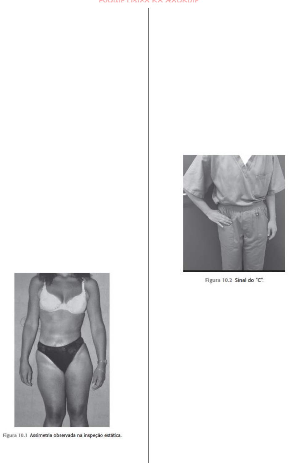RESUMO – ORTOPEDIA | GUILHERME GOMES (@GUI.GS) EXAME FÍSICO DO QUADRIL INTRODUÇÃO: • O exame físico engloba o exame do quadril, coluna e extremidades inferiores, assim como os sistemas abdominal, geniturinário, vascular e neurológico. • É fundamental minuciosa avaliação da história do paciente (anamnese). • Na anamnese do paciente, aspectos importantes na história são: idade, ocorrência ou não de traumatismo (cuja ausência prediz doença degenerativa) e sua participação em esportes e/ou outras atividades que envolvam movimentos rotacionais do quadril, frequentemente associados a lesões de estruturas intra- articulares (exemplo: lesão labral). • Devemos pesquisar outras causas extra articulares para a dor no quadril como: quadril em ressalto, síndrome da dor glútea profunda, doenças na articulação sacroilíaca, síndrome do músculo piriforme, síndrome dos isquiotibiais, dores neuropáticas (exemplo: nervo pudendo) e finalmente impacto isquiofemoral. EXAME FÍSICO: • A partir do quadril a movimentação é iniciada e executada, sendo também o responsável pela transmissão e distribuição do peso do corpo para os membros inferiores. EXAME EM PÉ: • Inspeção: paciente descalço e desnudo e a maioria dos grupamentos musculares exposta. • Devemos avaliar possíveis desvios posturais, contraturas, cicatrizes e hipotrofias. • A região inguinal pode ser indicativa de possíveis doenças intra-articulares. • A dor na face lateral do quadril pode fazer pensar também em doenças extra articulares, como as que compõem a chamada síndrome da dor peritrocantérica do quadril. • As dores apontadas para a região posterior do quadril deverão ter sempre como diagnóstico diferencial doenças da coluna, e investigação sobre outras possíveis causas de dor na região posterior do quadril, como as doenças da síndrome da dor glútea profunda (exemplo: síndrome do músculo piriforme). • Sinal do “C”: se associa a doenças possivelmente intra- articulares ocorrendo quando o paciente normalmente irá descrever uma dor interior profunda e mal definida na região do quadril, com a mão espalmada sobre a articulação e seu polegar voltado posteriormente, em forma de “C”. • Avaliar a altura dos ombros e das cristas ilíacas para pesquisa de diferenças nos membros inferiores. • Teste do dedo polegar ou da hiperextensão dos cotovelos e joelhos: relacionado à lassidão dos ligamentos. • Diferença entre escoliose estrutural x não estrutural: pede o paciente para flexionar a coluna para a frente e avalia o grau de flexão lombar. • Nas escolioses não estruturais, o desvio não provém da coluna, podendo ser por dismetria dos membros inferiores, espasmos musculares ou causas inflamatórias, cujos tratamentos visam corrigir os problemas subjacentes. • As escolioses estruturais, cuja causa provém de doenças da coluna. • O arco de movimento de inclinação lateral também é importante para avaliar rigidez articular da coluna. RESUMO – ORTOPEDIA | GUILHERME GOMES (@GUI.GS) • Exame da marcha: a observação do paciente ao caminhar já pode revelar algumas alterações pelo seu padrão de marcha. Avalia a rotação do pé, mobilidade pélvica nos planos coronal e transversos, fase de balanço e comprimento do passo. • Teste de Trendelenburg: é feito em apoio monopodálico e avaliando-se o paciente de costas. Caracteriza-se pela queda do quadril para o lado oposto ao que está apoiado, devido à fraqueza da musculatura abdutora ipsilateral (glúteos). O membro inferior apoiado por pelo menos 6 segundos. EXAME SENTADO: • Inspecionar a pele, analisando possíveis lesões, presença de varizes, edemas nas pernas etc. • Avalia a vascularização do quadril por meio da palpação dos pulsos das artérias dorsal do pé e tibial posterior. • Possibilidade de avaliação das rotações interna e externa. • Exame de arco de movimento para as rotações interna (normal entre 20 e 35°) e rotação externa (normal entre 30 e 45°), testar a força muscular de flexão, abdução e adução do quadril e, por fim, realizar o exame neurológico. • OBS: Um dos primeiros sinais de doença intra-articular é a perda da rotação interna. RESUMO – ORTOPEDIA | GUILHERME GOMES (@GUI.GS) • Teste para detectar sintomas neurológicos radiculares: com extensão total do joelho e pedindo para o paciente forçar a extensão ativa desse, o que acarretará em sensibilização das raízes nervosas. Avaliar a sensibilidade cutânea (raízes entre L2 e S1) e reflexos profundos como patelar (L2-L4) e aquileu (L5-S1). • Zonas sensitivas autônomas do membro inferior: • Teste de contratura dos músculos posteriores da coxa: pedir o paciente para flexionar o tronco e tentar tocar na ponta dos pés no lado a ser examinado, e o outro lado com os quadris e joelhos fletidos e levemente abduzidos. Outra maneira de realizar esse teste é em decúbito dorsal, onde o examinador eleva o membro pelo tornozelo, com o joelho em extensão, e será positivo caso o paciente sinta dor na musculatura posterior antes de alcançar 90° de flexão do quadril. EXAME EM DECÚBITO DORSAL: • Inspeção: avaliação da dismetria dos membros inferiores. • Palpação: avaliar o abdome e qualquer desconforto precisa ser documentado. • Teste abdominal de flexão contra a resistência: diferenciará a hernia fascial das outras queixas. • Tendinite: palpação do tubérculo adutor em contração ativa poderá identificar. • Osteíte púbica, fratura ou traumatismo: palpação da sínfise púbica poderá identificar. • Teste de Tinel: percussão do nervo no trígono femoral, sendo positivo em contraturas do quadril maiores que 25°, pela proximidade do tendão do psoas ao nervo. • Teste da rotação passiva: é realizado com o membro inferior em extensão e promovendo-se rotações externa e interna, devendo ser realizada bilateralmente, e anotar as possíveis dife