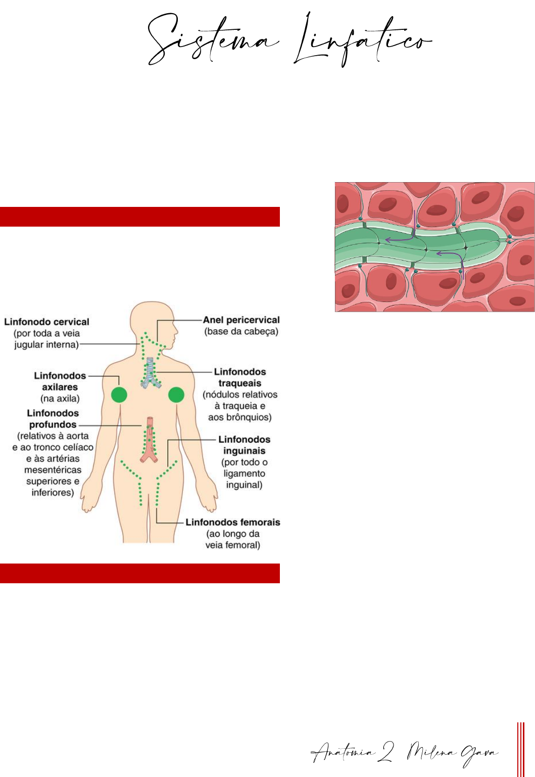 – ❖ É uma rede complexa de órgãos linfoides, linfonodos, ductos linfáticos, tecidos linfáticos, capilares linfáticos e vasos linfáticos que produzem e transportam o fluido linfático (linfa) dos tecidos para o sistema circulatório, ou seja, é constituído por uma vasta rede de vasos semelhantes às veias (vasos linfáticos), que se distribuem por todo o corpo e recolhem o líquido tissular que não retornou aos capilares sanguíneos, filtrando o e reconduzindo o à circulação sanguínea. FUNÇÕES ● Remoção dos fluidos em excesso dos tecidos corporais ● Absorção dos ácidos graxos e transporte subsequente da gordura para o sistema circulatório ● Produção de células imunes (como linfócitos, monócitos e células produtoras de anticorpos conhecidas como plasmócitos). VASOS LINFÁTICOS ❖ Os vasos linfáticos coletam, principalmente, líquido perdido dos leitos capilares vasculares durante os processos de troca de nutrientes, enviando de volta à circulação venosa do sistema vascular. ➢ A diminuta quantidade de líquido que volta à circulação por meio dos vasos linfáticos é extremamente importante porque substâncias de alto peso molecular, tais como as proteínas, não podem ser reabsorvidas pelos capilares venosos mas podem passar para os capilares linfáticos quase que totalmente sem oposição. ➢ A razão disto é a estrutura especial dos capilares linfáticos: ■ O líquido intersticial, juntamente com suas partículas suspensas, pode forçar a válvula a abrir-se e fluir diretamente para o capilar linfático. ■ Mas esse líquido tem dificuldade de sair do capilar após ter nele penetrado, porque qualquer refluxo vai fechar a válvula de aba. ❖ Incluídos nesse líquido intersticial que faz a drenagem para dentro dos capilares linfáticos estão os patógenos, as células do sistema linfático, os produtos celulares (como hormônios) e os detritos celulares. ❖ No intestino delgado, certas gorduras absorvidas e processadas pelo epitélio intestinal são “embaladas” em gotículas lipídicas revestidas por proteína (quilomícrons), que são liberadas das células epiteliais e entram no compartimento intersticial. Junto com outros componentes do líquido intersticial, os quilomícrons drenam para o interior dos capilares linfáticos (conhecidos como lácteos no intestino delgado) e são, afinal, mandados ao sistema venoso no pescoço. ❖ O sistema linfático constitui, portanto, também uma via importante de transporte da gordura absorvida pelo tubo digestório. ❖ Há vasos linfáticos na maioria das regiões do corpo, exceto no cérebro, na medula óssea e nos tecidos avasculares, como epitélios e cartilagem. ❖ Todos os vasos linfáticos se juntam para formar troncos ou ductos maiores, que fazem drenagem para dentro do sistema venoso, em locais no pescoço onde as veias jugulares internas se unem às veias subclávias para formar as veias braquiocefálicas. ➢ Os Linfonodos e Ductos Linfonodais se direcionam, ao final de seu percurso, para duas estruturas linfáticas: Ducto Linfático Direito e Ducto Torácico. – DUCTO LINFÁTICO DIREITO ● Todos os linfáticos do membro superior drenam para os linfonodos na axila. ● É responsável pela drenagem do lado direito da Cabeça, Pescoço, Tórax e Membro Superior direito, sendo composto pelos Troncos Jugular, Subclávio e Broncomediastinal Direitos. ● Desembocam na junção entre as veias jugular interna e subclávia direita: ○ o tronco jugular direito da cabeça e do pescoço; ○ o tronco subclávio direito do membro superior direito; e ○ ocasionalmente, o tronco broncomediastinal direito, levando linfa das estruturas na metade direita da cavidade torácica e dos espaços intercostais superiores direitos. DUCTO TORÁCICO ● O ducto torácico é um importante canal linfático que começa no abdome, segue superiormente pelo tórax e termina nos canais venosos no pescoço. ● O ducto torácico termina na junção entre a veia jugular interna e as veias subclávias esquerdas. ● Próximo a sua junção com o sistema venoso ele recebe: ○ o tronco jugular esquerdo, que drena a linfa do lado esquerdo da cabeça e do pescoço; ○ o tronco subclávio esquerdo, que drena a linfa do membro superior esquerdo; e ○ ocasionalmente, o tronco broncomediastinal direito, que drena a linfa da metade esquerda das estruturas torácicas. ● Uma confluência semelhante dos três troncos linfáticos ocorre do lado direito do corpo. LINFONODOS ● Eles atuam como filtros elaborados que aprisionam e fagocitam material particulado na linfa, que se infiltra através deles. ● Além disso, eles detectam antígenos estranhos que também são transportados na linfa e defendem o corpo contra eles ● A estrutura do linfonodo é formada por: ○ um Ducto Linfático Aferente, que traz a linfa até o Linfonodo; ○ um Ducto Linfático Eferente, que leva a linfa até a próxima estrutura; ○ uma Cápsula que reveste e estrutura o órgão, com a emissão de Trabéculas, responsáveis pela divisão dos Folículos, regiões onde as células de defesa se encontram. – ● Quanto aos Ductos Linfáticos, pode-se observar a presença de válvulas, assim como nas veias, para evitar refluxo de linfa. ● Além disso, há presença de poros na parede dos vasos para entrada de líquido intersticial. METÁSTASES ➢ Uma vez que os linfonodos são filtros eficientes, e o fluxo através deles é lento, as células que formam metástase (migram para longe) de tumores primários e entram nos vasos linfáticos muitas vezes se alojam e crescem como tumores secundários nos linfonodos. ➢ Os linfonodos que drenam regiões infectadas ou que contém outras formas de doença podem aumentar de tamanho ou passar por certas transformações físicas, como “endurecimento” ou “sensibilização”. ➢ Estas mudanças podem ser utilizadas pelos clínicos para detectar mudanças patológicas ou para monitorar o avan