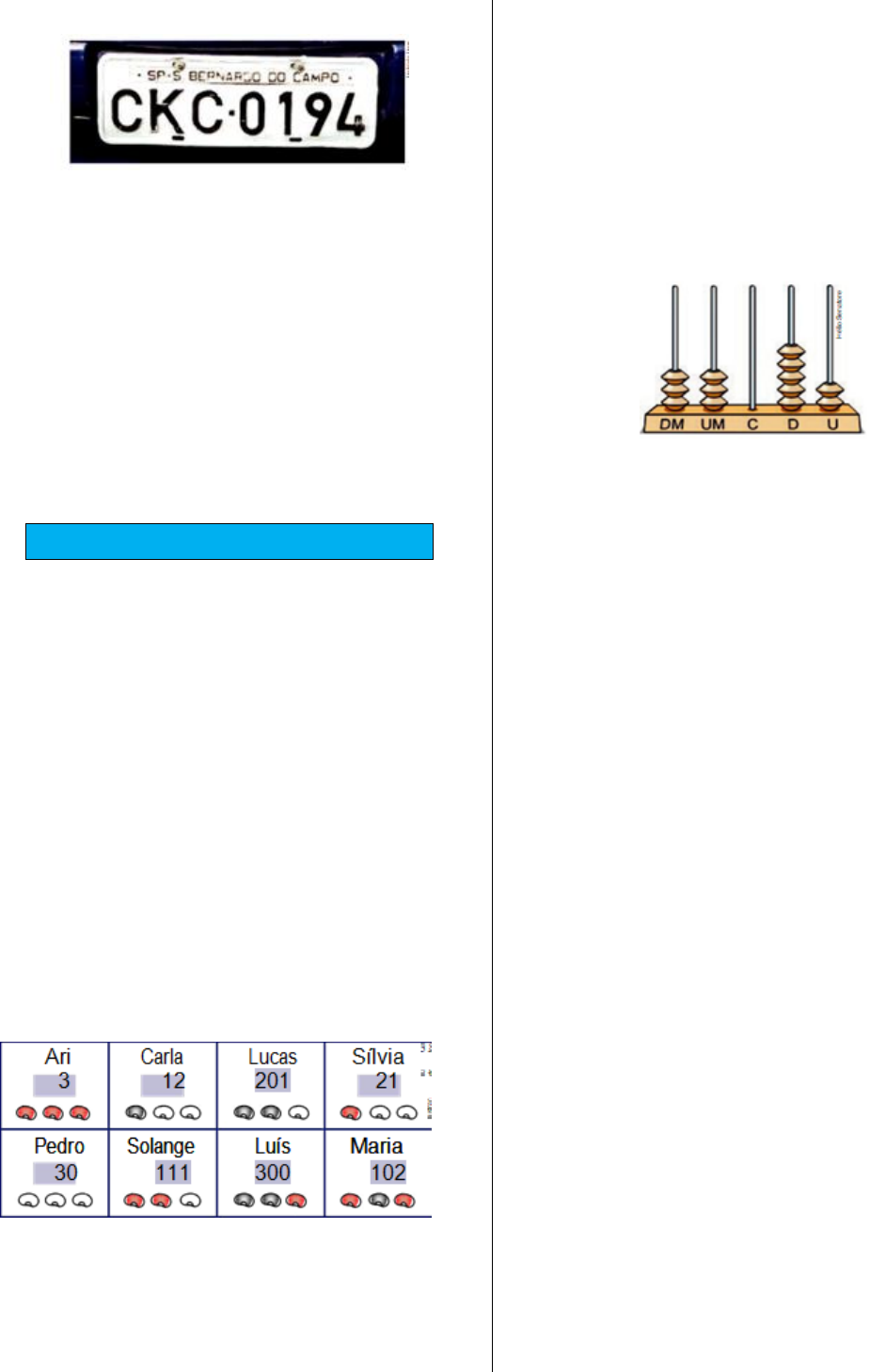 6. Veja a placa de um carro. a) Quantos algarismos tem esta placa? __________________________________________________________ b) Escreva por extenso o número da placa. __________________________________________________________ c) Qual é o maior número que se pode escrever utilizando todos esses algarismos? __________________________________________________________ d) Nesta situação, o zero pode ser suprimido? __________________________________________________________ 7. Considere os números. 770 – 7 700 – 7 707 – 777 – 7 077 – 70 700 Quais deles têm 77 centenas? ___________________________________________________________ 8. Uma turma de 8 alunos brincava com feijões. Cada um tirou de uma caixa um cartão em que aparece um número escrito. Em seguida, cada um tirou, ao acaso, três feijões de um único saco com feijões pretos, vermelhos e brancos. Anteriormente, haviam combinado a seguinte regra de cores: 1 feijão branco vale uma unidade; Anteriormente, haviam combinado a seguinte 1 feijão vermelho vale 10 feijões brancos; regra de cores: 1 feijão preto vale 10 feijões vermelhos. No quadro seguinte, embaixo do nome de cada participante, aparece o número que havia no cartão e os três feijões extraídos. Ganharia a brincadeira quem conseguisse acertar com os três feijões o número escrito no cartão. Quem ganhou? ___________________________________________________________ ___________________________________________________________ ___________________________________________________________ 9. Qual das frases corresponde a uma leitura do número 8 540? a) Oito mil e cinquenta e quatro unidades. b) Oitocentos e cinquenta e quatro dezenas. c) Oito mil e cinquenta e quatro centenas. d) Oito centenas e cinquenta e quatro milhares. 10. Qual alternativa mostra o maior número possível usando os mesmos algarismos do número representado no ábaco da figura abaixo? a) 70 353 b) 43 302 c) 53 320 d) 35 230 11. A leitura do número representado pela expressão 2 3 1 000 000 1 5 3 10 000 1 6 é: a) dois milhões, quinhentos mil e seis. b) dois milhões, cinco mil e seis. c) duzentos mil e cinquenta e seis. d) dois milhões, cinquenta mil e seis. 12. O número formado por 1 centena de milhar mais 3 milhares mais 8 dezenas é: a) 130 080 b) 103 080 c) 103 800 d) 1 308 000 13. (Saresp) Usando os algarismos 1, 2 e 3, sem repetir nenhum, é possível formar: a) dois números de três algarismos. b) três números de três algarismos. c) quatro números de três algarismos. d) seis números de três algarismos.