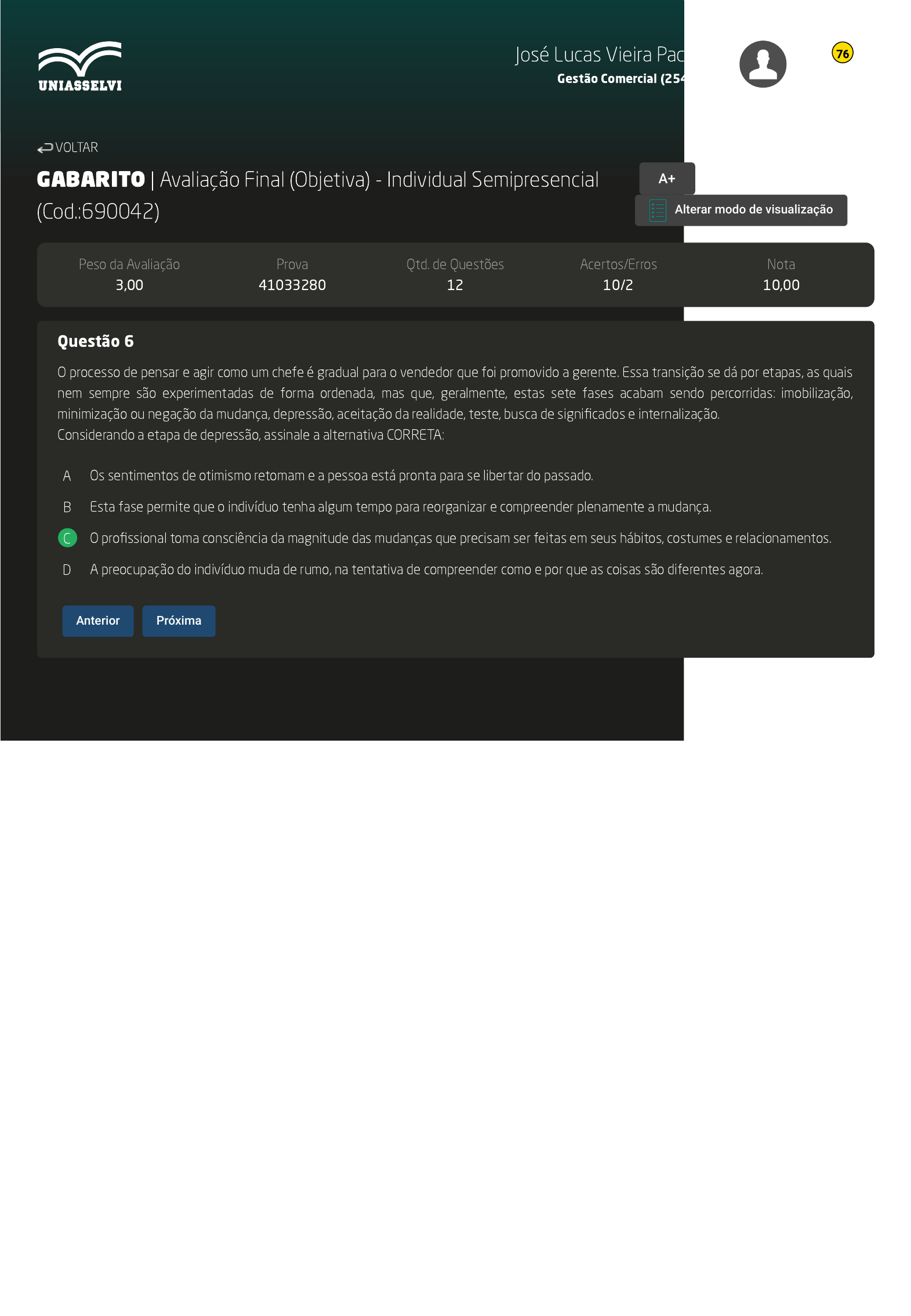 GABARITO | Avaliação Final (Objetiva) - Individual Semipresencial (Cod.:690042) Peso da Avaliação 3,00 Prova 41033280 Qtd. de Questões 12 Acertos/Erros 10/2 Nota 10,00 Questão 6 O processo de pensar e agir como um chefe é gradual para o vendedor que foi promovido a gerente. Essa transição se dá por etapas, as quais nem sempre são experimentadas de forma ordenada, mas que, geralmente, estas sete fases acabam sendo percorridas: imobilização, minimização ou negação da mudança, depressão, aceitação da realidade, teste, busca de significados e internalização. Considerando a etapa de depressão, assinale a alternativa CORRETA: A Os sentimentos de otimismo retomam e a pessoa está pronta para se libertar do passado. B Esta fase permite que o indivíduo tenha algum tempo para reorganizar e compreender plenamente a mudança. C O profissional toma consciência da magnitude das mudanças que precisam ser feitas em seus hábitos, costumes e relacionamentos. D A preocupação do indivíduo muda de rumo, na tentativa de compreender como e por que as coisas são diferentes agora. VOLTAR A+ Alterar modo de visualização Anterior Próxima José Lucas Vieira Pacheco Gestão Comercial (2542052) 76