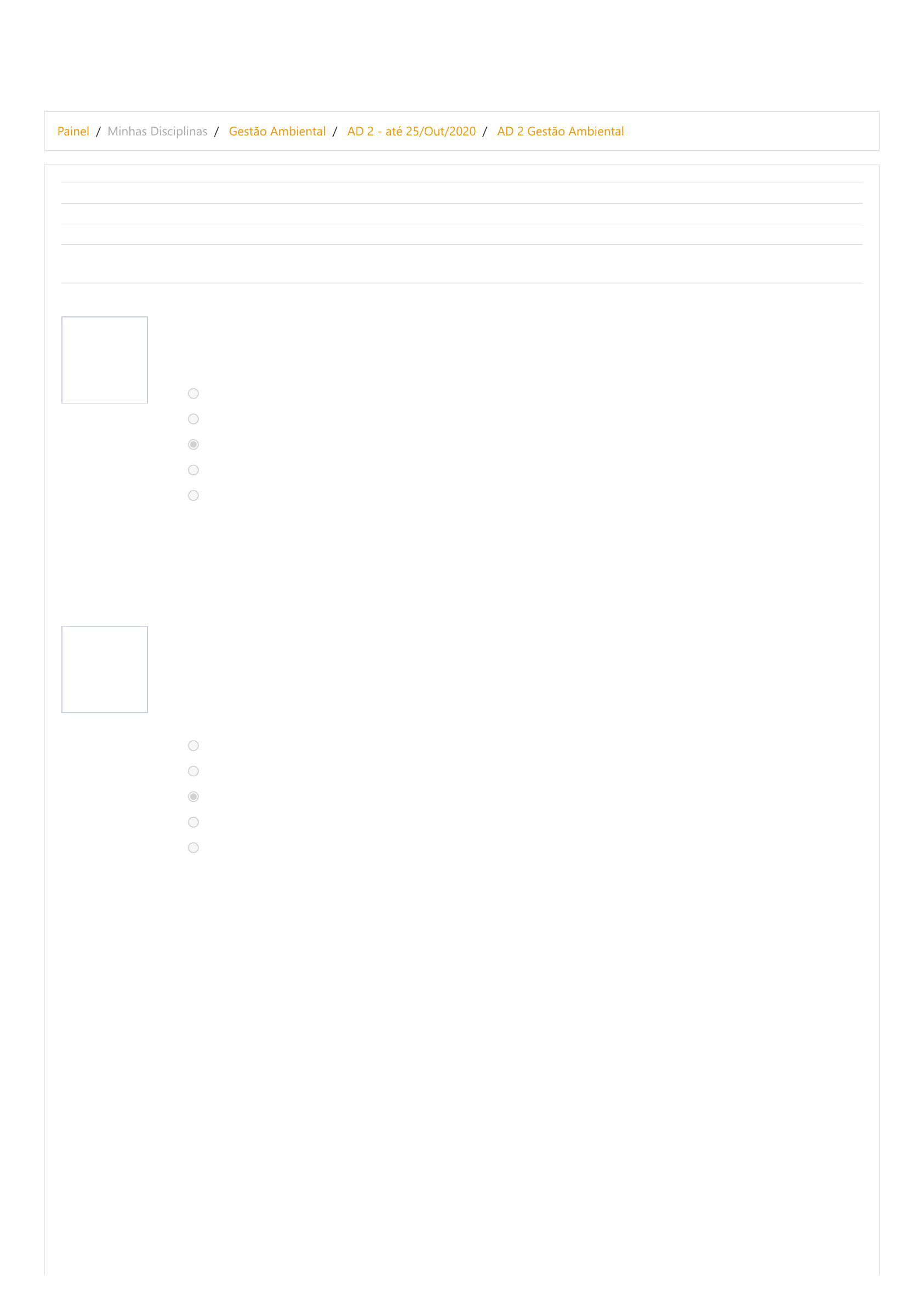 27/10/2020 AD 2 Gestão Ambiental: Revisão da tentativa https://graduacao.cederj.edu.br/ava/mod/quiz/review.php?attempt=180503&cmid=351414#question-1041720-7 1/5 Painel / Minhas Disciplinas / Gestão Ambiental / AD 2 - até 25/Out/2020 / AD 2 Gestão Ambiental Questão 1 Correto Atingiu 0,84 de 0,84 Questão 2 Correto Atingiu 0,84 de 0,84 Iniciado em sábado, 24 out 2020, 19:50 Estado Finalizada Concluída em sábado, 24 out 2020, 21:13 Tempo empregado 1 hora 22 minutos Avaliar 8,40 de um máximo de 10,08(83%) Em uma empresa de grande porte foi introduzido o conceito de lucro ambiental que está diretamente ligado a: Escolha uma: a. obter lucratividade com o aumento de valor de sua unidade no sítio estabelecido b. obter ganhos de escala não agredindo o meio ambiente c. aferir saldos econômicos positivos respeitando o meio ambiente d. garantir lucros obtendo vantagem competitiva com práticas que possam reduzir os efeitos da poluição e. vantagens fiscais pela implementação da planta fabril naquela localidade Sua resposta está correta. A resposta correta é: aferir saldos econômicos positivos respeitando o meio ambiente . Sobre a forçosa devastação do meio ambiente que decorre do processo de avanço industrial tem-se um panorama que começa a se transformar a partir da defesa de um novo conceito: o desenvolvimento sustentável. O texto acima ressalta a intenção de: Escolha uma: a. garantir que o crescimento contemporâneo não se sustenta. b. sustentar o meio ambiente em prejuízo ao desenvolvimento. c. propor a conciliação do progresso com o meio ambiente. d. sustentar a forçosa necessidade do desenvolvimento. e. divulgar a precária situação do meio ambiente. Sua resposta está correta. A resposta correta é: propor a conciliação do progresso com o meio ambiente.. https://graduacao.cederj.edu.br/ava/my/ https://graduacao.cederj.edu.br/ava/course/view.php?id=356 https://graduacao.cederj.edu.br/ava/course/view.php?id=356§ion=5 https://graduacao.cederj.edu.br/ava/mod/quiz/view.php?id=351414 27/10/2020 AD 2 Gestão Ambiental: Revisão da tentativa https://graduacao.cederj.edu.br/ava/mod/quiz/review.php?attempt=180503&cmid=351414#question-1041720-7 2/5 Questão 3 Correto Atingiu 0,84 de 0,84 Questão 4 Correto Atingiu 0,84 de 0,84 Questão 5 Incorreto Atingiu 0,00 de 0,84 Questão 6 Correto Atingiu 0,84 de 0,84 No que tange ao processo decisório relacionado ao meio ambiente a decisão não é simples nem trivial. Relacionada a isso, a grande dificuldade que o decisor se depara é: Escolha uma: a. os custos são muito altos b. o meio ambiente não possui preços de mercado c. o processo de decisão é empírico d. o mercado ambiental é muito incipiente e. o governo não apoia as diretrizes ambientais Sua resposta está correta. A resposta correta é: o meio ambiente não possui preços de mercado. As atividades fabris têm colaborado para poluir de forma penosa e preocupante quais ambientes? Escolha uma: a. solo e ar b. água e ar c. água e solo d. água, solo e ar Sua resposta está correta. A resposta correta é: água, solo e ar. No modelo econômico atual, em sua primazia o meio ambiente interage com: Escolha uma: a. degradação b. consumo c. nenhuma das demais respostas d. resíduos e. produção Sua resposta está incorreta. A resposta correta é: consumo. Se todos os países do mundo resolvessem adotar o mesmo padrão produtivo usando com a mesma intensidade os fatores de produção, os recursos naturais iriam se esgotar rapidamente, tornando o planeta inabitável, em virtude do surgimento de uma série de problemas ambientais globais e locais. Escolha uma opção: Verdadeiro Falso A resposta correta é 'Verdadeiro'. 27/10/2020 AD 2 Gestão Ambiental: Revisão da tentativa https://graduacao.cederj.edu.br/ava/mod/quiz/review.php?attempt=180503&cmid=351414#question-1041720-7 3/5 Questão 7 Correto Atingiu 0,84 de 0,84 Questão 8 Incorreto Atingiu 0,00 de 0,84 Questão 9 Correto Atingiu 0,84 de 0,84 A poluição do ar representa um dos grandes problemas dos centros urbanos e industriais, pois a excessiva concentração de poluentes causa graves problemas para a saúde humana, sendo responsável por uma série de doenças respiratórias, tais como bronquite, gripe, asma e alergias. Escolha uma opção: Verdadeiro Falso A resposta correta é 'Verdadeiro'. Do ponto de vista operacional, os objetos do gerenciamento, ou aspectos físicos do processo de gestão, são a quantidade, a qualidade e os prazos. Sob a ótica econômica, o gerenciamento é voltado para os custos dos recursos consumidos e para as receitas geradas pelos produtos e serviços. Por sua vez, o aspecto financeiro é representado pelos impactos causados nos fluxos de pagamentos e recebimentos, bem como pelos prazos em que esses eventos ocorrem. Nada obstante, pode definir “ente contábil” como sendo a (o): Escolha uma: a. vontade de colocar o interesse público à frente dos empresariais b. diferença entre os ganhos obtidos com receitas e despesas conexas ao meio ambiente c. cuidado ambiental em sustentar os recursos naturais existentes d. unidade que tem o domínio sobre o uso dos expedientes naturais e. ação ambiental a fim de promover a salvaguarda do meio ambiente Sua resposta está incorreta. A resposta correta é: unidade que tem o domínio sobre o uso dos expedientes naturais . No estudo da economia ecológica é correto afirmar que seus fundamentos são permeados por várias ciências e distante de uma prática interdisciplinar: Escolha uma opção: Verdadeiro Falso A resposta correta é 'Falso'. 27/10/2020 AD 2 Gestão Ambiental: Revisão da tentativa https://graduacao.cederj.edu.br/ava/mod/quiz/review.php?attempt=180503&cmid=351414#question-1041720-7 4/5 Questão 10 Correto Atingiu 0,84 de 0,84 Questão 11 Correto Atingiu 0,84 de 0,84 Questão 12 Correto Atingiu 0,84 de 0,84 O ser humano ao procurar uma qualidade de vida mais espartana vem destruindo e contaminando o mundo que vive. N
