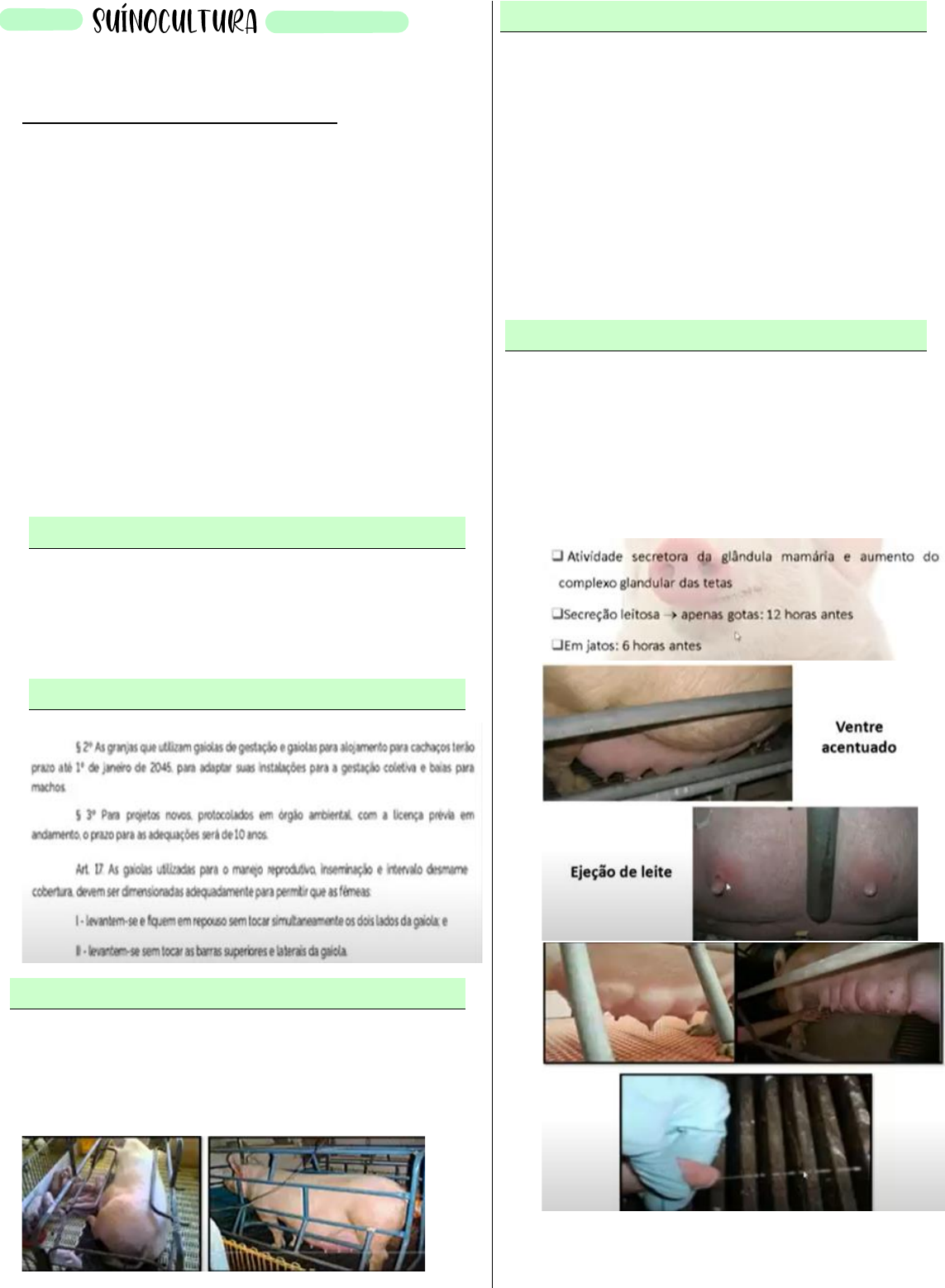Manejo de leitões Preparação da maternidade: 1. Local onde vai ocorrer 2. Deve ser realizado vazio sanitário antes da chegada da fêmea 3. Manter o ambiente limpo, seco e com o mínimo de ruído possível 4. Lavagens e desifecção das instalações 5. Instalar e testar equipamentos 6. Vazio sanitário (7 dias) 7. Preparar o escamoteador para os leitões 8. Fêmea consome entre 20 a 30 litros por dia de água • Importante saber: ➢ Fêmeas devem ser transferidas pelo menos 5-7 dias antes da data prevista do parto para se adaptar ao ambiente. Baias coletivas na gestação: Uso de gaiolas na gestação Uso de gaiolas é tolerado quando as gaiolas atendem ao disposto no art.17 Maternidade: ➢ Sobre lavagem > Atenção com o aparelho genital, mamário, locomotor, orelhas (usar água, sabão e escova) ➢ Reduzir a alimentação > Gradativamente 3 dias antes ➢ No dia do parto > Não podem ser alimentadas recbendo pelo menos água á vontade Manejo no parto ➢ Para o acompanhamento do parto seja efetivo, desde o início é preciso conhecer os sinais que antecedem a expulsão do primeiro leitão ➢ Indícios do início do parto: Partos e registros: ➢ Importante utilizar fichas no parto,registrando a hora de nascimento de cada leitão, visando auxiliar na decisão de intervenção ➢ Tipo de leitão: vivo, matimorto, momificado Algumas coisas que precisam ser observadas durante o parto: ✓ Intervenção no parto ✓ Intervalo entre os nascimentos forem muito longos ✓ Fêmea já pariu algum leitão e ainda continua apresentando contrações sem expulsão? ✓ Intervalo de expulsão: 16-20min ✓ Massagem abdominal e do aparelho pode ser realizada durante um parto normal, já que estimula a liberação de ocitocina Intervenção Os principais problemas em suínos são a presença de leitões mal posicionados ou muito grandes e a falta de contrações uterinas ✓ 20 minutos entre o nascimento, deve se considerar que há algum tipo de complicação, buscado- se iniciar, assim as intervenções No caso das contrações vigorosas e inquietação da fêmea deve utilizar o toque (palpação). Natimorto- Tipo 1 ✓ Acima de 90 dias de gestação ✓ Caudos por agentes infecciosos (parvo, leptospira, vírus de Aujesky) ✓ Leitão já nasce morto Natimorto- Tipo II ✓ Problemas no momento do parto ✓ Leitão em posição inadequada ✓ Leitegada muito grande ✓ Parto muito longo Mumificado ✓ Vida interrompida- 35 a 90 dias de gestação ✓ Causas infecciosas: parvovírus,Leptospira, auzjesky ✓ Coloração: achocolatada e tamanho reduzido (desidratado e múmia) Cuidados com os leitões após o parto: ➢ Ter cuidado com os leitões pois eles tem o sistema termoregulador e sistema imunologico pouco desenvolvido. ➢ Limpeza da baia deve ser realizada pelo menos 3 vezes por dia. ➢ 70% da mortalidade total do período ocorre 1 semana. ➢ Esmagamento e inanição (morte do leitão por falta de nutriente). Importânte ter o cuidado de quando leitão nascer é: ➢ Exugar esse leitão (geralmente com o pó secante). ➢ Devem ser limpos e secos á medida que vão nascendo ➢ Remover os restos de membrana IMPORTANTE: Outros cuidados que se deve ter pós o parto com os leitões: Corte e desifecção do cordão umbilical: ➢ cicatriza e cai em 3 a 5 dias ➢ Dificulta a formação de hénia ➢ Porta de entrada de microrganismos causadores de infecção ➢ A ligadura e corte do cordão deve ser 3-5cm de sua inserção no abdômen ➢ Realizar a desifecção com iodo 5-7%, imergir o umbigo até sua base e mante-lo em contato com iodo até 5 segundos Manejo dos dentes Nasce com 8 dentes, 4 caninos e 4 pré-molares 1) Devem ser feito em média entre 24-48 horas após o nascimento. 2) A dentição permanece se completa aos 18 meses- 44 dentes. Sobre corte da cauda: Manejo de ferro: Quando o leitão nasce ele não costuma ter quantidade suficiente de ferro pra formação de hemoglobina Método utilizado: fornecer 2ml de ferro injetável Via: Subcutânea ou intramuscular Até o segundo dia de vida Geralmente quando o leitão está debilitado: Primeira mamada Manipulada pelo homem para obter a leitegada uniforme !) Distribuição os leitões mais fracos nas testa que produzem mais leite e os mais fortes em tetas com menos leite Mamada na primeira hora após o parto 1) Colostro 2) Capacidade do leitão absorver o colostro logo após o nascimento é de 24 a 36 3) Nas leitegads grandes, o ideal é assegurar que os primeiros 8-10 leitões nascidos mamem o colostro, após isso marca-lo com o pícel. Castração: Objetivo da castração na suínocultura é evitar o odor e o sabor desagradável ➢ Animais abatidos antes 75kg: odor não é evidente ➢ Animais mais dóceis ➢ Fazer na primeira semana -facilita o manejo