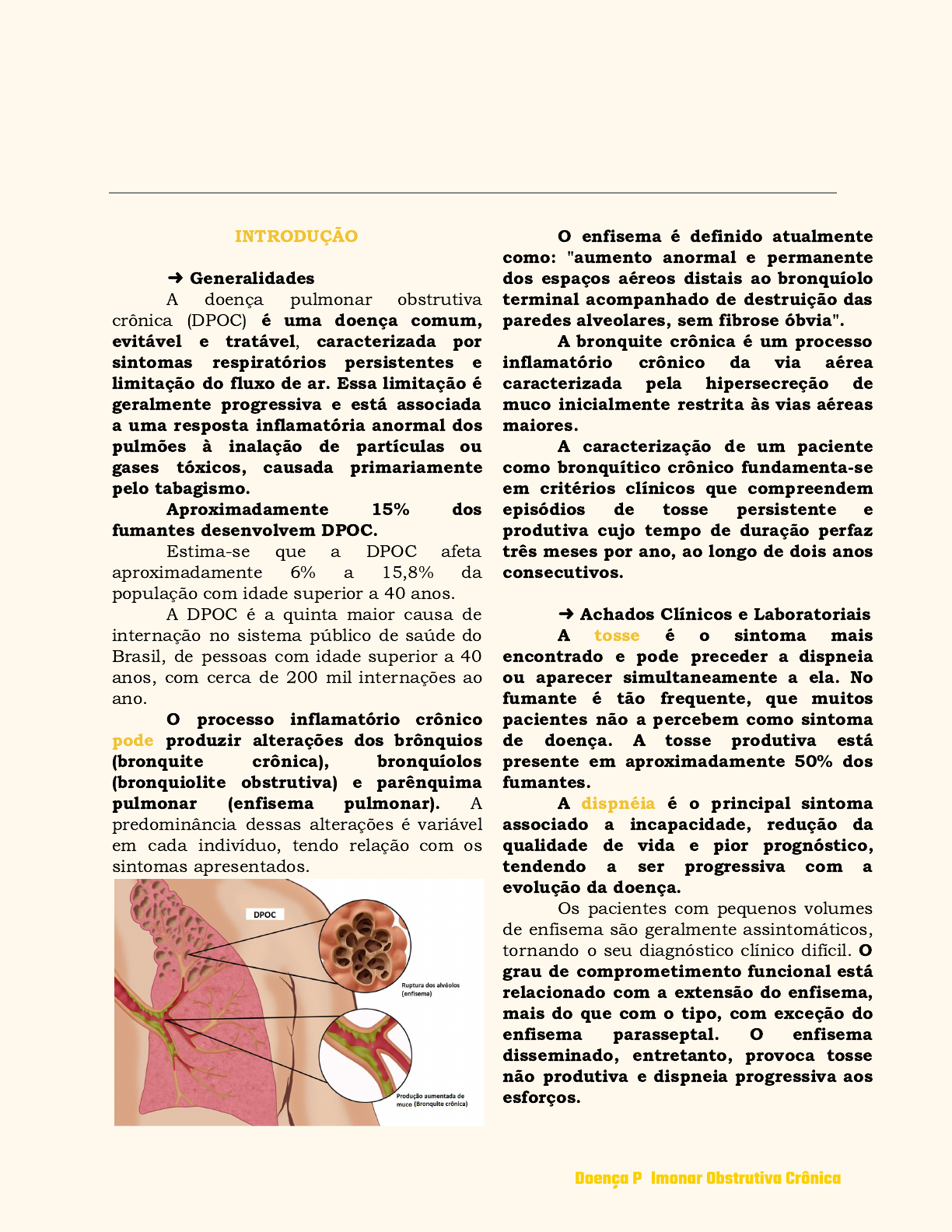 IMAGEM DPOC INTRODUÇÃO ➜ Generalidades A doença pulmonar obstrutiva crônica (DPOC) é uma doença comum, evitável e tratável, caracterizada por sintomas respiratórios persistentes e limitação do fluxo de ar. Essa limitação é geralmente progressiva e está associada a uma resposta inflamatória anormal dos pulmões à inalação de partículas ou gases tóxicos, causada primariamente pelo tabagismo. Aproximadamente 15% dos fumantes desenvolvem DPOC. Estima-se que a DPOC afeta aproximadamente 6% a 15,8% da população com idade superior a 40 anos. A DPOC é a quinta maior causa de internação no sistema público de saúde do Brasil, de pessoas com idade superior a 40 anos, com cerca de 200 mil internações ao ano. O processo inflamatório crônico pode produzir alterações dos brônquios (bronquite crônica), bronquíolos (bronquiolite obstrutiva) e parênquima pulmonar (enfisema pulmonar). A predominância dessas alterações é variável em cada indivíduo, tendo relação com os sintomas apresentados. O enfisema é definido atualmente como: "aumento anormal e permanente dos espaços aéreos distais ao bronquíolo terminal acompanhado de destruição das paredes alveolares, sem fibrose óbvia". A bronquite crônica é um processo inflamatório crônico da via aérea caracterizada pela hipersecreção de muco inicialmente restrita às vias aéreas maiores. A caracterização de um paciente como bronquítico crônico fundamenta-se em critérios clínicos que compreendem episódios de tosse persistente e produtiva cujo tempo de duração perfaz três meses por ano, ao longo de dois anos consecutivos. ➜ Achados Clínicos e Laboratoriais A tosse é o sintoma mais encontrado e pode preceder a dispneia ou aparecer simultaneamente a ela. No fumante é tão frequente, que muitos pacientes não a percebem como sintoma de doença. A tosse produtiva está presente em aproximadamente 50% dos fumantes. A dispnéia é o principal sintoma associado a incapacidade, redução da qualidade de vida e pior prognóstico, tendendo a ser progressiva com a evolução da doença. Os pacientes com pequenos volumes de enfisema são geralmente assintomáticos, tornando o seu diagnóstico clínico difícil. O grau de comprometimento funcional está relacionado com a extensão do enfisema, mais do que com o tipo, com exceção do enfisema parasseptal. O enfisema disseminado, entretanto, provoca tosse não produtiva e dispneia progressiva aos esforços. Doença Pulmonar Obstrutiva Crônica As provas de função respiratória no diagnóstico do enfisema refletem três importantes alterações: I) obstrução de pequenas vias aéreas provocada pela perda de sustentação e alteração inflamatória de suas paredes; II) perda da elasticidade pulmonar; e III) perda de superfície alveolar. A obstrução de via aérea reduz o pico de fluxo e o volume expiratório forçado no primeiro segundo (VEF1). A perda da retração elástica pulmonar é compensada por maior expansibilidade da parede torácica, aumentando os vários volumes pulmonares estáticos (volume residual, capacidade residual funcional e capacidade pulmonar total). A espirometria permite a avaliação de uma multiplicidade de parâmetros, porém os mais importantes do ponto de vista de aplicação clínica são a capacidade vital forçada (CVF), o VEF1 e a relação VEF1/CVF. A existência de limitação do fluxo aéreo é definida pela presença da relação VEF1 / CVF abaixo de 0,7 após broncodilatador. Em portadores de DPOC, a espirometria antes e após broncodilatador é o teste diagnóstico e de estadiamento básico. A definição de DPOC não faz referência a esses dois termos, mas sim à presença de obstrução fixa do fluxo aéreo após o uso de broncodilatador, ou seja, é uma definição espirométria. Não são necessários os dados histológicos. Só precisa de paciente com exposição de partícula nociva, com sintomas, e com espirometria com relação VEF1 / CVF abaixo de 0,7 após broncodilatador. ➜ Achados Histológicos O enfisema é classificado de acordo com a região do ácino acometida: proximal (enfisema centroacinar ou centrolobular), distal (enfisema parasseptal), ou todo o ácino (enfisema panacinar ou panlobular). O tipo parasseptal só ocorre naqueles ácinos delimitados por tecido conjuntivo, sejam septos conjuntivos periféricos, pleuras e bainhas de tecido conjuntivo, peribrônquicas ou perivasculares. Apresenta uma tendência em se desenvolver onde as margens pulmonares são regulares. Os espaços aéreos no enfisema parasseptal frequentemente se tornam confluentes e se desenvolvem em bolhas, que podem ser grandes. Acredita-se que o enfisema parasseptal seja a lesão básica na doença pulmonar bolhosa. O enfisema do tipo panacinar (panlobular) acomete toda ou qualquer porção dos ácinos, com dilatação e destruição de seus alvéolos. Estão perdidas as características que usualmente diferenciam os alvéolos dos dutos alveolares, os poros de Kohn aumentam e desenvolvem-se fenestrações entre os alvéolos. Este processo tem sido comparado com uma simplificação difusa da arquitetura pulmonar. As alterações patológicas estão distribuídas difusamente, mas com frequência a distribuição predomina nos terços inferiores. Doença Pulmonar Obstrutiva Crônica O enfisema predominante que ocorre na deficiência de alfa-1-antitripsina, na síndrome de McLeod (Swyer-James) e em casos de enfisema familiar, é do tipo panacinar. Apesar de ser considerado o enfisema dos não fumantes, também ocorre induzido pelo tabagismo em associação a enfisema centrolobular. O tipo centroacinar (centrolobular) acomete a porção central do ácino, junto aos bronquíolos respiratórios. Há uma dilatação seletiva com confluência dos elementos centroacinares, principalmente os bronquíolos respiratórios e seus alvéolos. Os terços superiores dos pulmões tendem a ser mais acometidos. A bronquite crônica (BC) pode n