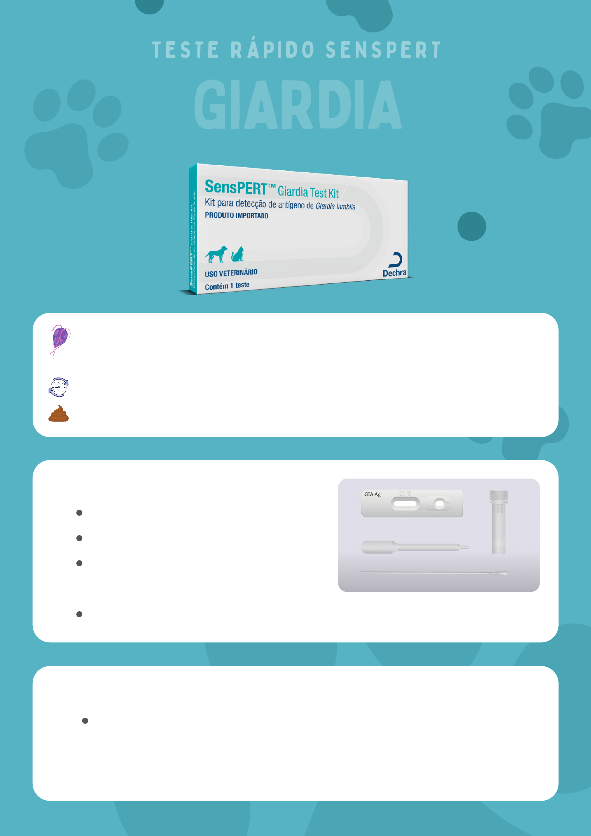 T E S T E R Á P I D O S E N S P E R TT E S T E R Á P I D O S E N S P E R T fornece o diagnóstico de 5 a 10 min. identifica a presença de cistos e trofozoítos de giardia lamblia; utiliza amostra de fezes de cães e GATOS. GIARDIAGIARDIA o teste apresenta: 1 placa teste; 1 conta gotas descartável; 1 frasco contendo solução tampão; 1 swab. como realizar o teste? coletar uma amostra de fezes do animal suspeito com o swab e homozenizá-la com a solução tampão, mergulhando o swab no frasco presente no kit; se apenas a linha c estiver visível, o resultado é negativo; se a linha c e t estiverem visíveis, o resultado é positivo. se apenas a linha t estiver visível ou nenhuma das duas linhas estiverem visíveis, o resultado é considerado inválido e um novo teste precisa ser feito. leitura do resultado: aguardar aproximadamente 1 min antes de prosseguir e então utilizar o conta gotas para coletar a amostra sobrenadante no frasco; aplicar 4 gotas da amostra no local indicado na placa teste utilizando o conta gotas e aguardar de 5 a 10 min até que o resultado possa ser visualizado. como proceder? se positivo: iniciar terapia. se negativo sem presença de sinais da doença: verdadeiro negativo; se negativo com presença de sinais da doença: considerar diferentes diagnósticos e a possibilidade de falso negativo. http://www.senspert.com.br/giardia.html