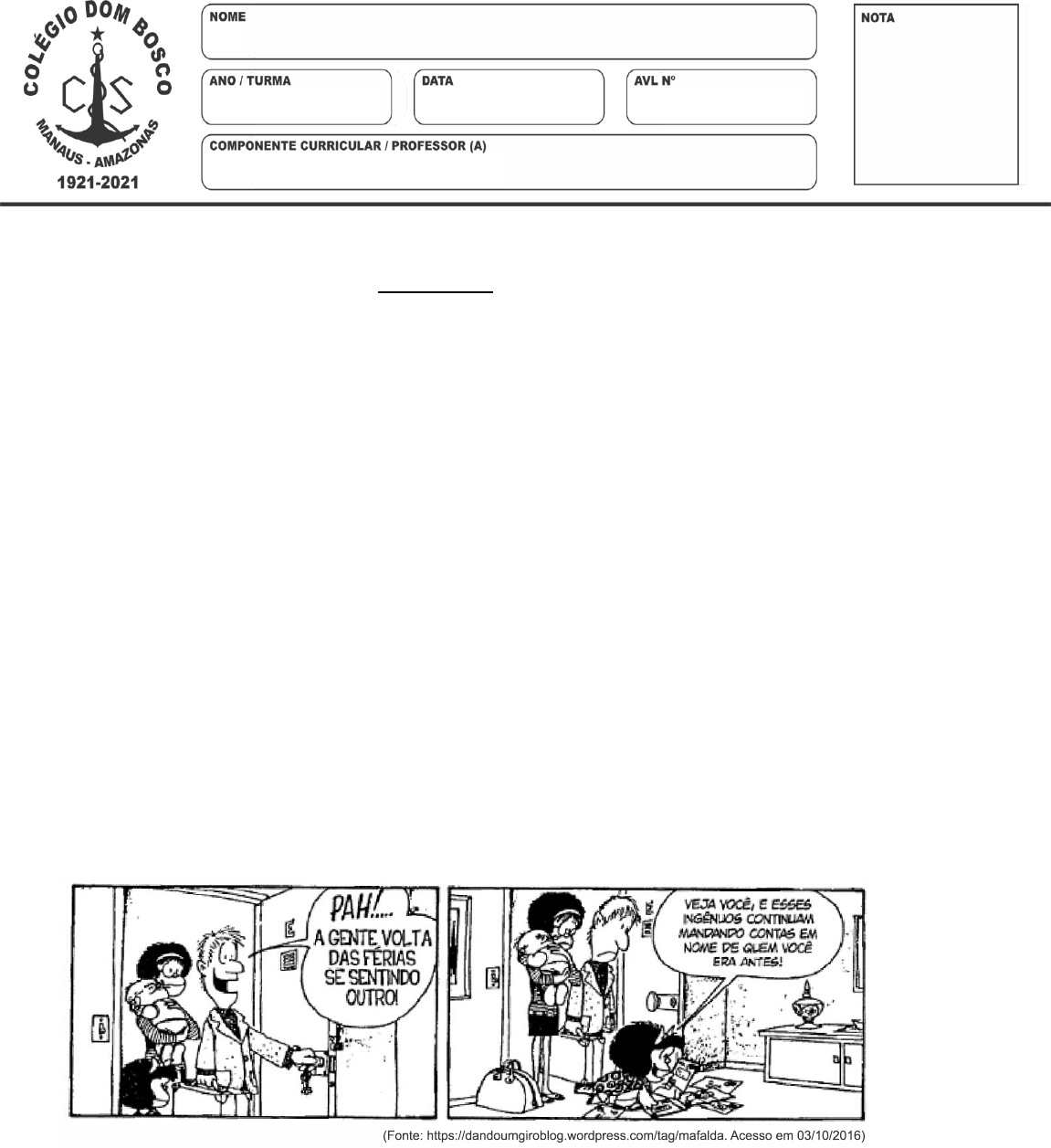 Vozes verbais 1ª) (Famema 2021) “O culpado pode alegar que não fez nada.” Transpondo-se para a voz passiva a oração centrada na locução verbal sublinhada, surge a forma verbal: a) pôde ser alegado. b) pode alegar. c) é alegado. d) pode ser alegado. e) foi alegado. 2ª) Unesp 2018) “Um mês depois, os amigos recebem uma carta escrita em tinta azul [...].” Assinale a alternativa que expressa, na voz passiva, o conteúdo dessa oração. a) Um mês depois, uma carta escrita em tinta azul seria recebida pelos amigos. b) Os amigos deveriam ter recebido, um mês depois, uma carta escrita em tinta azul. c) Um mês depois, uma carta escrita em tinta azul foi recebida pelos amigos. d) Um mês depois, uma carta escrita em tinta azul é recebida pelos amigos. e) Os amigos receberiam, um mês depois, uma carta escrita em tinta azul. 3ª) Analise a tirinha abaixo: (G1 - cp2 2017) Leia a seguinte frase elaborada a partir da leitura do 2º quadrinho: E esses ingênuos continuam mandando contas em seu nome. Assinale a alternativa que corresponde à correta reescrita dessa frase na voz passiva. a) E esses ingênuos continuarão mandando contas em seu nome. b) E contas continuaram sendo mandadas em seu nome pelos ingênuos. c) E contas continuam mandando em seu nome por esses ingênuos. d) E contas em seu nome continuam sendo enviadas por esses ingênuos. 7ºANO Lista de exerc. LÍNGUA PORTUGUESA 4ª) (G1 - ifsp 2016) Considerando a norma padrão da Língua Portuguesa, marque (VP), para voz passiva, (VA), para voz ativa e assinale a alternativa correta. I. O jogador marcou um belo gol na última semana. ( ) II. O ônibus atrasou bastante na tarde de ontem. ( ) III. A bola foi atrasada de modo muito forte pelo zagueiro. ( ) IV. O computador foi desligado inadequadamente na última vez. ( ) a) VA, VP, VP, VA. b) VP, VA, VA, VP. c) VA, VA, VP, VP. d) VP, VP, VA, VA. e) VP, VA, VP, VA. 5ª) (G1 - cp2 2016) Releia o seguinte trecho destacado do texto “História do Humor”: “Segundo ele, os comediantes consideraram esse humor fácil, pois muitas vezes se limitava a imitar essas pessoas.” (ref. 2). Assinale a alternativa que apresenta a forma correspondente da oração sublinhada na voz passiva. a) Esse humor fácil foi considerado pelos comediantes. b) Esse humor é considerado fácil pelos comediantes. c) Considerou-se esse humor fácil pelos comediantes. d) Esse humor foi considerado fácil pelos comediantes. 6ª) (Mackenzie 2003) "Da janela do seu quarto é que ELE A VIRA PELA PRIMEIRA VEZ". Passando-se a oração em destaque para a voz passiva analítica, a forma verbal correspondente é a) foi vista. b) havia visto. c) estava sendo visto. d) seria vista. e) fora vista. 7ª) (G1 1996) Passando o texto a seguir para a voz passiva, assinalar a alternativa que contenha as formas verbais corretas: No próximo dia 15, os comerciantes anunciarão as promoções dos brinquedos para o Natal. Algumas lojas prometem descontos surpreendentes. a) vão anunciar; prometerão; b) são anunciados; são prometidas; c) serão anunciadas; são prometidos; d) seriam anunciadas; serão prometidos; e) anunciam; estão prometendo. 8ª) (G1 1996) Assinale as orações que estejam na voz reflexiva: ( ) Tu te julgas feliz? ( ) Alguém te procurou ontem. ( ) Ela se admirava no espelho. ( ) Não nos veremos amanhã. ( ) Todos o consideravam uma boa pessoa.