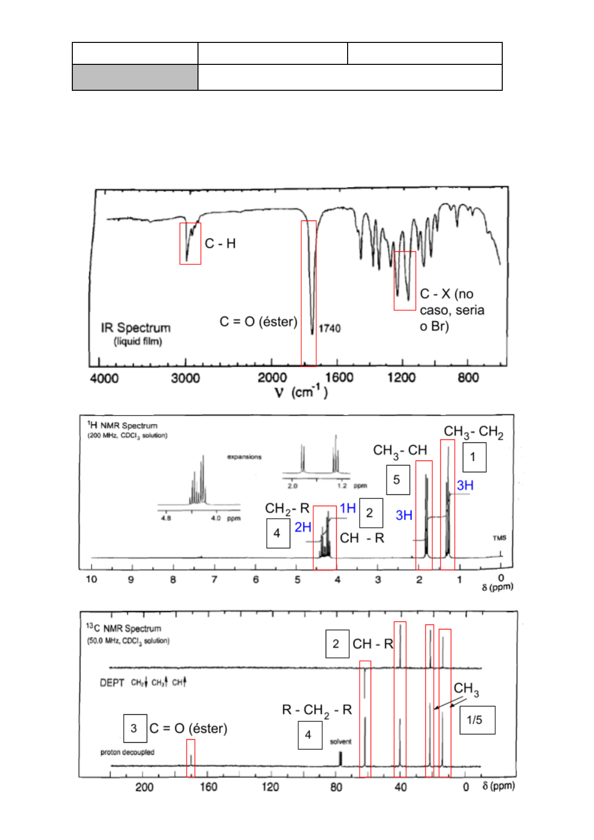 QO-Exp EQ Profa. Patricia Sartorelli Semana 19/07 a 24/07 AULA TEÓRICA EXERCÍCIO COMBINADO RMN, EM, IV (Sternhell) Aline Beatriz Soares Passerini, 148849. 1. A fórmula molecular do composto abaixo é C5H9O2Br. Determine e numere sua estrutura e atribua os sinais e bandas nos espectros de RMN e IV respectivamente. Para o EM proponha a fragmentação do pico base e do pico m/z 152/154. Estrutura completa: m/z = 107/109 m/z = 152/154