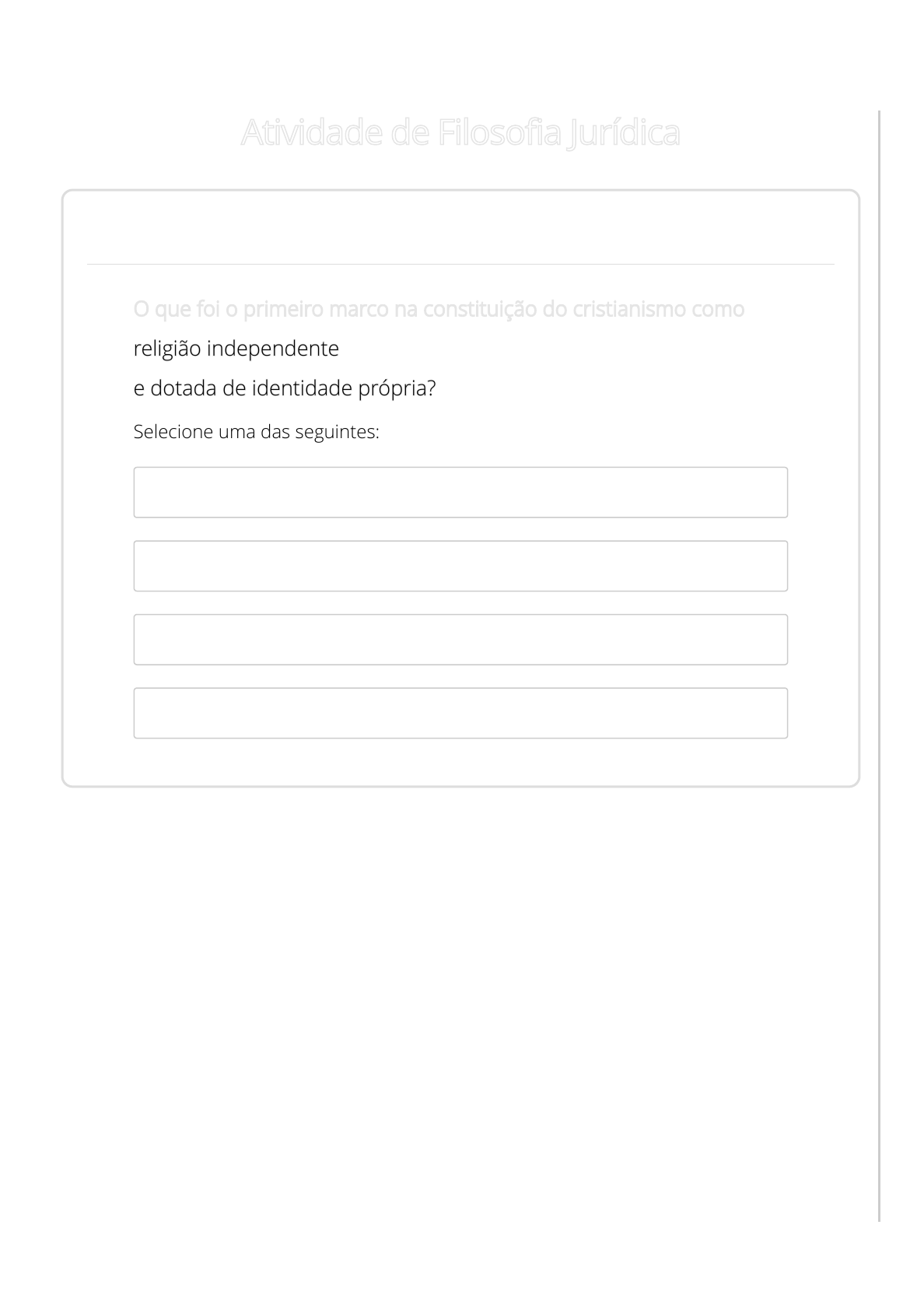 20/06/2021 Atividade de Filosofia Jurídica | Quiz https://www.goconqr.com/pt-BR/quizzes/31859042/edit 1/14 Atividade de Filosofia JurídicaAtividade de Filosofia Jurídica Questão 1 de 15 1 O que foi o primeiro marco na constituição do cristianismo comoO que foi o primeiro marco na constituição do cristianismo como religião independente religião independente e dotada de identidade própria?e dotada de identidade própria? Selecione uma das seguintes: A filosofia de Santo Agostinho. A pregação de são Paulo, um judeu helenizado. Santo Anselmo e o desenvolvimento da escolástica. Invasões Arábicas. 20/06/2021 Atividade de Filosofia Jurídica | Quiz https://www.goconqr.com/pt-BR/quizzes/31859042/edit 2/14 Questão 2 de 15 1 Sobre a Filosofia Cristã, é correto afirmar que: Sobre a Filosofia Cristã, é correto afirmar que: I. Os primeiros representantes desta filosofia pertencem à chamadaI. Os primeiros representantes desta filosofia pertencem à chamada escola neoplatônica cristã de Alexandria. escola neoplatônica cristã de Alexandria. II. Defesa de que o papel pedagógico da filosofia é uma preparaçãoII. Defesa de que o papel pedagógico da filosofia é uma preparação do espírito humano para a revelação divina. do espírito humano para a revelação divina. III. Para os seus pensadores, os filósofos gregos são vistos, emIII. Para os seus pensadores, os filósofos gregos são vistos, em grande parte, principalmente figuras como Sócrates, Platão e algunsgrande parte, principalmente figuras como Sócrates, Platão e alguns estoicos como precursores do Cristianismo por sua sabedoria eestoicos como precursores do Cristianismo por sua sabedoria e virtude. virtude. IV. Defesa de que o papel pedagógico da filosofia é a preparação doIV. Defesa de que o papel pedagógico da filosofia é a preparação do homem para o exercício do poder políticohomem para o exercício do poder político Selecione uma das seguintes: Todas as opções estão corretas. Somente os enunciados II, III E IV estão corretos. Somente os enunciados I e II estão corretos. Somente os enunciados I,II e III estão corretos. 20/06/2021 Atividade de Filosofia Jurídica | Quiz https://www.goconqr.com/pt-BR/quizzes/31859042/edit 3/14 Questão 3 de 15 1 Felipe II, rei da Macedônia, conquistou a Grécia. Seu filho, Alexandre,Felipe II, rei da Macedônia, conquistou a Grécia. Seu filho, Alexandre, o Grande, consolidou as conquistas do pai e expandiu o império emo Grande, consolidou as conquistas do pai e expandiu o império em direção à Ásia, chegando até a Índia. Na perspectiva histórica, a obradireção à Ásia, chegando até a Índia. Na perspectiva histórica, a obra de Alexandre e de seus sucessores imediatos foi importante porque:de Alexandre e de seus sucessores imediatos foi importante porque: Selecione uma das seguintes: Favoreceu a difusão do modelo político das cidades-Estados da Grécia pelas regiões conquistadas no Oriente, estimulando um governo fundamentado na liberdade e na democracia. Possibilitou o intercâmbio de culturas, difundindo as tradições gregas nas terras do Oriente, enquanto as mesopotâmicas, egípcias, hebraicas e persas expandiram-se para o Ocidente. Substituiu a visão mística do mundo, presente nos povos orientais, pelo reconhecimento intelectual proveniente da razão e do raciocínio lógico. Suplantou o poder despótico predominante nos grandes impérios orientais, os quais atribuíam aos governantes uma origem divina. 20/06/2021 Atividade de Filosofia Jurídica | Quiz https://www.goconqr.com/pt-BR/quizzes/31859042/edit 4/14 VERDADEIRO FALSO Questão 4 de 15 1 Complete adequadamente a frase: Complete adequadamente a frase: Podemos dividir o período medieval em __ fase(s) totalmentePodemos dividir o período medieval em __ fase(s) totalmente distinta(s) do Ponto de vista filosófico e cultural. Que corresponde(m)distinta(s) do Ponto de vista filosófico e cultural. Que corresponde(m) :: Selecione uma das seguintes: 1 FASE- queda do Império Romano (séc. V). 2 FASE- queda do Império Romano (séc. V) e desenvolvimento da escolástica e à grande produção filosófica que se dá com a criação das universidades (séc. XIII) 2 FASES - desenvolvimento da escolástica e à grande produção filosófica que se dá com a criação das universidades (séc. XIII) Nenhuma das alternativas acima. Questão 5 de 15 1 Transição do helenismo para o cristianismo: o pensamento filosóficoTransição do helenismo para o cristianismo: o pensamento filosófico cristão surge no contexto do helenismo.cristão surge no contexto do helenismo. Selecione uma das opções: 20/06/2021 Atividade de Filosofia Jurídica | Quiz https://www.goconqr.com/pt-BR/quizzes/31859042/edit 5/14 Questão 6 de 15 1 A Reforma gregoriana decretada pelo papa Gregório VII, estabeleceuA Reforma gregoriana decretada pelo papa Gregório VII, estabeleceu os seguintes itens para serem ensinados em cada abadia e catedral,os seguintes itens para serem ensinados em cada abadia e catedral, exceto: exceto: Selecione uma das seguintes: Lógica, gramática e retórica Musica, geometria, aritmética e física Elementos básicos da cultura da época Poesia contemporânea grega 20/06/2021 Atividade de Filosofia Jurídica | Quiz https://www.goconqr.com/pt-BR/quizzes/31859042/edit 6/14 Questão 7 de 15 1 Para Santo Agostinho, a verdadeira e legítima ciência é a:Para Santo Agostinho, a verdadeira e legítima ciência é a: Selecione uma das seguintes: Teocentrismo Teologia Naturalismo Antropologia 20/06/2021 Atividade de Filosofia Jurídica | Quiz https://www.goconqr.com/pt-BR/quizzes/31859042/edit 7/14 Questão 8 de 15 1 Marque V para Verdadeiro e F para Falso:Marque V para Verdadeiro e F para Falso: ( ( ) Santo Agostinho se pergunta então como pode a mente humana,) Santo Agostinho se pergunta então como pode a mente humana, mutável e mutável e falível, atingir uma verdade eterna com certeza infal