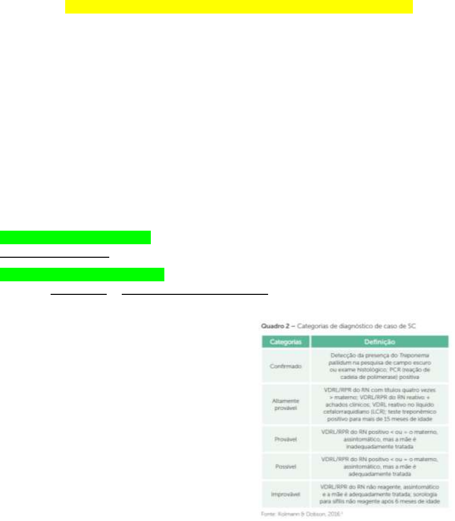 Natael Almeida Gonçalves – Interno de Medicina – UNEB SÍFILIS CONGÊNITA A sífilis congênita (SC) é o resultado da transmissão da espiroqueta do Treponema pallidum da corrente sanguínea da gestante infectada para o concepto por via transplacentária ou, ocasionalmente, por contato direto com a lesão no momento do parto (transmissão vertical). A transmissão vertical é passível de ocorrer em qualquer fase gestacional ou estágio da doença materna, mas as chances são menores até o quarto mês e aumentam em direção ao termo, já que o fluxo placentário aumenta progressivamente até o terceiro trimestre. Pode resultar em aborto, natimorto, prematuridade ou um amplo espectro de manifestações clínicas; apenas os casos muito graves são clinicamente aparentes ao nascimento. Avaliação Inicial A avaliação inicial da criança exposta à sífilis ou com sífilis congênita é realizada especialmente na maternidade/casa de parto, considerando os seguintes aspectos: Histórico materno de sífilis quanto ao tratamento e seguimento na gestação; Sinais e sintomas clínicos da criança (na maioria das vezes ausentes ou inespecíficos); Teste não treponêmico periférico da criança comparado com o da mãe. Não existe uma avaliação complementar que determine com precisão o diagnóstico da infecção na criança. Assim, esse diagnóstico exige uma combinação de avaliação clínica, epidemiológica e laboratorial. Recém-nascido exposto a sífilis: RN de mulher diagnosticada com sífilis durante pré-natal e adequadamente tratada Não notificar; realizar avaliação e manejo clínico Recém-nascido com sífilis congênita: RN de mulher diagnosticada com sífilis no pré-natal, parto ou puerpério, não tratada ou tratada de forma não adequada Notificar; realizar avaliação e manejo clínico Obs.: Tratamento adequado: tratamento completo para o respectivo estágio clínico da sífilis, com penicilina benzatina, iniciado até 30 dias antes do parto. As gestantes que não se enquadrarem nesse critério serão consideradas como tratadas de forma não adequada. Obs.: O histórico de tratamento e seguimento da sífilis na gestação devem estar documentados em prontuário médico ou na caderneta da gestante, não se recomenda considerar apenas a informação verbal. Para fins clínicos e assistenciais, alguns fatores são considerados para o tratamento adequado da GESTANTE com sífilis, como: Administração de penicilina benzatina; Início do tratamento até 30 dias antes do parto; Esquema terapêutico de acordo com o estágio clínico da infecção; Respeito ao intervalo recomendado entre as doses; Avaliação quanto ao risco de reinfecção; Natael Almeida Gonçalves – Interno de Medicina – UNEB Documentação de queda do título do teste não treponêmico em pelo menos duas diluições em três meses, ou de quatro diluições em seis meses após a conclusão do tratamento (ex: antes, 1:16; depois, menor ou igual a 1:4) – resposta imunológica adequada. Obs.: Gestantes infectadas após tratamento deverão realizar testes não treponêmicos MENSALMENTE Obs.:A lesão genital da sífilis primária é indolor e geralmente passa despercebida (sífilis primária). Após semanas ou meses, podem surgir lesões cutaneomucosas e, algumas vezes, manifestações sistêmicas (sífilis secundária). Em seguida, essas lesões desaparecem e inicia-se o estágio latente (sífilis terciária). *Testes Sorológicos De uma forma geral, a utilização de testes sorológicos permanece como sendo a principal forma de se estabelecer o diagnóstico da sífilis. São divididos em testes não- treponêmicos (VDRL, RPR) e treponêmicos (Teste rápido, TPHA, FTA-Abs, ELISA). Testes treponêmicos Detectam anticorpos específicos produzidos contra os antígenos do Treponema pallidum. São os primeiros a se tornarem reagentes. Importantes para o diagnóstico e monitoramento da resposta ao tratamento Não devem ser usados para avaliar a resposta ao tratamento, pois podem persistir positivos Permanecem reagentes por toda a vida, mesmo após a cura da infecção. Testes não treponêmicos Detectam anticorpos não específicos anticardiolipina, material lipídico liberado pelas células danificadas em decorrência da sífilis e possivelmente contra a cardiolipina liberada pelos treponemas. Não são indicados para monitoramento da resposta ao tratamento Pode ser reagente por longos períodos, mesmo após a cura da infecção, porém apresenta queda progressiva nas titulações até que se torna não reagente. Obs.: Um teste não treponêmico positivo no RN não indica necessariamente infecção congênita, uma vez que a IgG materna ultrapassa a placenta (IgM não atravessa). Devemos suspeitar dessa condição sempre que o título de anticorpo encontrado no RN for igual ou inferior ao da mãe. Obs.: O Ministério da Saúde preconiza o VDRL no 1º trimestre de gravidez, no início do 3º trimestre (28ª semana) e repetido na admissão para trabalho de parto ou aborto. Na presença de VDRL reagente, recomenda-se a realização de teste treponêmico confirmatório, e na sua ausência, considera-se um caso de risco para sífilis congênita qualquer titulação de VDRL materno para gestantes não tratadas ou tratadas inadequadamente. Obs.: Os títulos de VDRL podem ajudar na interpretação. Geralmente são elevados nas infecções recentes, (>1:16, >1:32), apesar de poderem ser menores ou até negativos nas infecções maternas muito recentes. Nas infecções latentes ou anteriormente tratadas, os títulos são usualmente menores (<1:8) e estáveis com o passar do tempo. Natael Almeida Gonçalves – Interno de Medicina – UNEB Obs.: Títulos de anticorpos no RN quatro vezes maiores que os valores da mãe (ou duas diluições maiores) sugerem que o RN esteja produzindo anticorpos e, portanto, esteja infectado. Exame Físico da Criança Exposta à Sífilis Na criança exposta à sífilis, para exclusão d