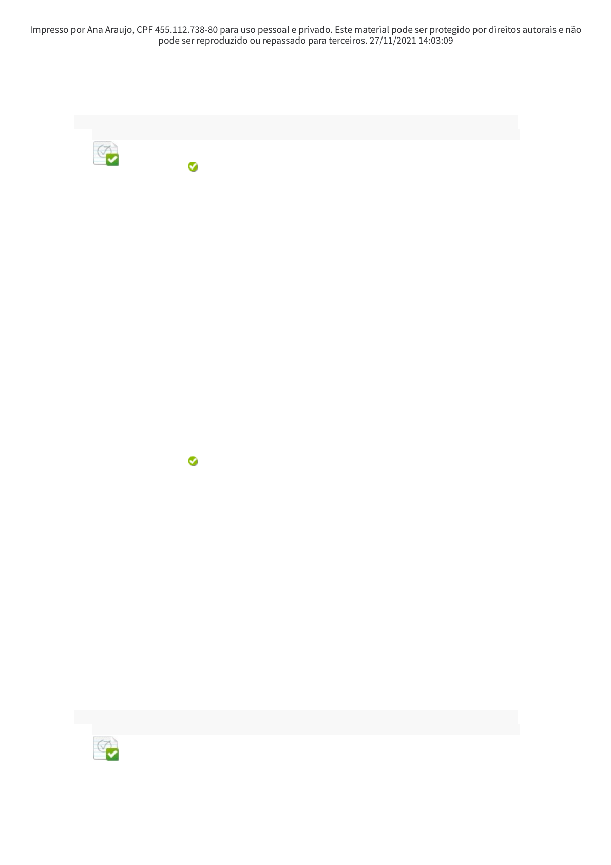 Impresso por Ana Araujo, CPF 455.112.738-80 para uso pessoal e privado. Este material pode ser protegido por direitos autorais e não pode ser reproduzido ou repassado para terceiros. 27/11/2021 14:03:09 Pergunta 1 0,5 em 0,5 pontos A respeito dos métodos de pesquisa, assinale a alternativa correta. Resposta Selecionad a: e. A escolha das técnicas de coleta e análise de dados deve ser realizada levando-se em consideração o objetivo da pesquisa e os recursos — materiais, temporais e pessoais – disponíveis para o pesquisador. Respostas: a. As técnicas (qualitativas e quantitativas) de coleta de dados são excludentes, não podendo ser utilizadas em uma mesma pesquisa. b. A pesquisa realizada com métodos quantitativos resulta em informações com maior nível de certeza e precisão. c. Os resultados obtidos na pesquisa quantitativa independem da interpretação do pesquisador, já que são precisos e mensuráveis. d. A generalização dos resultados não ocorre nas pesquisas qualitativas, tampouco nas quantitativas. e. A escolha das técnicas de coleta e análise de dados deve ser realizada levando-se em consideração o objetivo da pesquisa e os recursos — materiais, temporais e pessoais – disponíveis para o pesquisador. Feedbac k da resposta : Resposta: E. Comentário: As técnicas qualitativas e quantitativas podem ser usadas de forma combinada. Os resultados da pesquisa quantitativa não necessariamente são mais precisos e certos do que os da pesquisa qualitativa: eles são apenas de natureza distinta, e estão sujeitos a várias interpretações em função do olhar do pesquisador. Finalmente, as pesquisas quantitativas, quando realizadas dentro do rigor estatístico, podem ter seus resultados projetados para a população como um todo. O pesquisador escolhe técnicas em função dos seus objetivos e das condições que tem diante de si para a realização da pesquisa. Pergunta 2 0,5 em 0,5 pontos É uma das etapas do processo de trabalho científico em pesquisa qualitativa: I - A análise quantitativa dos resultados obtidos, confirmando ou não as hipóteses definidas e confrontado os resultados com os conceitos Rectangle Impresso por Ana Araujo, CPF 455.112.738-80 para uso pessoal e privado. Este material pode ser protegido por direitos autorais e não pode ser reproduzido ou repassado para terceiros. 27/11/2021 14:03:09 teóricos. II - A busca pela objetividade por meio de uma lógica formal e neutralidade no processo de investigação. III - A metodologia da validação por meio de processos dedutivos matemáticos. Está incorreto o que se afirma em: Resposta Selecionada: d. I, II e III. Respostas: a. I e II, apenas. b. II e III, apenas. c. I, apenas. d. I, II e III. e. III, apenas. Feedback da resposta: Resposta: D. Comentário: A pesquisa qualitativa não envolve análise quantitativa dos resultados obtidos, tampouco a busca pela objetividade por meio da lógica formal ou validação por meio de processos dedutivos matemáticos. Pergunta 3 0,5 em 0,5 pontos Analise as afirmativas abaixo em relação à elaboração de um relatório técnico: I - Um relatório de pesquisa é a exposição escrita na qual se descrevem fatos verificados mediante a investigação e a análise dos dados coletados. II - De um modo geral, podemos dizer que os relatórios são escritos com os objetivos de divulgar os dados técnicos obtidos e analisados, bem como de registrá-los em caráter permanente, disseminando-os entre a comunidade acadêmica e a não acadêmica. III - O relatório é um documento original e inédito, pelo qual se faz a difusão da informação corrente. É elaborado, principalmente, para registrar oposição de ideias em relação a pesquisas já realizadas. Em relação às afirmativas: Resposta Selecionada: a. São corretas apenas as afirmativas I e II. Respostas: a. São corretas apenas as afirmativas I e II. Rectangle Impresso por Ana Araujo, CPF 455.112.738-80 para uso pessoal e privado. Este material pode ser protegido por direitos autorais e não pode ser reproduzido ou repassado para terceiros. 27/11/2021 14:03:09 b. É correta apenas a afirmativa II. c. São corretas apenas as afirmativas II e III. d. É correta apenas a afirmativa III. e. São corretas as afirmativas I, II e III. Feedbac k da resposta: Resposta: A. Comentário: O relatório de uma pesquisa não tem como objetivo o de registrar oposição ou discordância em relação a pesquisas já realizadas. Seu principal propósito é divulgar, junto às comunidades acadêmicas e não acadêmicas, os resultados de uma investigação. Pergunta 4 0,5 em 0,5 pontos Com relação aos instrumentos qualitativos e quantitativos de pesquisa, assinale a alternativa correta. Resposta Selecionada : d. Grupo focal e observação participante caracterizam-se como exemplos de instrumentos qualitativos. Respostas: a. O mérito quantitativo da pesquisa traz consigo uma gama de metodologias dentre as quais destacam-se o uso de estatísticas, entrevistas semiestruturadas e etnografia. b. A análise do discurso e de aspectos subjetivos dos indivíduos é o foco dos instrumentos quantitativos. c. A abordagem qualitativa está direcionada à uma análise objetiva dos fenômenos sociais, em um trabalho de interpretação da realidade mediante o uso de dados numéricos. d. Grupo focal e observação participante caracterizam-se como exemplos de instrumentos qualitativos. e. O uso de questionários com perguntas de respostas múltiplas – em particular, com o uso de escalas – descaracteriza e inviabiliza a construção de uma análise quantitativa. Feedbac k da Resposta: D. Comentário: As entrevistas semiestruturadas e a etnografia Rectangle Impresso por Ana Araujo, CPF 455.112.738-80 para uso pessoal e privado. Este material pode ser protegido por direitos autorais e não pode ser reproduzido ou repassado para terceiros. 27/11/2021 14:03:09 resposta : fazem parte do arsenal de técnicas da pesquisa qualitativa, tal co