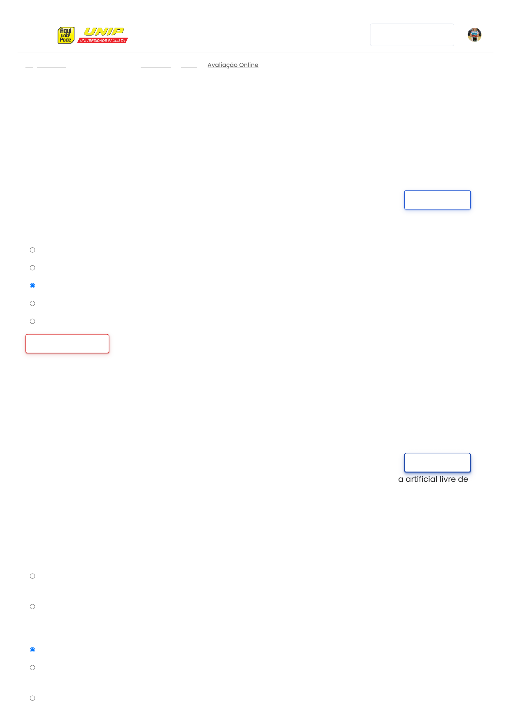 09/12/2020 Avaliação Online www.unipvirtual.com.br/avaunip/mod/quiz/attempt.php?attempt=4137276&cmid=63651 1/5 - Minhas disciplinas - - - Bibliotecas Virtuais Página inicial SU-P0049 Geral Avaliação Online Na palpação obstétrica o enfermeiro deve seguir a seguinte sequência: Escolha uma: a. Escava, pequenas partes e fundo uterino. b. Dorso, fundo uterino, pequenas partes e mobilidade cefálica. c. Fundo, dorso, mobilidade cefálica e escava. d. Escava, dorso e fundo uterino. e. Escava, dorso, fundo uterino e movimentação fetal. Limpar minha escolha A aspiração da traqueostomia é um dos cuidados realizados para a manutenção da via aérea artificial livre de obstrução por secreções acumuladas. A aspiração traqueal não está livre de complicações, entre elas a hipóxia e a irritação e lesão dos tecidos traqueais. Assinale a alternativa incorreta sobre um cuidado para prevenir hipóxia que deve ser adotado durante o procedimento de aspiração da traqueostomia. Escolha uma: a. Selecionar o tamanho do cateter de aspiração que deve ter metade do diâmetro do tubo traqueal. Se o cateter for muito grande, ele pode bloquear as vias aéreas durante a aspiração, aumentado a hipóxia. b. Aumentar o nível de oxigênio circulante. Introduzir a sonda com a porta lateral aberta e fechá-la para realizar a aspiração, retirando-a em movimentos circulatórios e um tempo de 5 segundos. Reduzir o tempo de hipóxia. c. A aspiração deve ser realizada em horários predeterminados. d. Se for muito pequeno, o tempo total do procedimento será maior e a criança será submetida a maior tempo de hipóxia. e. Oferecer oxigênio (100% FiO2) antes ou depois de cada aspiração usando máscara com bolsa de reserva de Remover rótulo Questão 1 Ainda não respondida Vale 1,00 ponto(s). Remover rótulo Questão 2 Ainda não respondida Vale 1,00 ponto(s). http://www.unipvirtual.com.br/avaunip http://www.unipvirtual.com.br/avaunip/ http://www.unipvirtual.com.br/avaunip/course/view.php?id=1539 http://www.unipvirtual.com.br/avaunip/course/view.php?id=1539#section-0 http://www.unipvirtual.com.br/avaunip/mod/quiz/view.php?id=63651 http://www.unipvirtual.com.br/avaunip/mod/quiz/attempt.php?attempt=4137276&cmid=63651 09/12/2020 Avaliação Online www.unipvirtual.com.br/avaunip/mod/quiz/attempt.php?attempt=4137276&cmid=63651 2/5 oxigênio ou ajustando a fração inspirada de oxigênio do ventilador. Limpar minha escolha Com relação aos procedimentos desenvolvidos pelos Enfermeiros na atenção integral à mulher, são considerados corretos, exceto: Coleta de material para citologia oncótica deve ser realizada na ectocérvice e endocérvice. Escolha uma: a. Nenhuma das alternativas anteriores. b. Em mulheres histerectomizadas que comparecem para coleta citológica, deve ser obtido um esfregaço do fundo do saco vaginal. c. A detecção precoce do câncer de mama é essencial na evolução satisfatória do tratamento. d. Na palpação do tecido mamário, procura-se manter a mulher sentada, observando-se a simetria e retrações das mamas. e. A sequência para o exame físico das mamas deve seguir a seguinte sequência: 1) inspeção estática, 2) inspeção dinâmica, 3) palpação das axilas e regiões supraclaviculares e 4) palpação do tecido mamário. Limpar minha escolha Conceitua-se como necessidade hídrica de manutenção “o volume de água necessário para repor a perda de líquido obrigatória, como as que ocorrem na sudorese, na respiração, na formação de urina e de fezes”. A necessidade de líquidos diários para crianças pode ser estimada considerando seu peso corporal. Calcule a necessidade de líquidos diária para uma criança que pesa 19Kg. Escolha uma: a. 1450 ml/dia b. 1900 ml/dia c. 1180 ml/dia d. 725 ml/dia e. 2000 ml/dia Limpar minha escolha Remover rótulo Questão 3 Ainda não respondida Vale 1,00 ponto(s). Remover rótulo Questão 4 Ainda não respondida Vale 1,00 ponto(s). http://www.unipvirtual.com.br/avaunip/mod/quiz/attempt.php?attempt=4137276&cmid=63651 http://www.unipvirtual.com.br/avaunip/mod/quiz/attempt.php?attempt=4137276&cmid=63651 http://www.unipvirtual.com.br/avaunip/mod/quiz/attempt.php?attempt=4137276&cmid=63651 09/12/2020 Avaliação Online www.unipvirtual.com.br/avaunip/mod/quiz/attempt.php?attempt=4137276&cmid=63651 3/5 A Avaliação do Crescimento e Desenvolvimento da Criança indica suas condições de saúde e de vida, visa à promoção e manutenção de sua saúde e a intervenção sobre fatores de risco e deve ser realizada periodicamente e continuamente. Para verificar o comprimento de uma criança de cinco meses devemos utiliza que tipo de instrumento? Escolha uma: a. Fita métrica. b. Balança com régua vertical. c. Régua de parede. d. Balança digital até 10 kg. e. Antropômetro. Limpar minha escolha As funções de umidificação e aquecimento do ar inspirado estão comprometidos na criança traqueostomizada e, consequentemente as secreções podem se tornar espessas, com tendência a formação de rolhas de muco e risco de obstrução da cânula. Considerando os cuidados com a umidificação das vias aéreas, leia as afirmativas abaixo e responda. I. A melhor estratégia para manter a via aérea hidratada é uma boa ingesta hídrica. II. Equipamentos como nebulizadores e inaladores também são indicados para manter a umidade das vias aéreas. III. A instilação de solução salina durante a aspiração traqueal deve ser utilizada para fluidificar as secreções traqueais e favorecer a sua remoção. Está(ão) correta(s) a(s) afirmativa(s): Escolha uma: a. II b. I e II c. I, II e III d. III e. I Remover rótulo Questão 5 Ainda não respondida Vale 1,00 ponto(s). Remover rótulo Questão 6 Ainda não respondida Vale 1,00 ponto(s). http://www.unipvirtual.com.br/avaunip/mod/quiz/attempt.php?attempt=4137276&cmid=63651 09/12/2020 Avaliação Online www.unipvirtual.com.br/avaunip/mod/quiz/attempt.php?attempt=4137276&cmid=63651 4